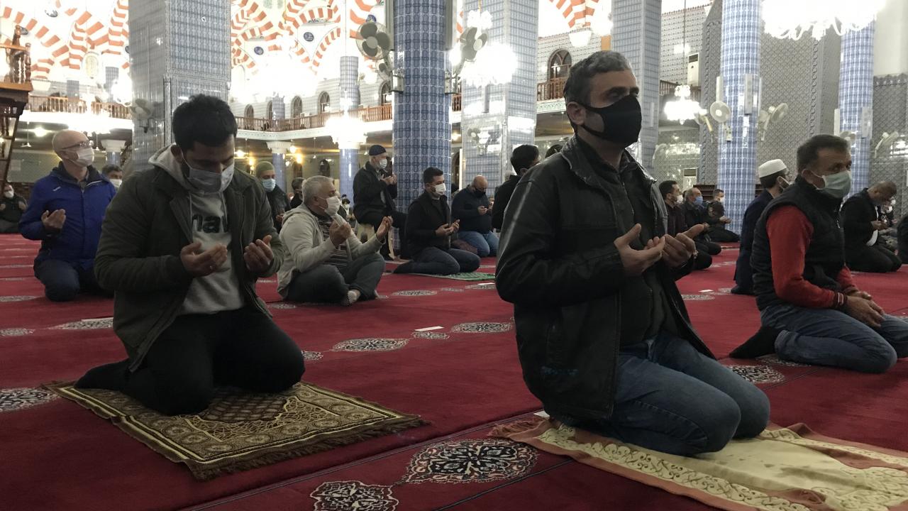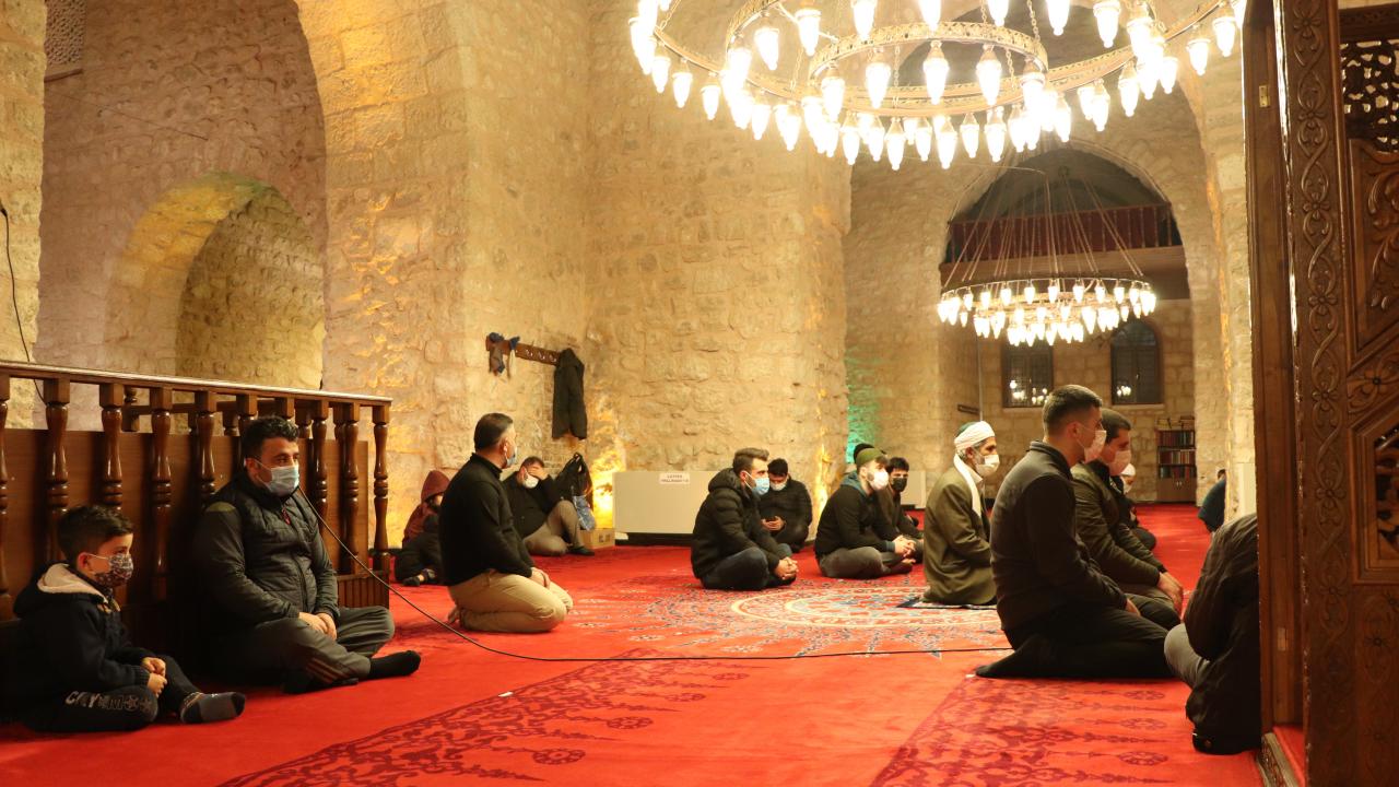 Kilis`te Berat Kandili dolayısıyla camilerde program düzenlendi. Cemaat koronavirüs tedbirlerine uyarak dualar edip namaz kıldı.