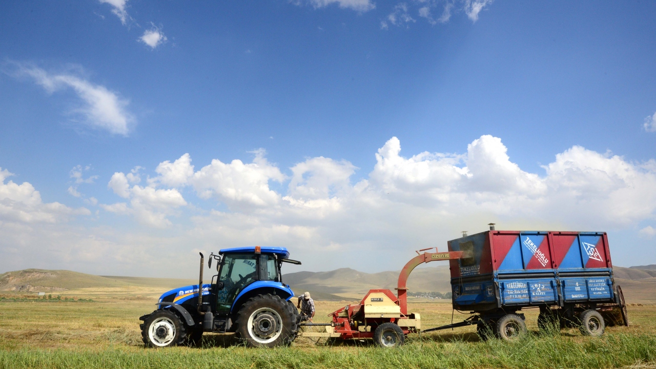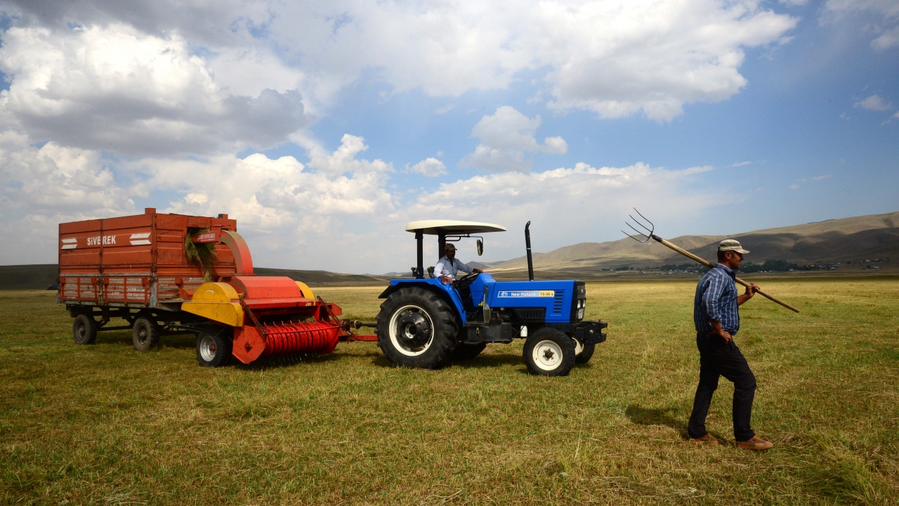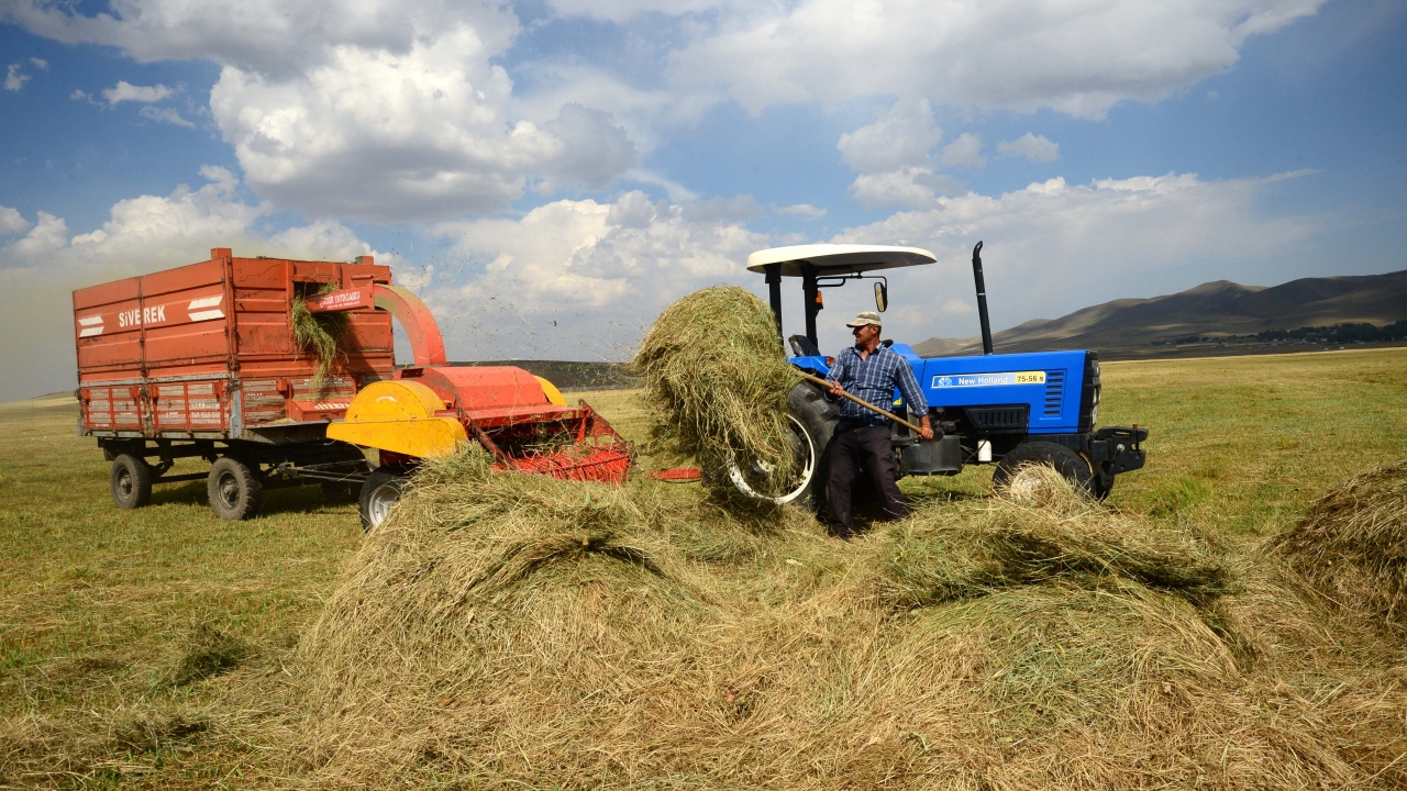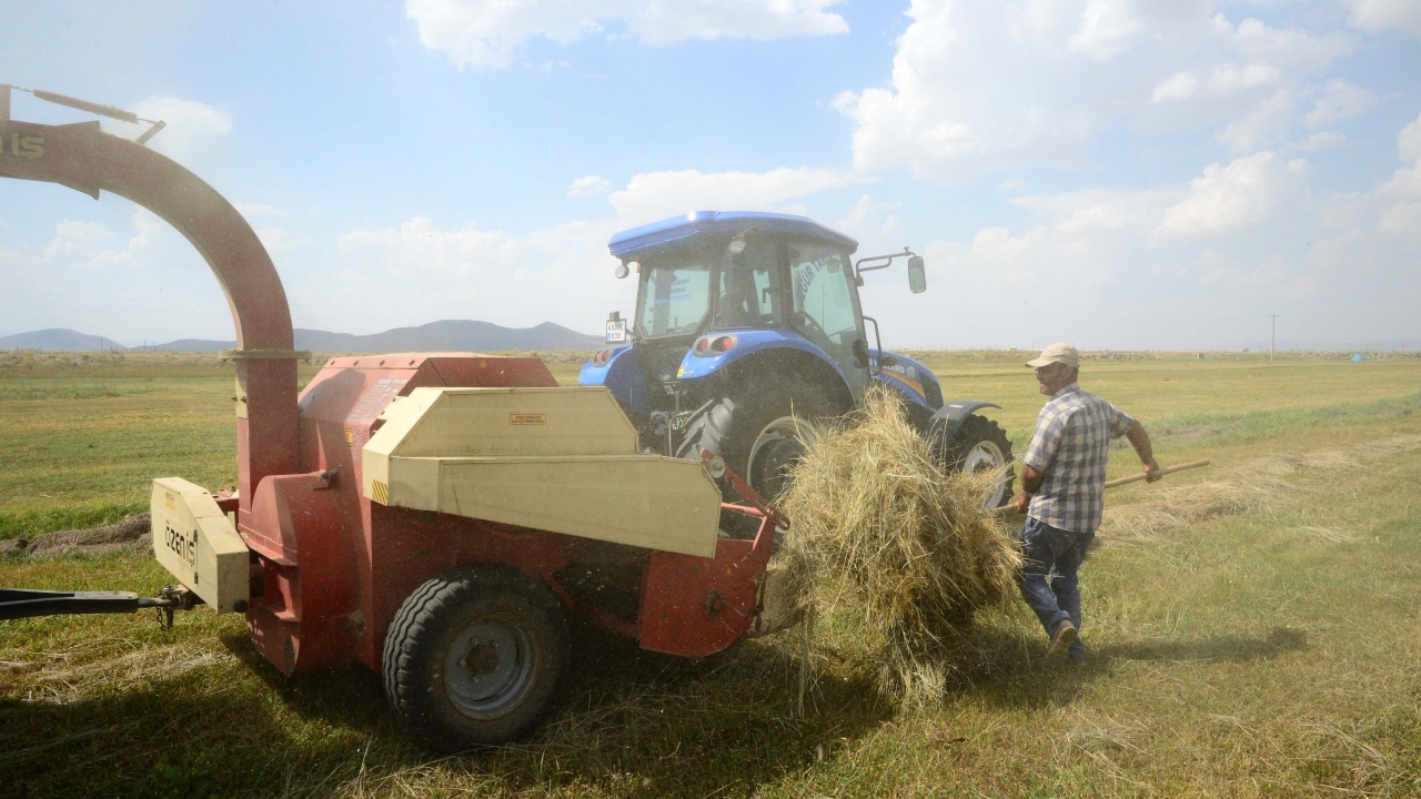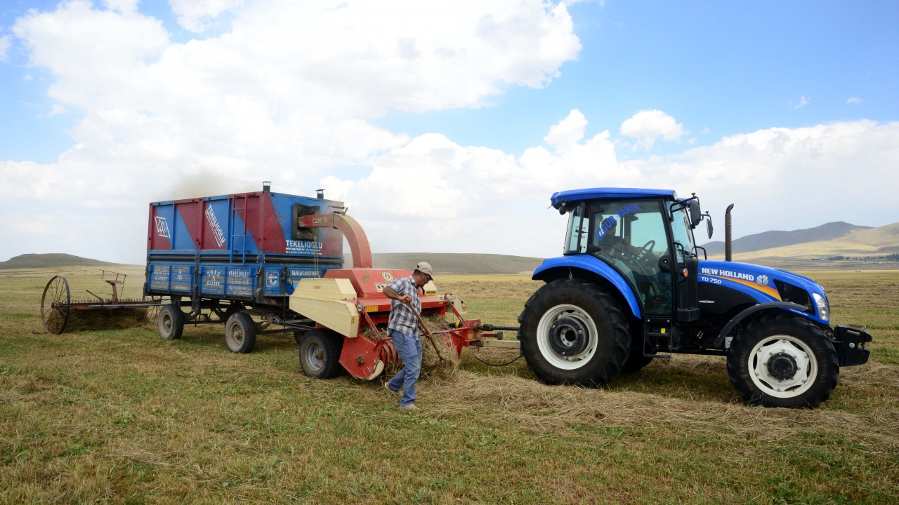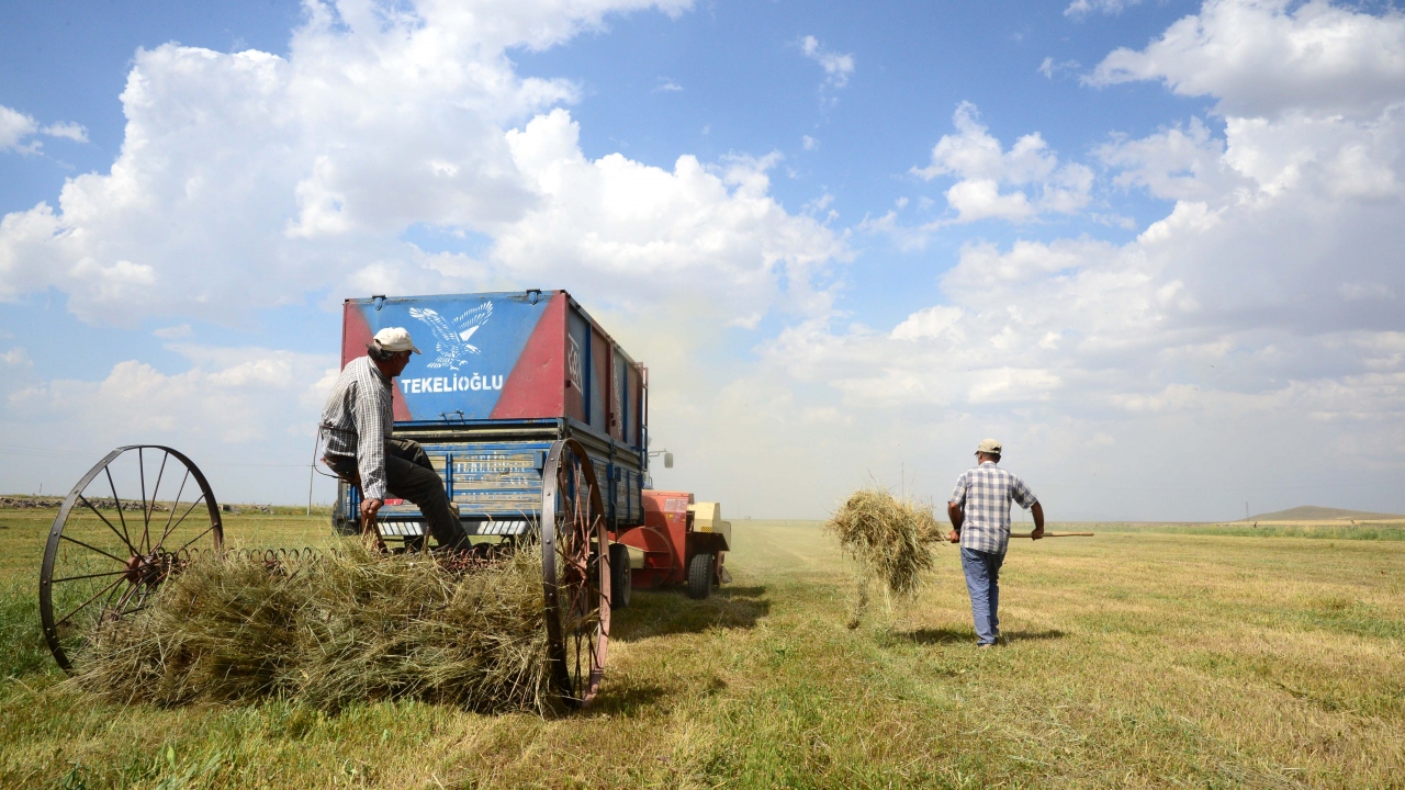 Sıcak havaya rağmen biçtikleri otları tarlada toplayan besiciler, ellerindeki dirgenle otları traktöre bağlı harman makinesine atarak samana dönüştürüyor.