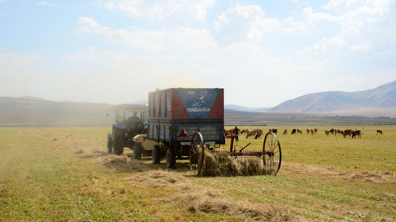 Tek geçim kaynakları hayvancılık olan, toz ve sıcak hava demeden çalışan besiciler, akşama kadar çalışarak elde ettikleri samanı traktörlerle tarladan köye taşıyor.