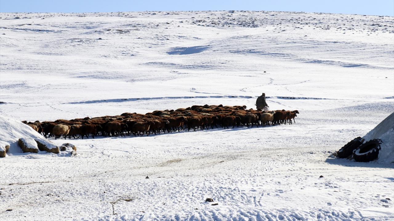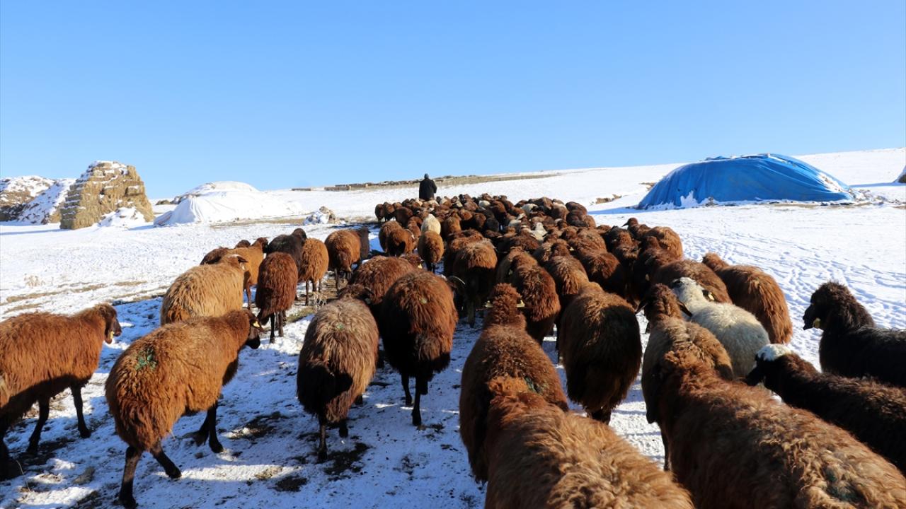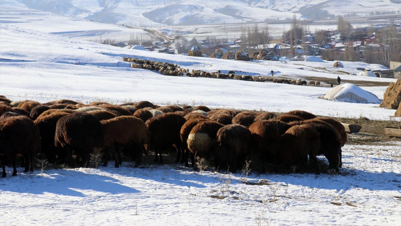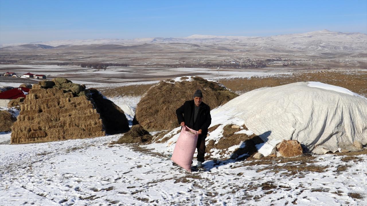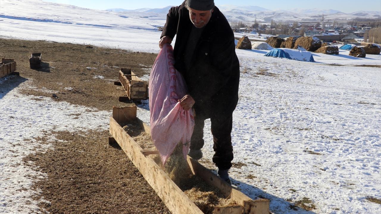 Hava sıcaklığının sıfırın altında seyrettiği bölgede soğuk havada saatlerce başında bekledikleri hayvanlarını besleyen çiftçiler, akşama doğru da ahırlara götürüyor.