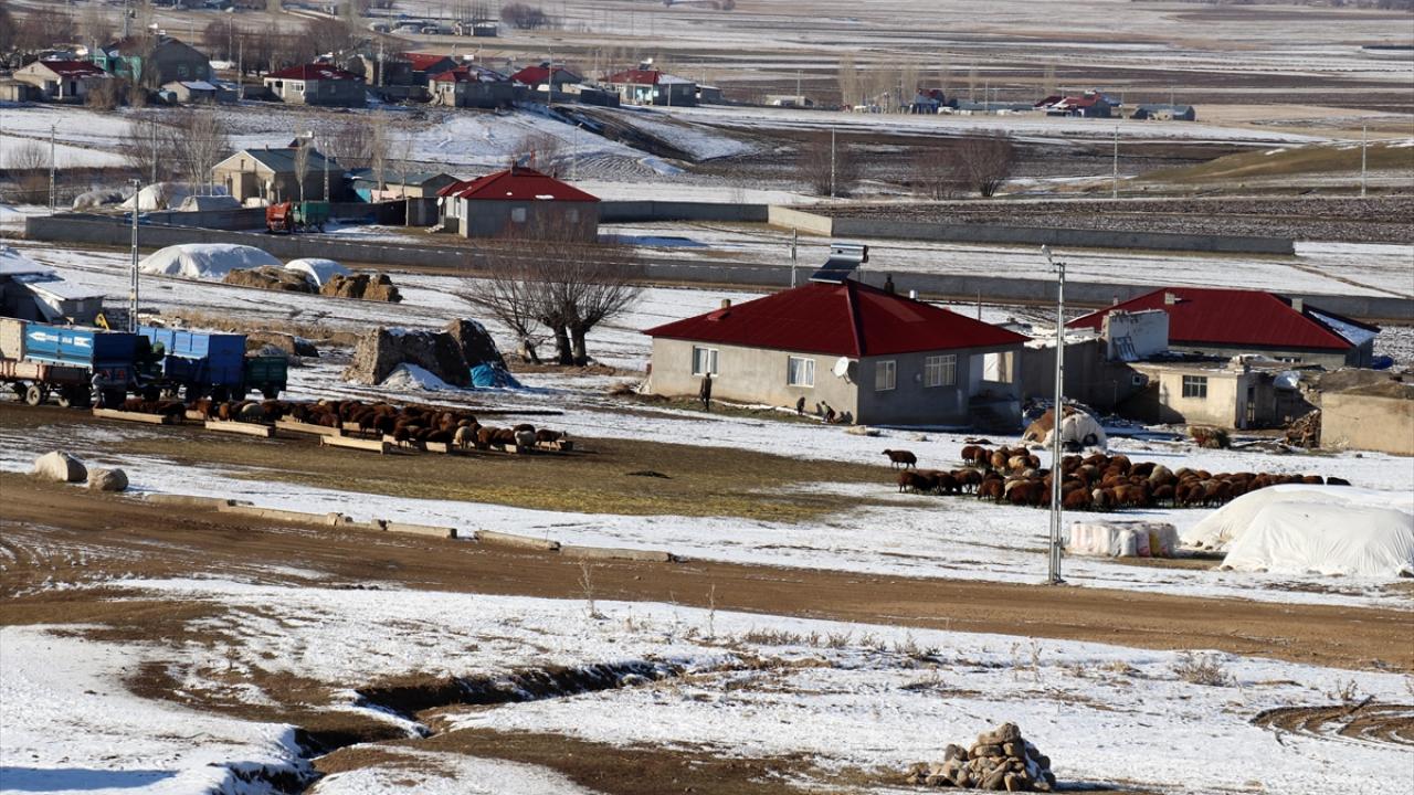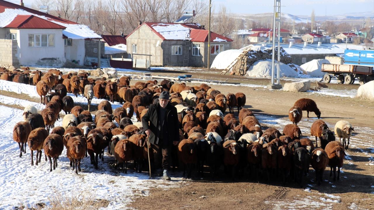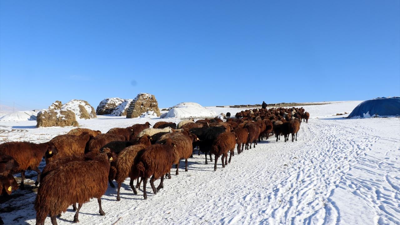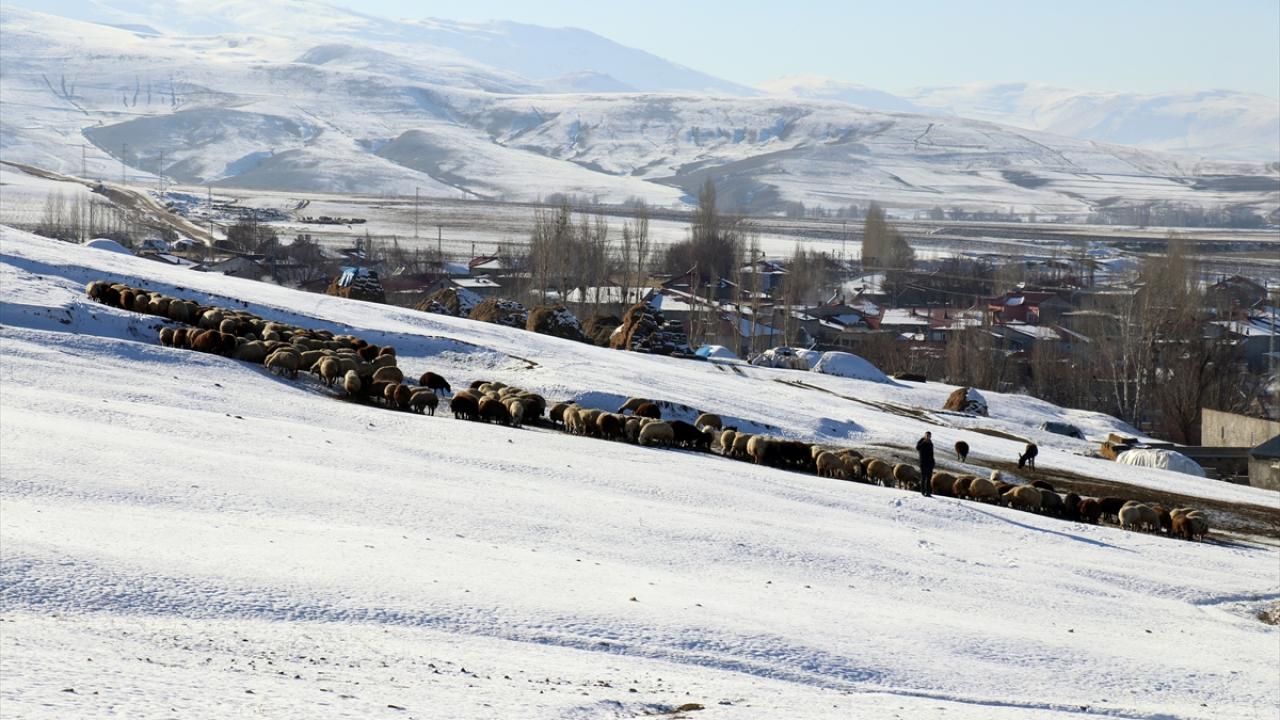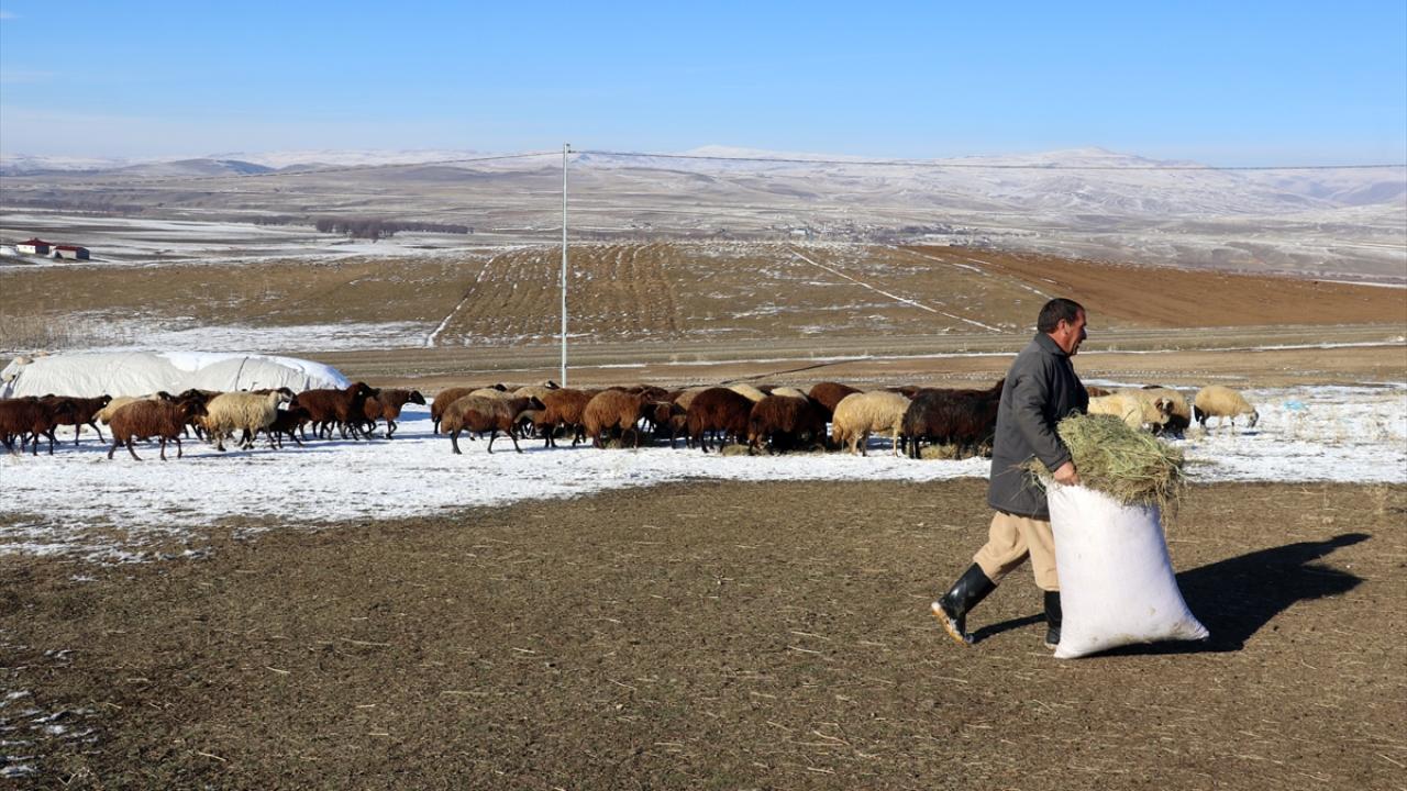 Hava sıcaklığının sıfırın altında seyrettiği bölgede soğuk havada saatlerce başında bekledikleri hayvanlarını besleyen çiftçiler, akşama doğru da ahırlara götürüyor.