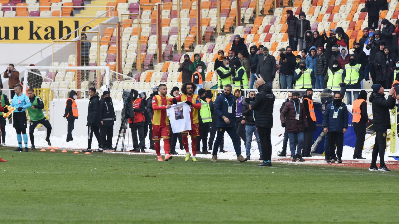 Müsabakanın 6. dakikasında trafik kazasında hayatını kaybeden İttifak Holding Konyaspor`lu Ahmet Çalık için tribünlerden, "Ahmet ölmedi, kalbimizde yaşıyor" tezahüratı yapıldı.