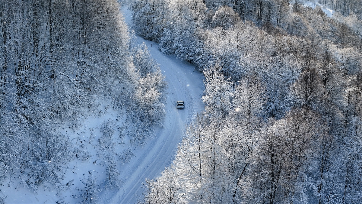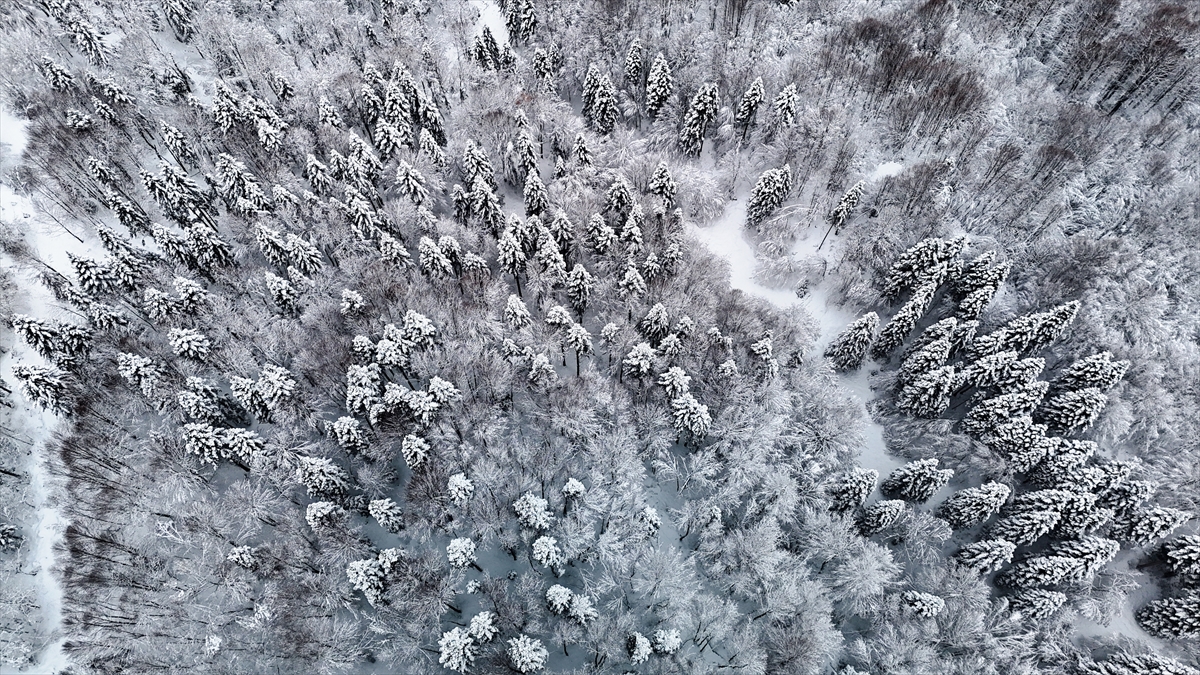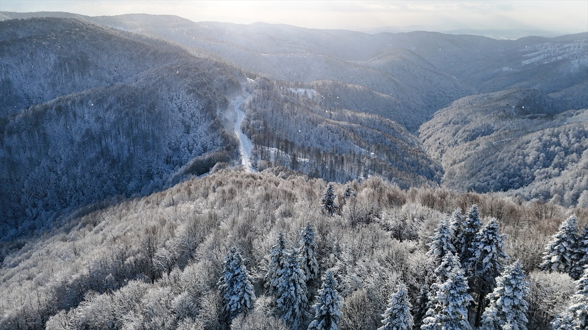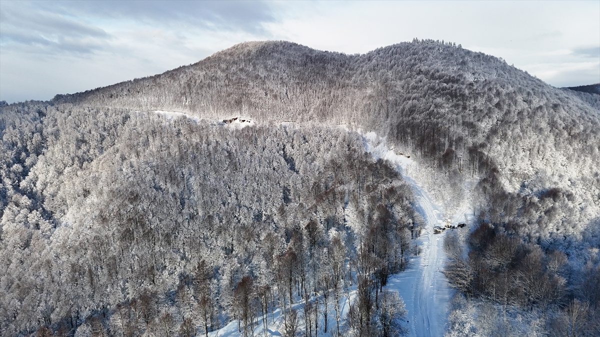 Çam, kestane, akasya, köknar ve gürgen ağaçlarının arasında yolculuk imkanı sunan Çam Dağı`ndaki beyaz örtü havadan görüntülendi.