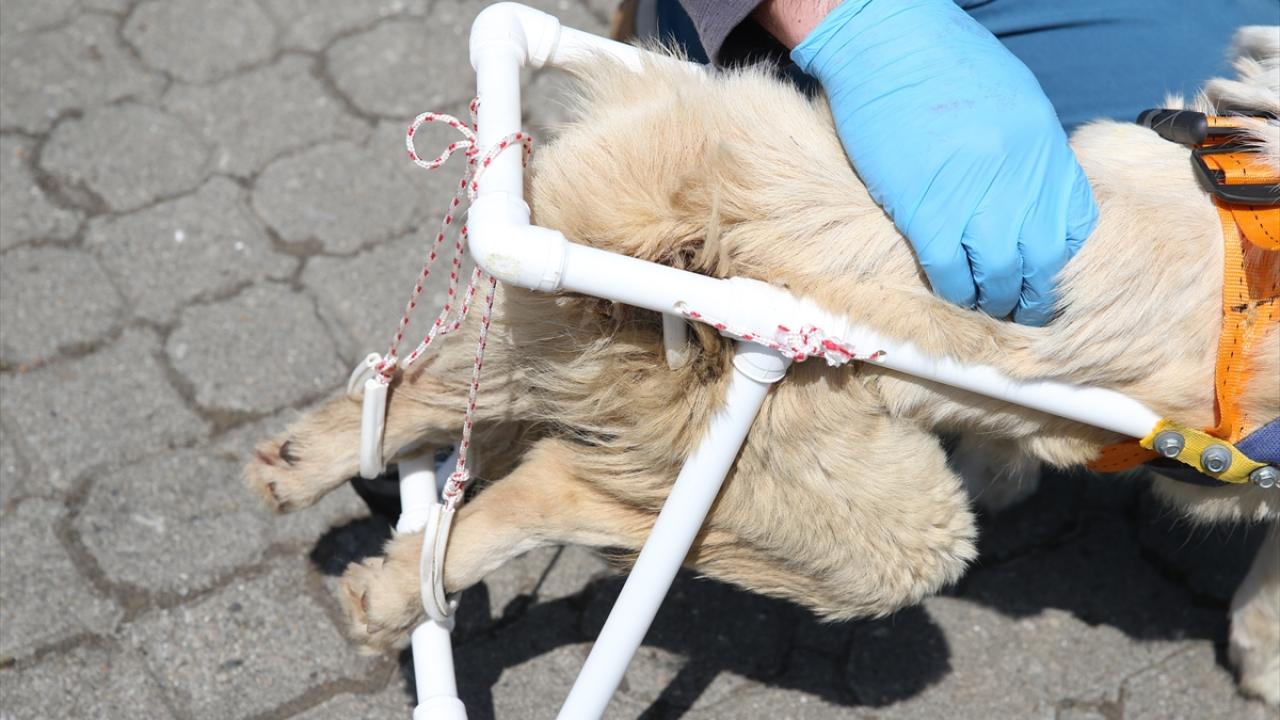 "Bisikletlerin yan tekerlerinden yapabiliriz diye düşündük, yapabileceğimiz en iyi malzeme plastik su boruları. Belediyenin ilgili birimlerinden rica ettik, malzemeleri temin ettik. Köpeğin arka ayağını koyduğu yere yumuşak malzeme olarak cam fitili kullandık. Kayış, göğüs bağlama aparatıydı, bunları temin ettikten sonra birleştirdik. Mükemmel bir aparat olmadı ama en azından yürümesini sağladı."