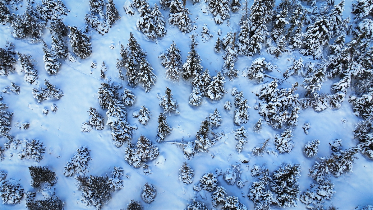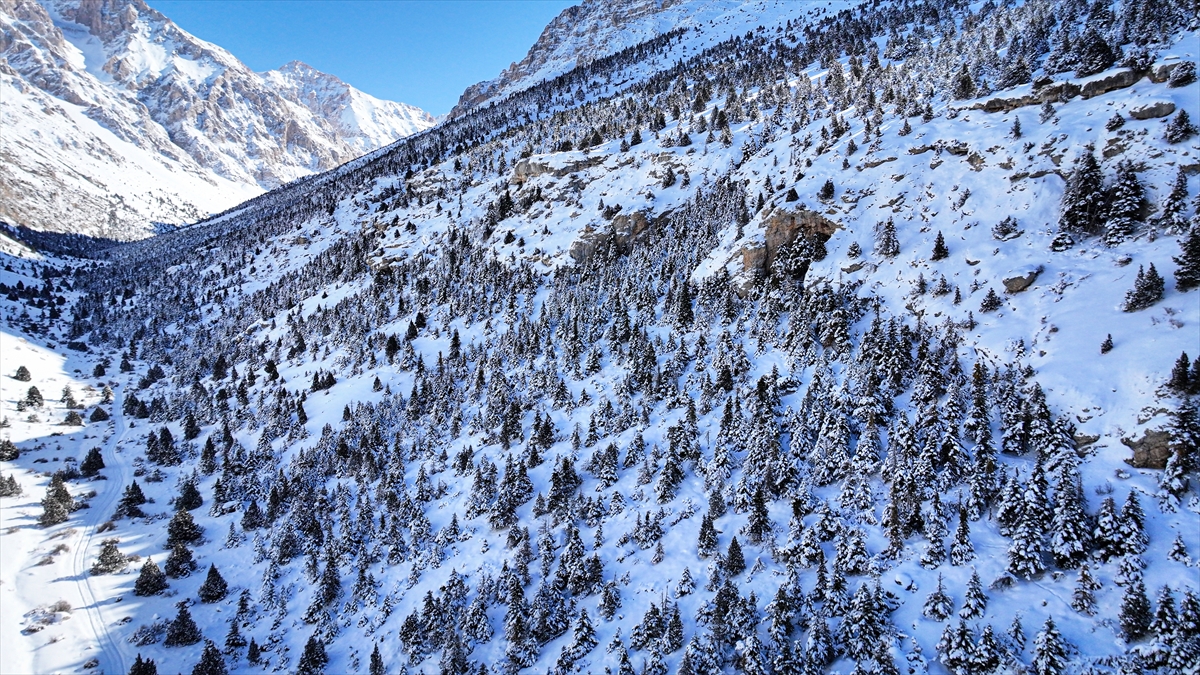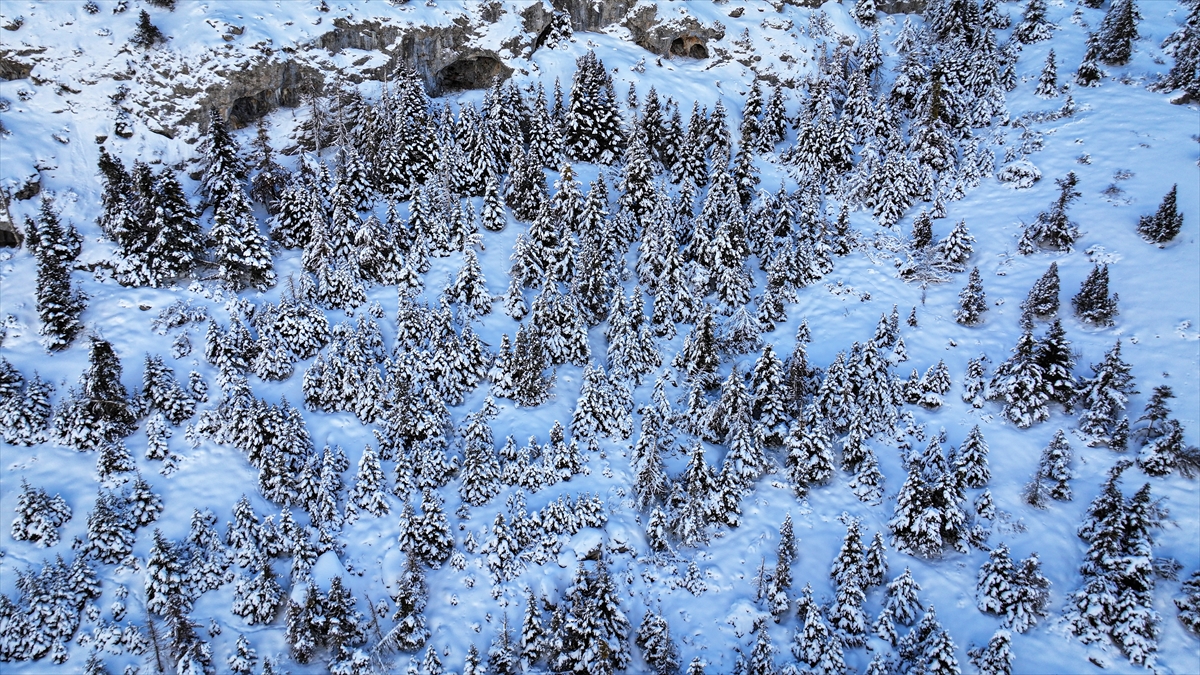 Kar yağışının etkili olduğu Aladağlar Milli Parkı`nda ormanlık alanlar beyaz örtüyle kaplandı.