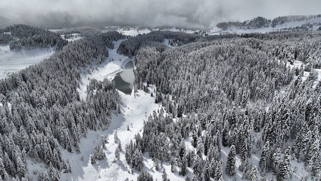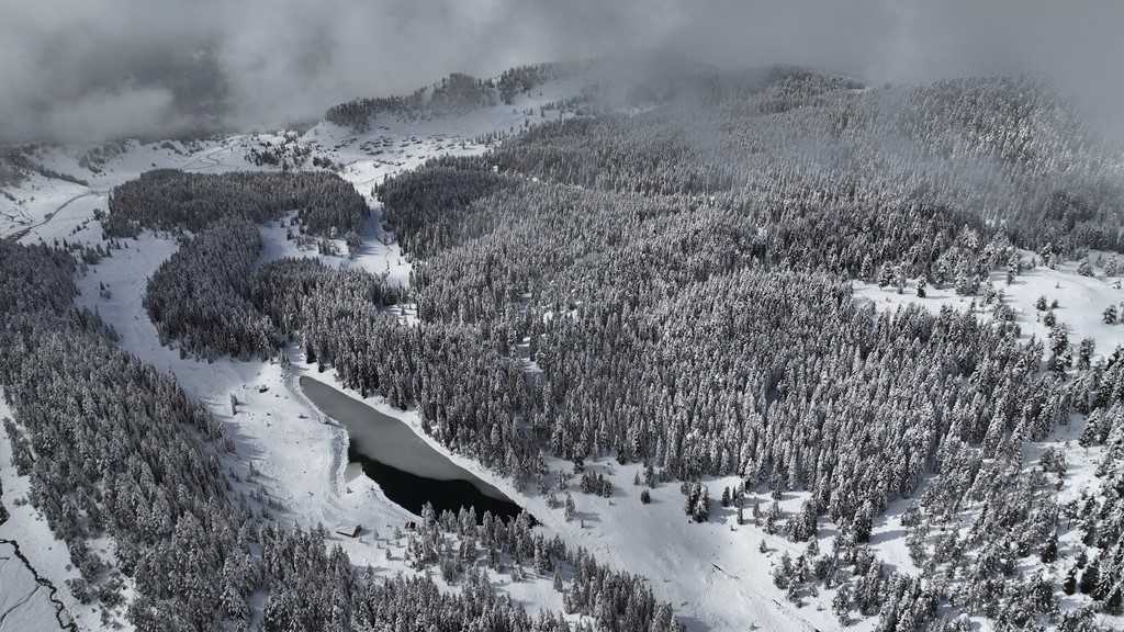 Artvin`in ‘Sakin Şehir` (Cittaslow) unvanlı Şavşat ilçesinde kuş bakışı görünümü nedeniyle `Balık Gölü` olarak anılan göl, geçtiğimiz günlerde etkili olan kar yağışı ile beyaza büründü.
