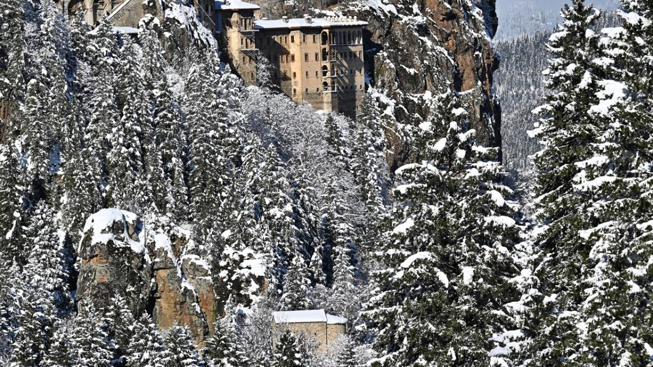 Karadağ`ın Altındere Vadisi`ne bakan eteğinde, vadiden yaklaşık 300 metre yükseklikteki ormanlık alanda kayaların oyulmasıyla yapılan ve halk arasında "Meryem Ana" adıyla bilinen Sümela Manastırı, kar yağışıyla beyaza büründü.