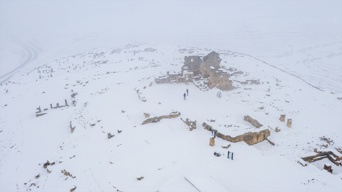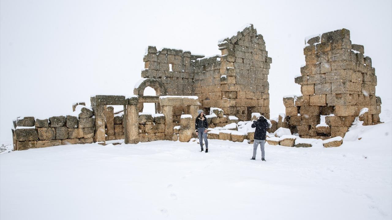 Diyarbakır'ın Çınar ilçesindeki 3 bin yıllık Zerzevan Kalesi, kar yağışının ardından beyaza büründü.