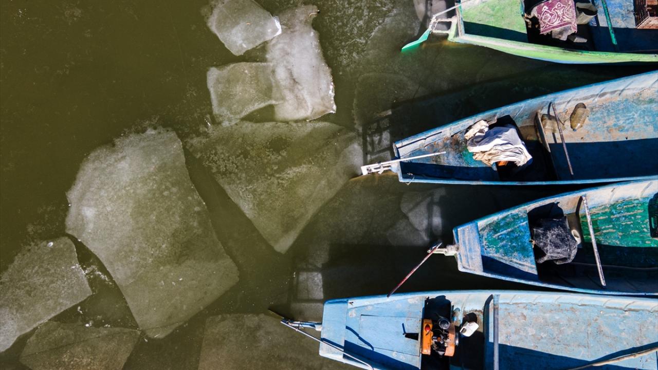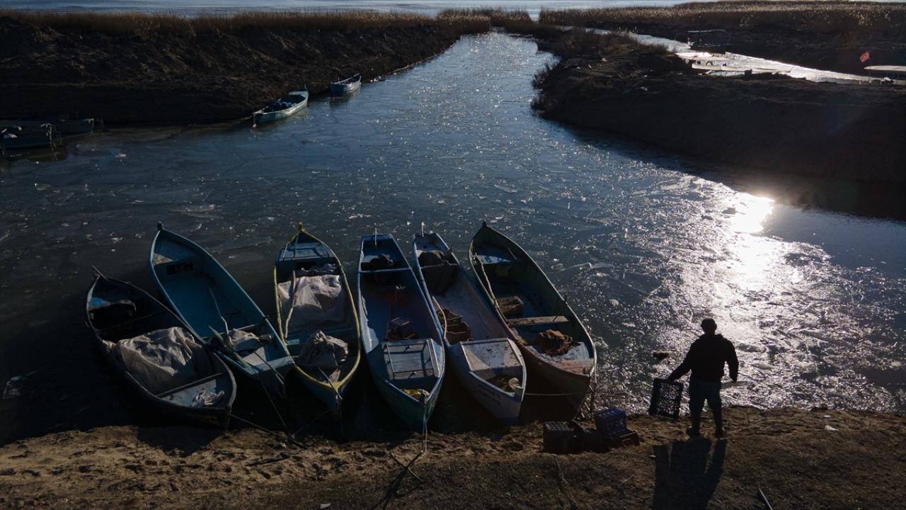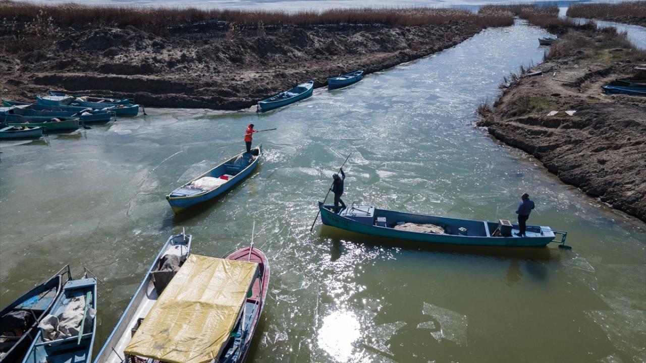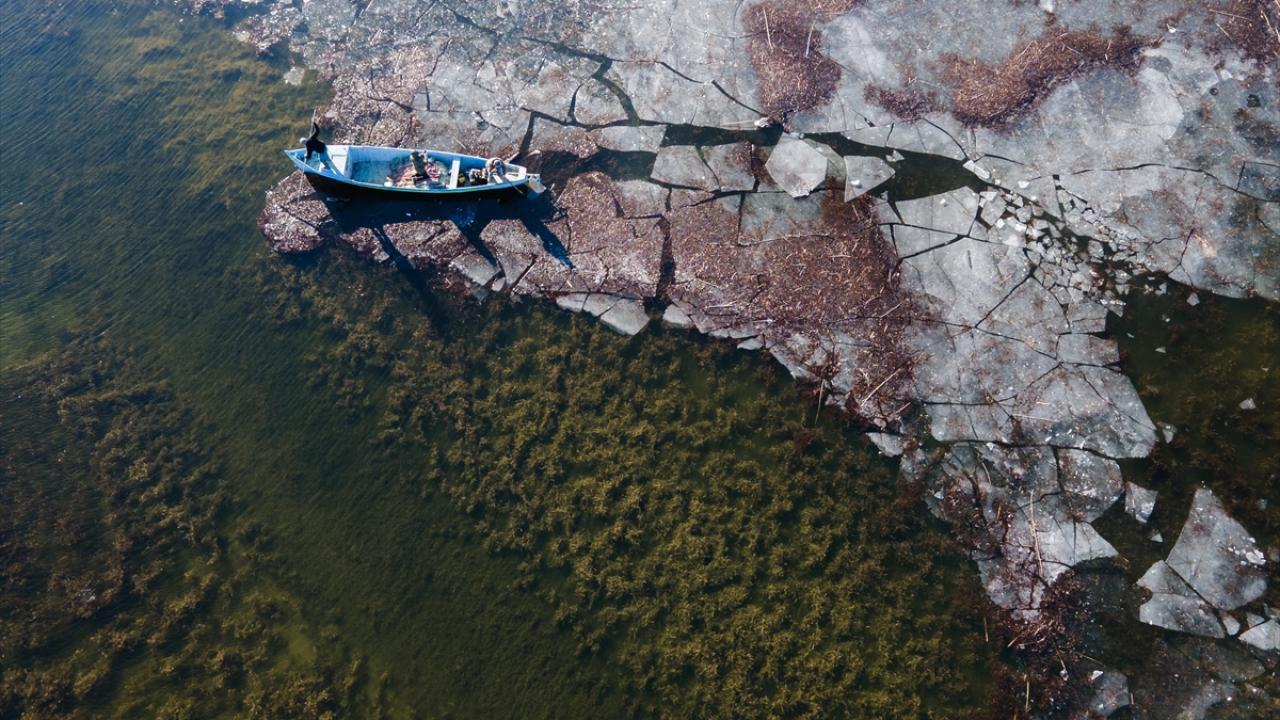 Konya’nın Beyşehir İlçesinde, soğuk havanın etkisiyle kıyı kesimleri donan Beyşehir Gölü’nde balıkçılar, avlanabilmek için buzların erimesini bekliyor.