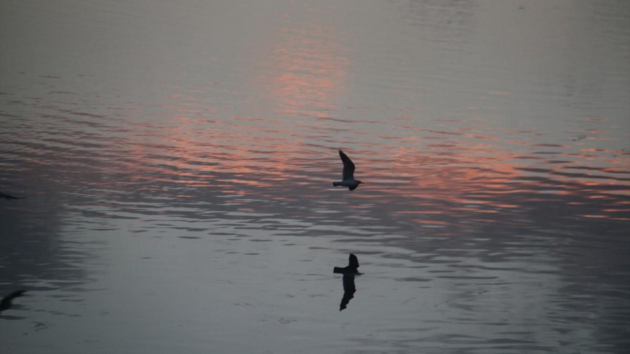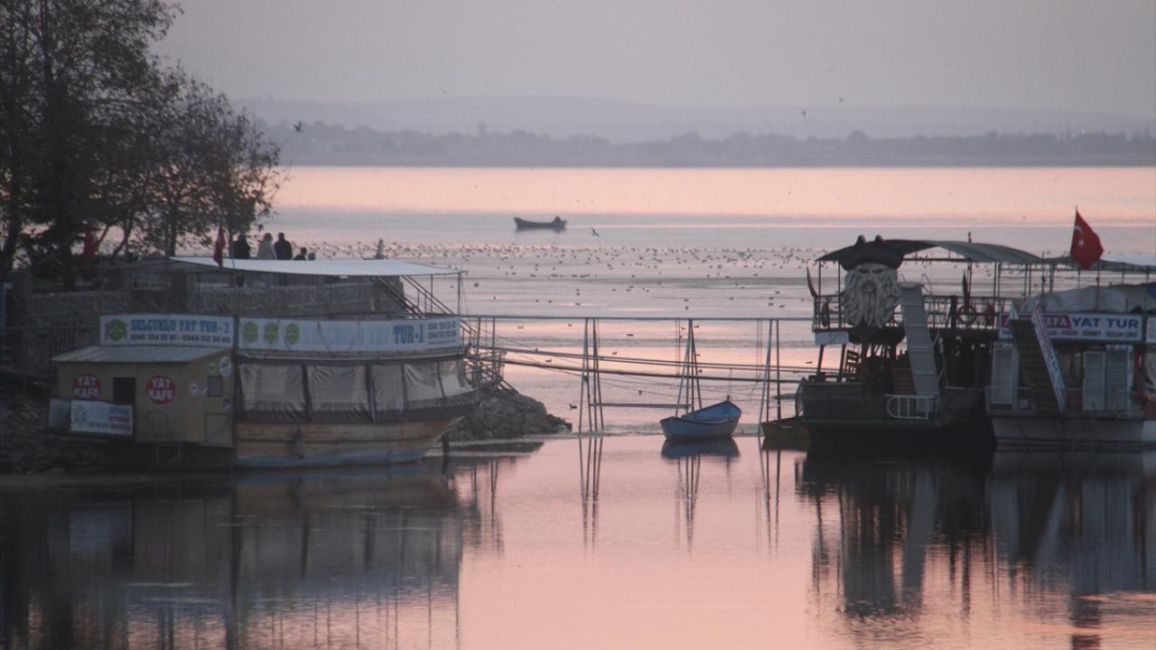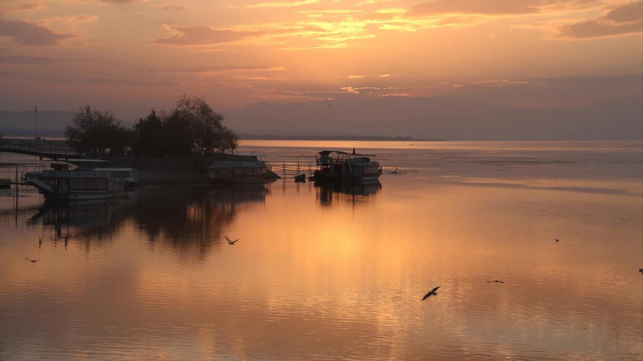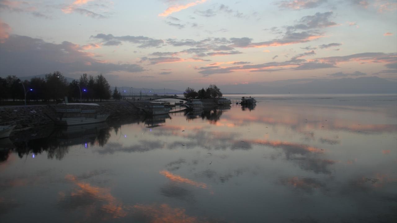 Güneşin battığı anlarda göl yüzeyine yansıyan kızıl renk dikkat çekiyor.