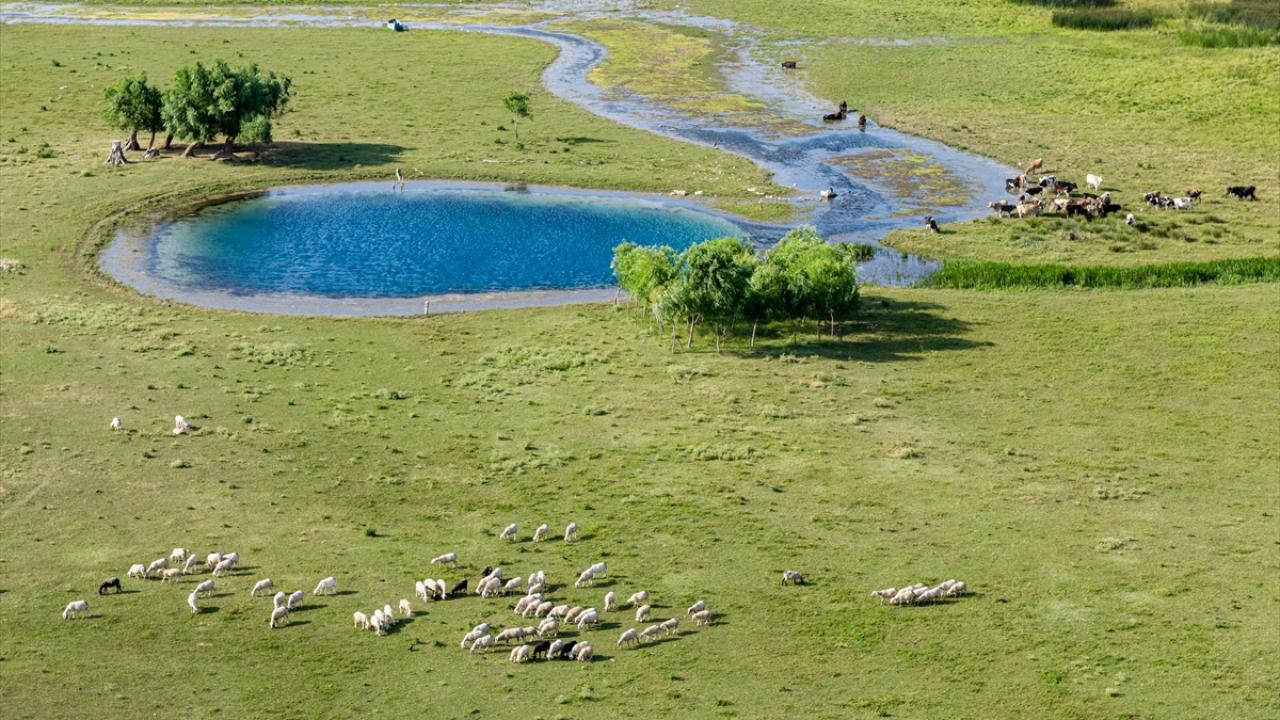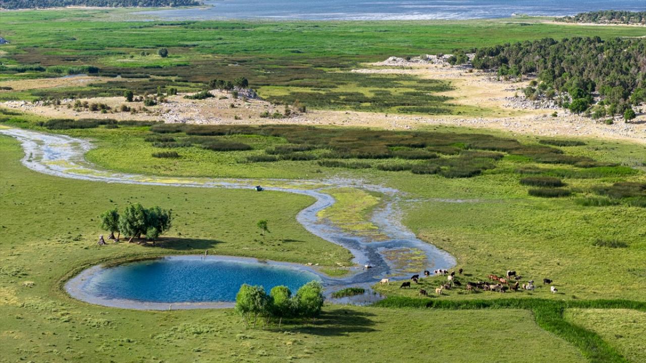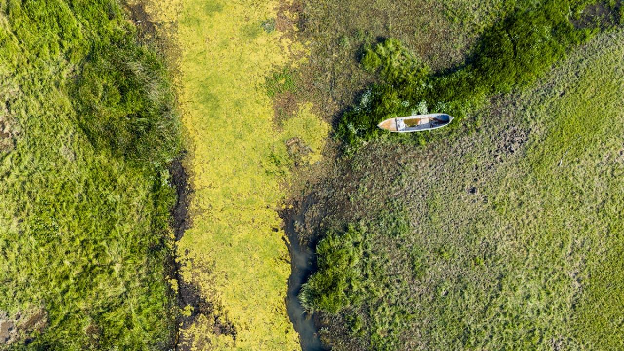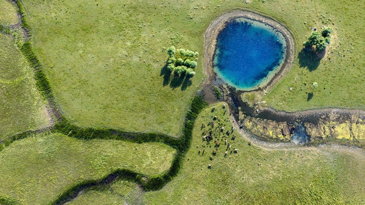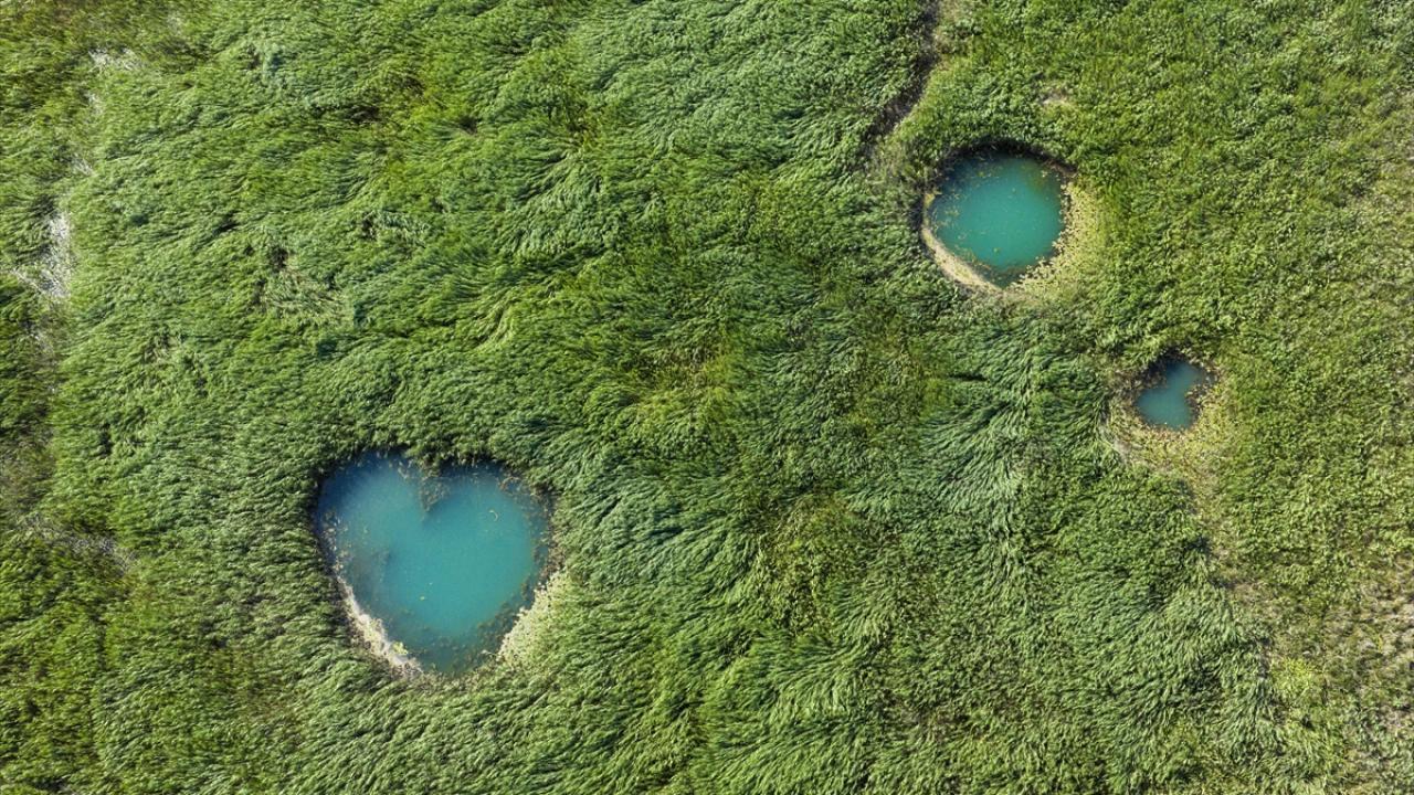 Yaz aylarında etkili olan yüksek sıcaklıklar ve yetersiz yağış nedeniyle göldeki çekilme gözle görülür şekilde artarken, suyun geri çekildiği alanlarda ortaya çıkan doğal kaynak gözeleri havadan görüntülendi.