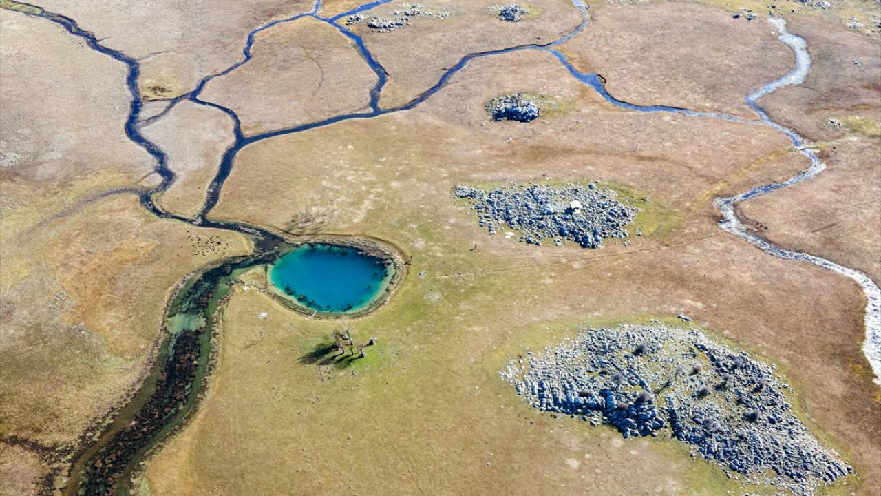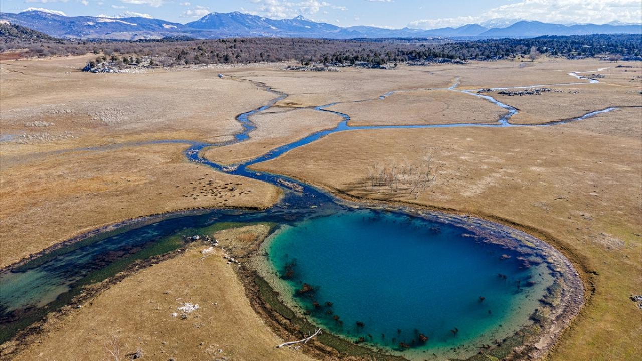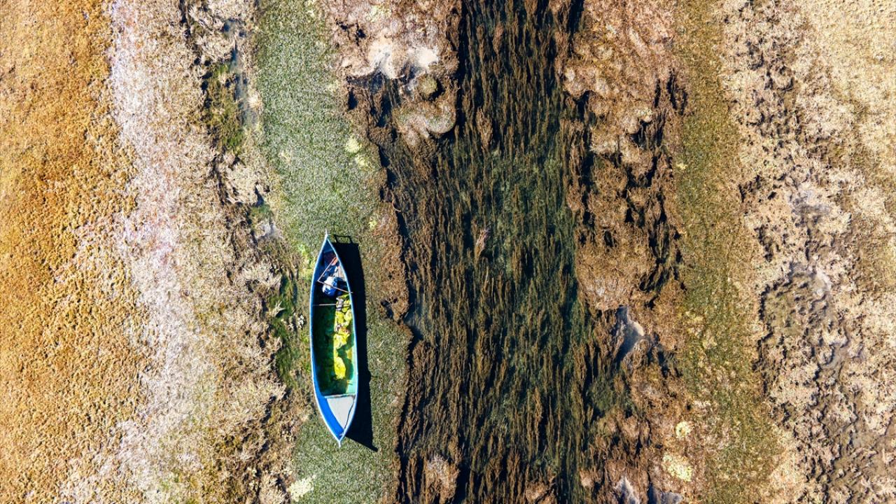 Renkli görünümüyle etkileyici olan su gözesi, göldeki kuraklık seviyesinin boyutunu gösteriyor.