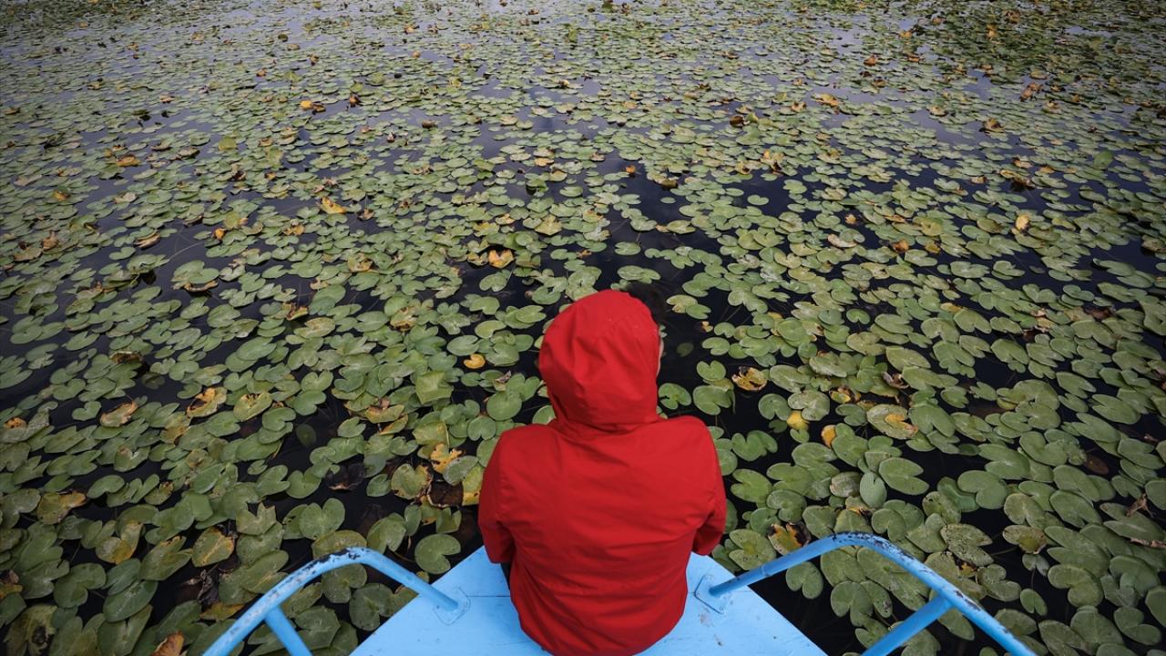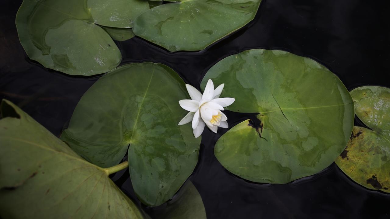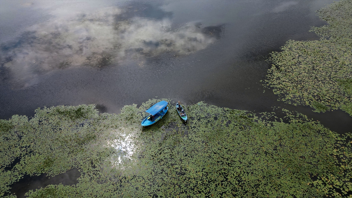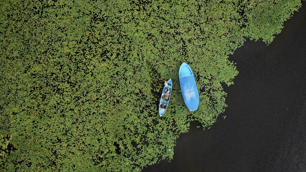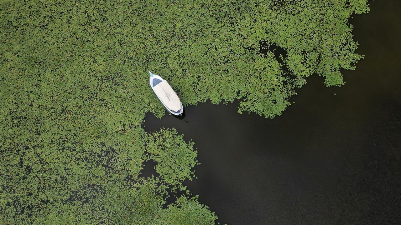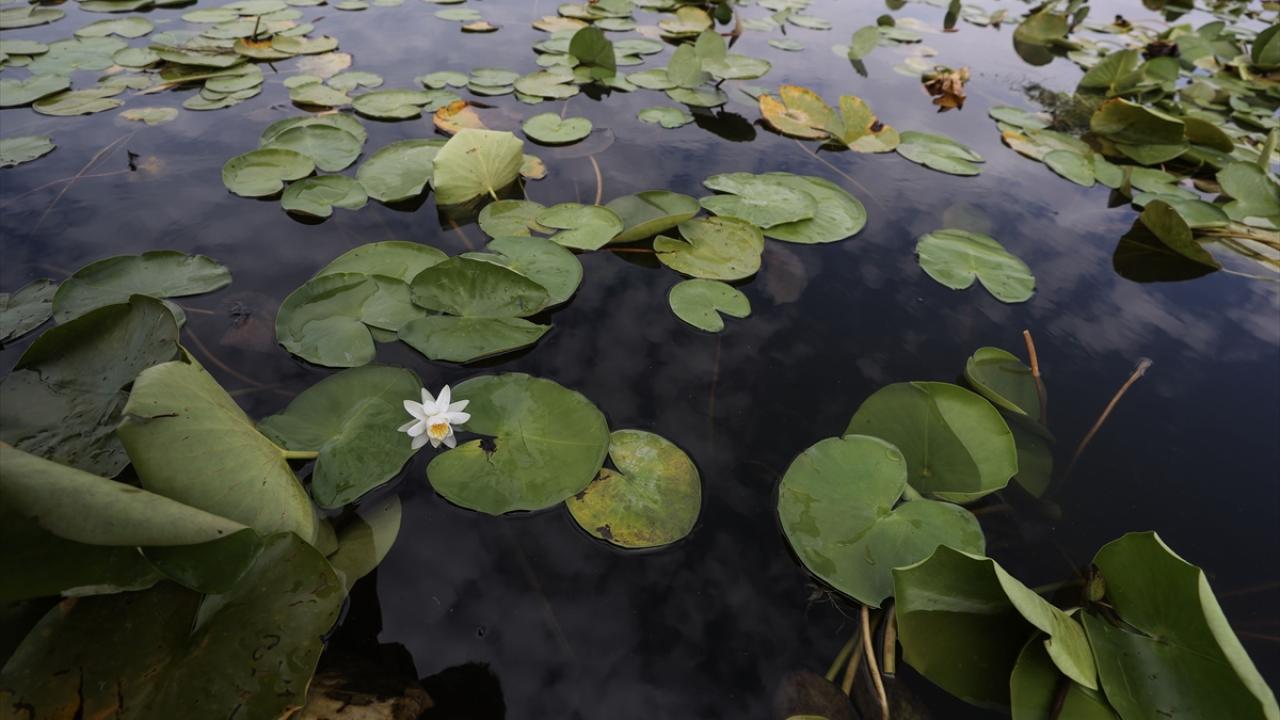 Gölün sığ kıyılarında bulunan ve güneşle açan nilüferler, günün en sıcak saatlerinde suyun altına gizlenerek kapanıyor.