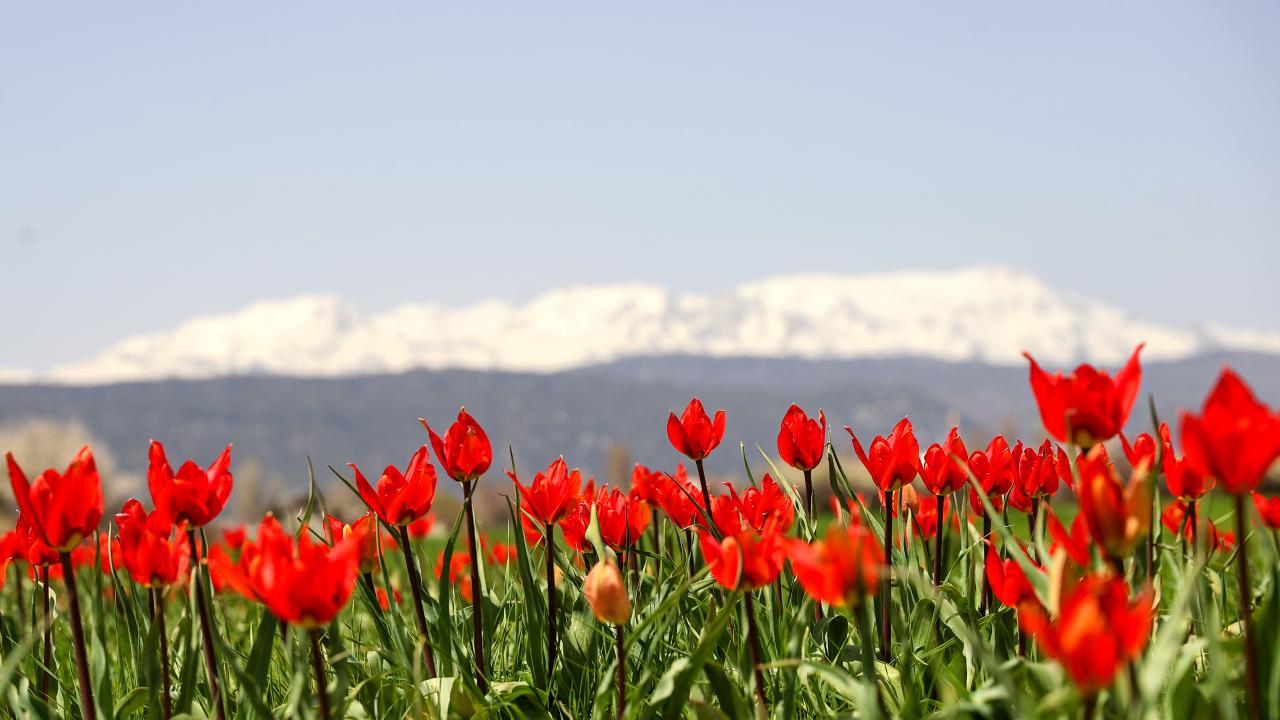Göl havzasında Adaköy Mahallesi`nin arazilerinde açan laleler de Anamas Dağı`nın karlı manzarasıyla kırmızı, beyaz, yeşil ve maviyi buluşturdu.