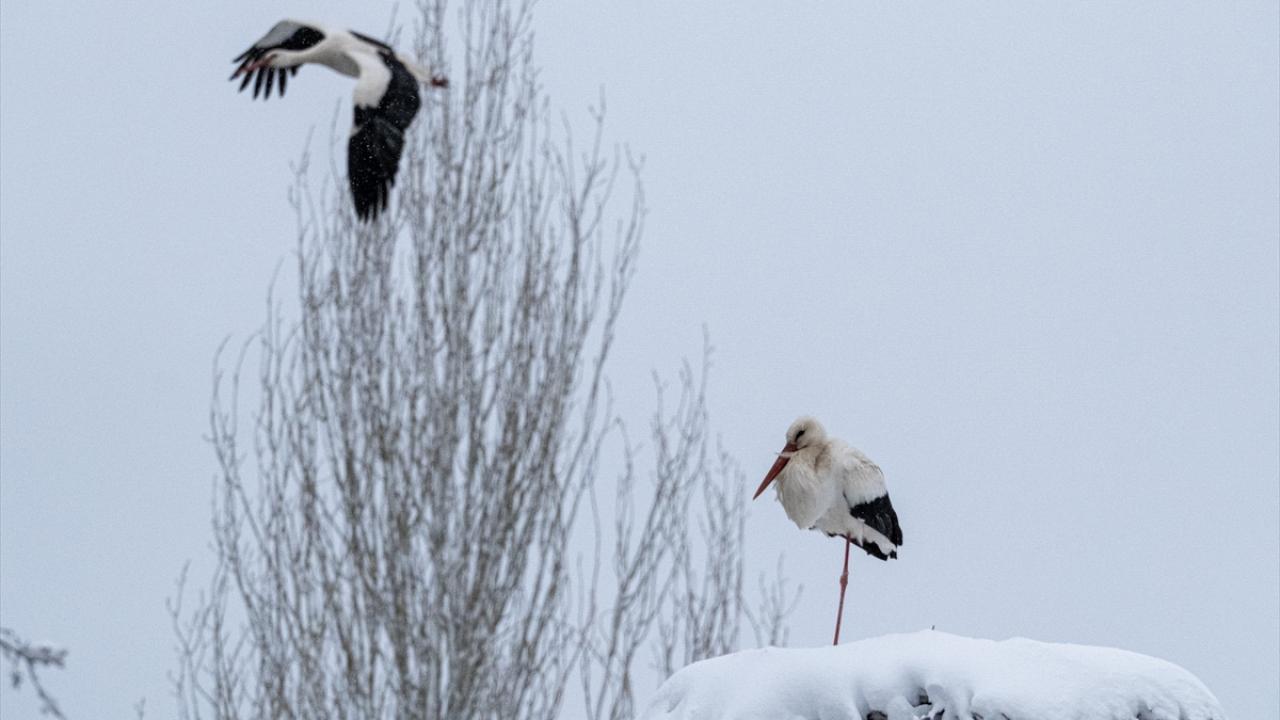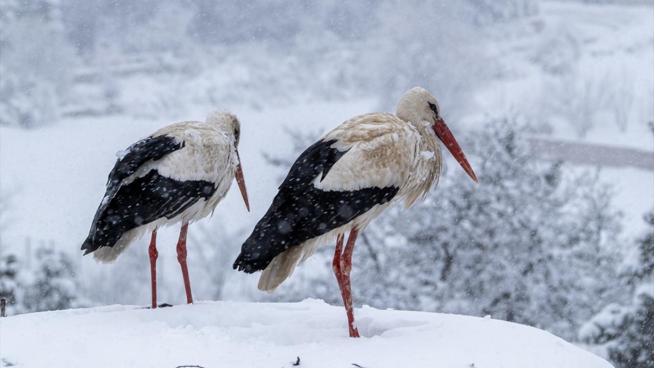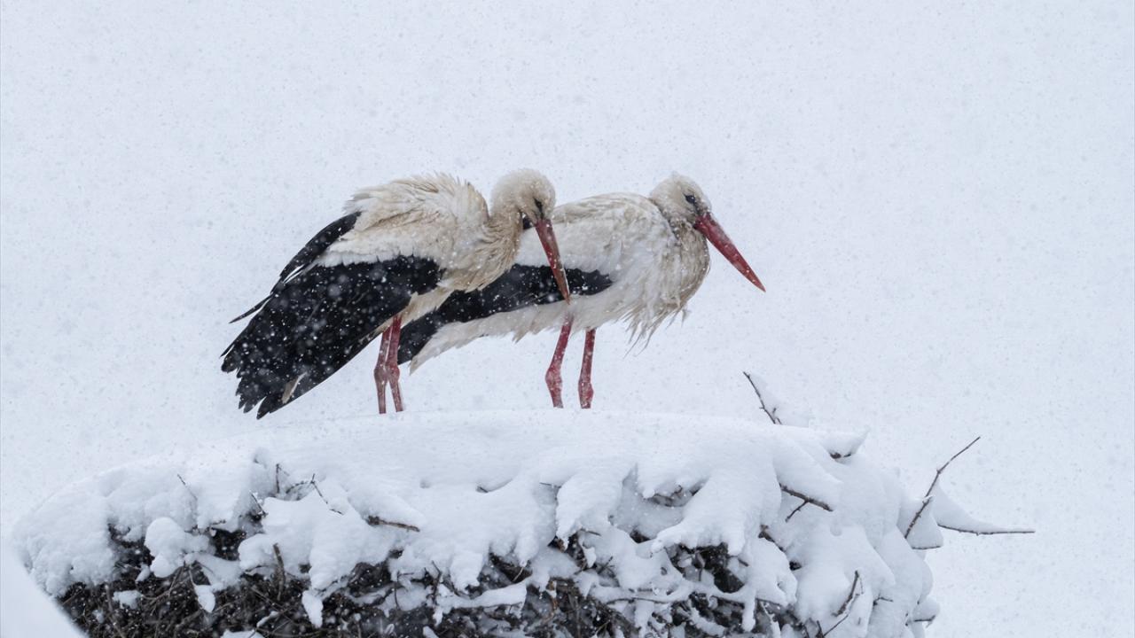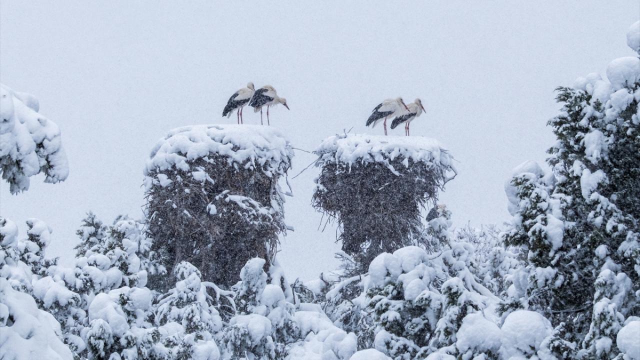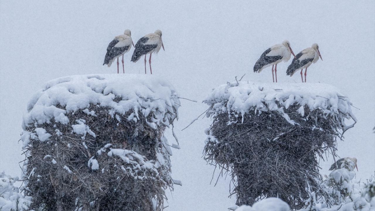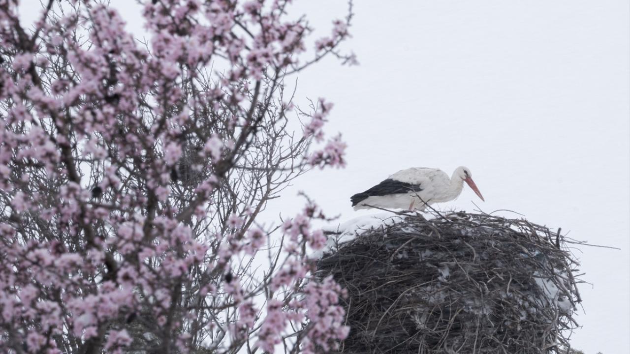 Yaşanan soğuk hava dalgası sebebiyle besin bulmakta zorlanan leylekler, çiçek açmış ağaçlar arasındaki yuvalarında tek ayak üstünde havaların ısınmasını bekliyor.