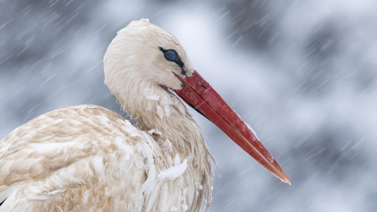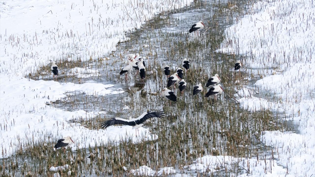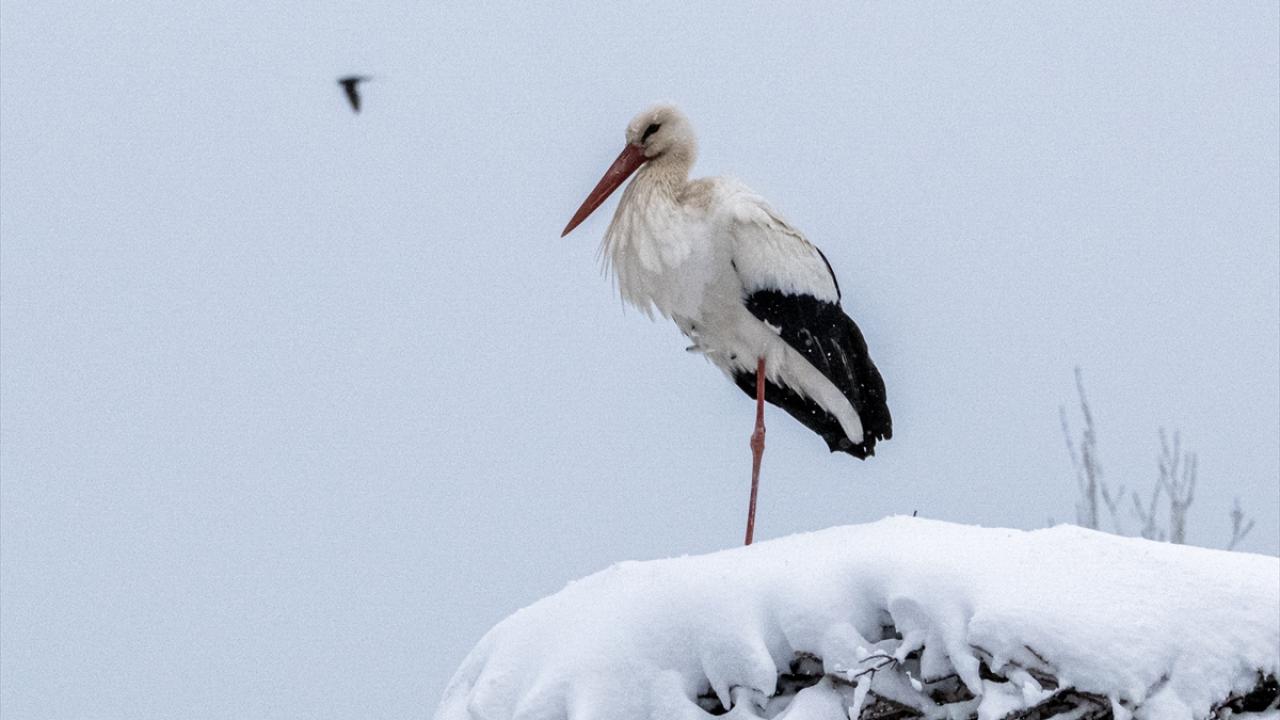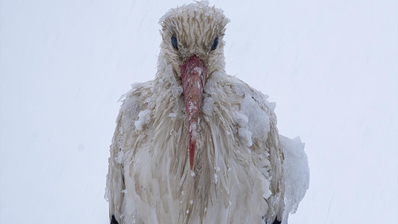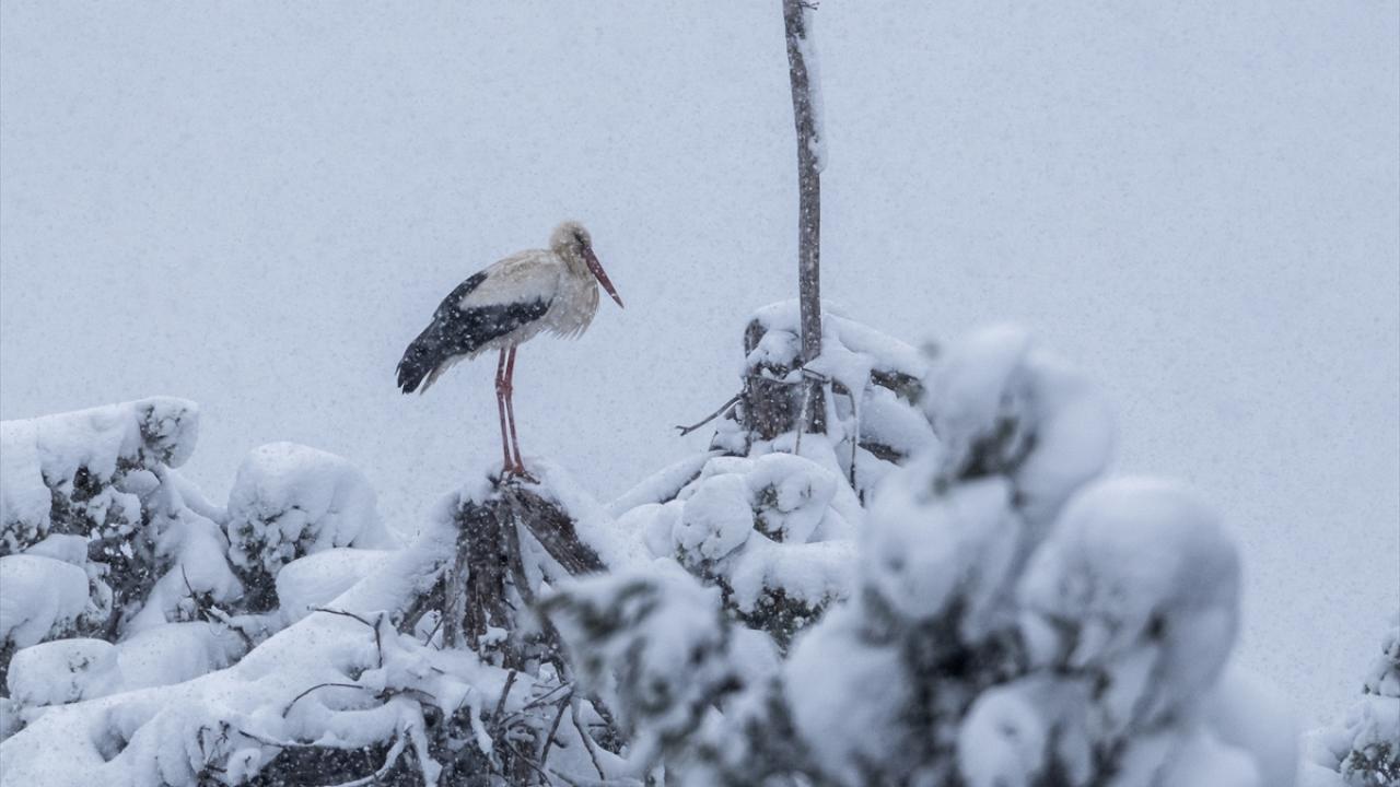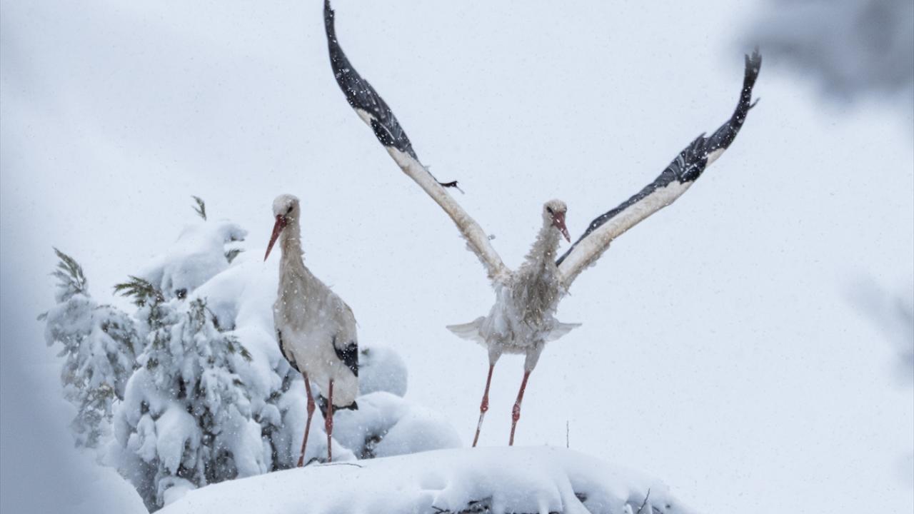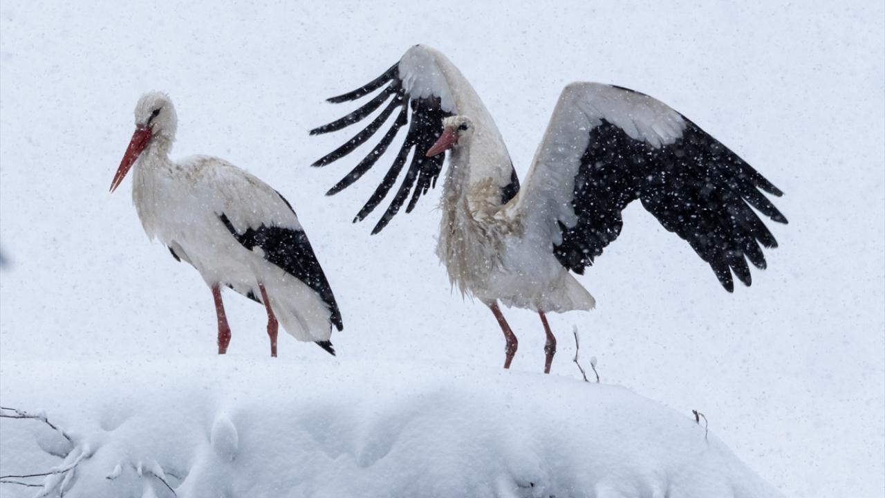 Yaşanan soğuk hava dalgası sebebiyle besin bulmakta zorlanan leylekler, çiçek açmış ağaçlar arasındaki yuvalarında tek ayak üstünde havaların ısınmasını bekliyor.