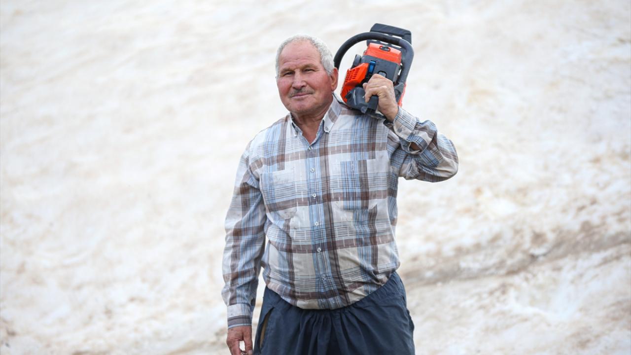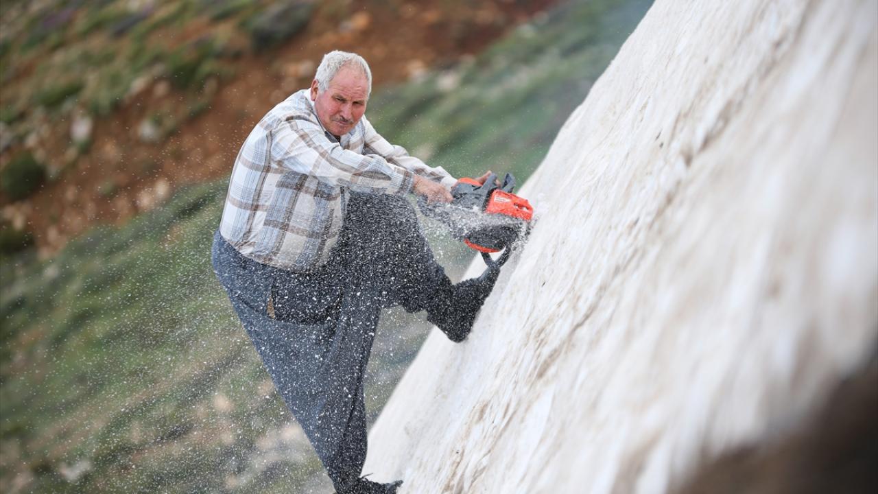 "Akşamdan hazırlıklarımı yaparım. Sabah ezan okununca namazımızı eda ettikten sonra iki arkadaşımla yola düşeriz. Aşağı yukarı iki saatte buraya geliyoruz. Kahvaltımızı yaptıktan sonra kar kesimine başlıyoruz. Bu bölgeye sarp dağların arasından geçerek ulaşıyoruz. Kolaydan ekmek kazanmak yok. Buraya gelirken yanımda ağaç motorunu getiriyorum. Temizleme yaptıktan sonra başlıyorum. Yanımda da iki arkadaş getiriyorum. Ben kesiyorum, onlar da çuvallıyor ve araçlara yüklüyor. Kamyonla gelirsek 40-45 kalıp kar topluyorum. Kestiğimiz karın her bir tanesi 60-70 kilo arasında geliyor. Atalarımız `İşleyen demir ışıldar` demiş. Biz de çalıştıkça ışıldıyoruz. İnsan çalıştıkça her şeyi yapabiliyor. Yaşım 70 ama işim bitmiş değil. Halen yola devam ediyorum. Çalıştıkça gençleşiyorum."