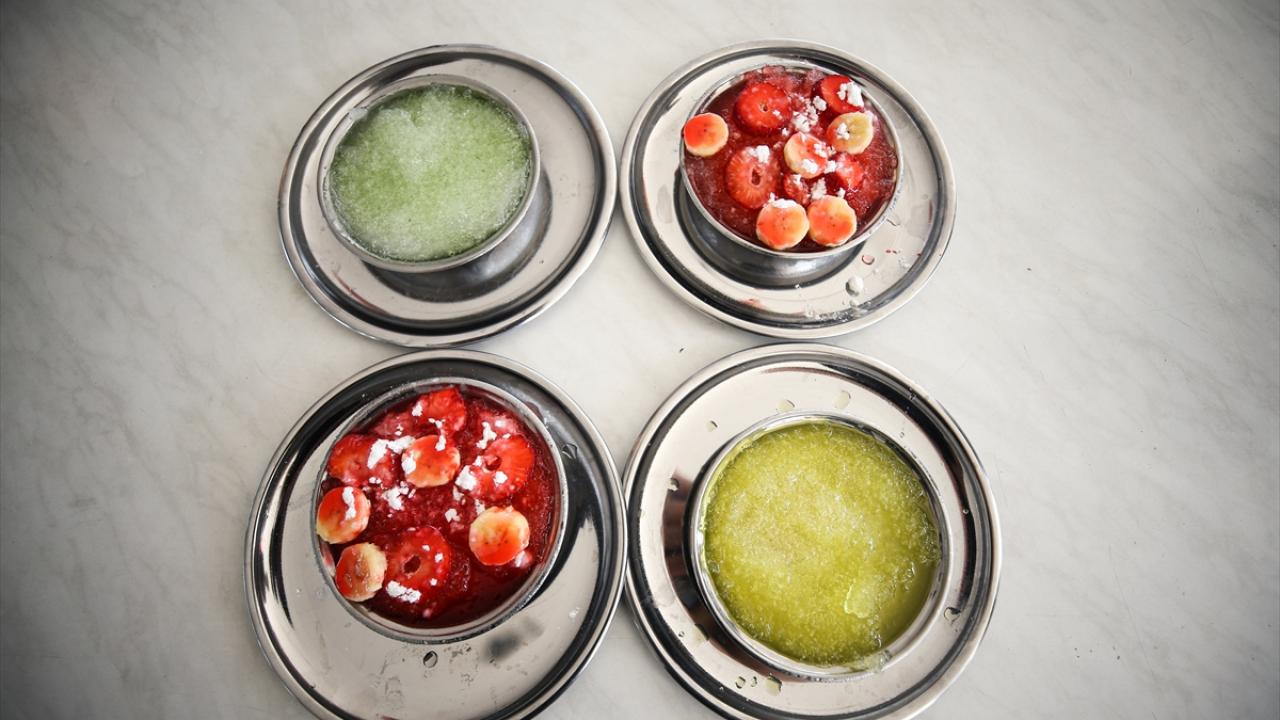 Kırsal Ayvagediği Mahallesi`ndeki dükkanına getirerek rendelediği karlara gül suyu, pudra şekeri, aroma ve çeşitli meyveler karıştıran Küçükçongar, yaptığı karsambaç ve bici bicileri satışa sunuyor.