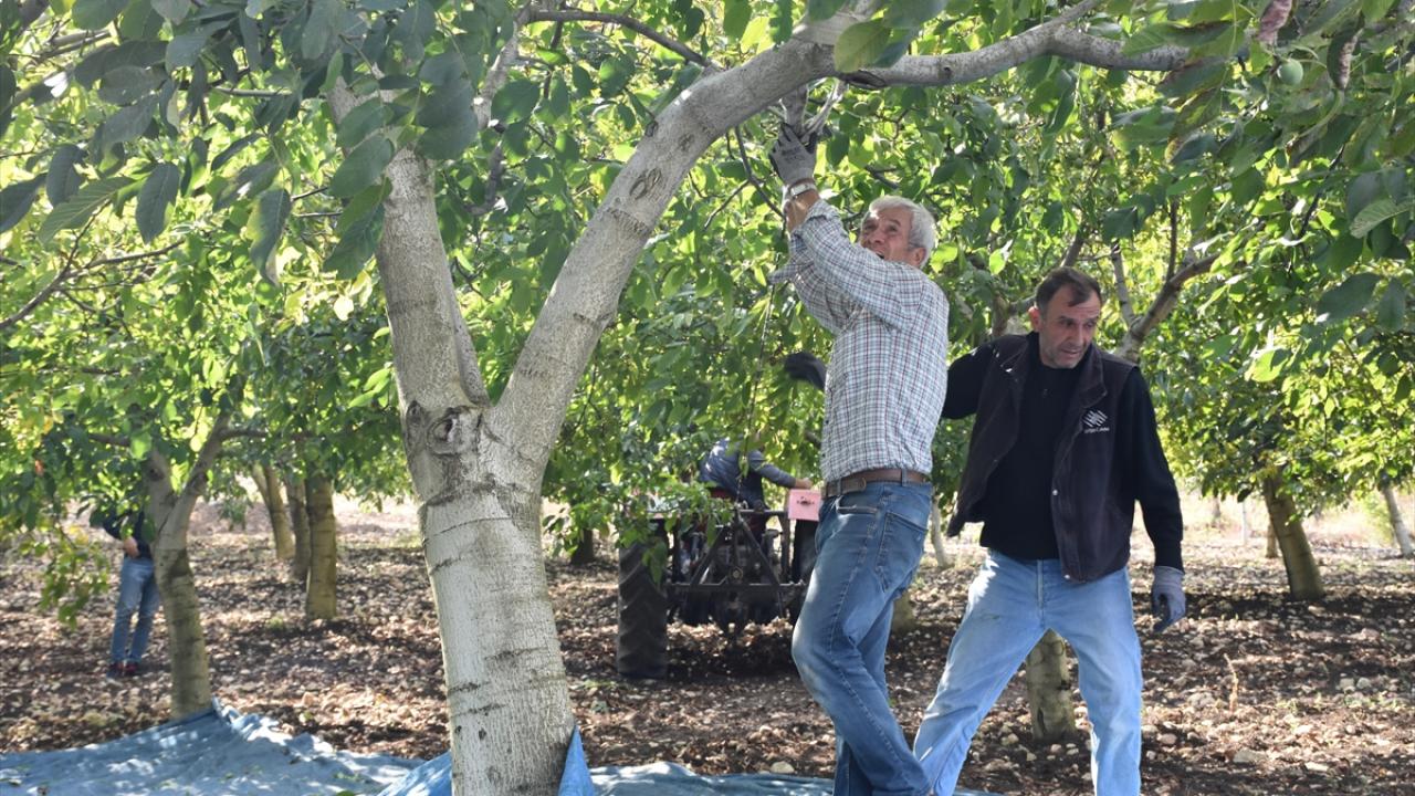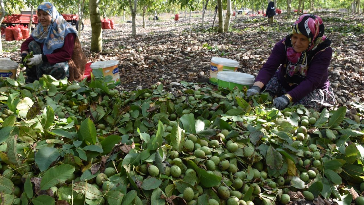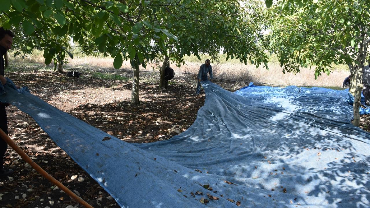 Ağaçların altına örtü seren köylüler, dalları traktör aracılığıyla silkeleyip yere düşmesini sağladıkları cevizleri temizleyerek çuvallara dolduruyor.