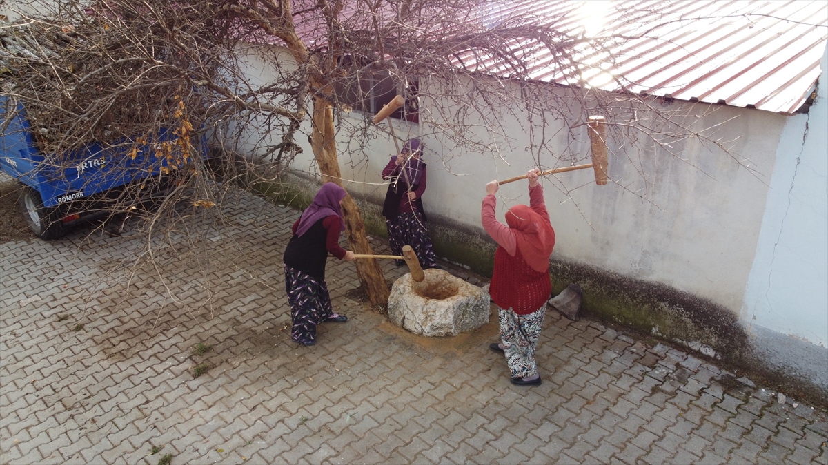 Bilecik'in Gölpazarı ilçesinde kış aylarında hazırlanıp tüketilen köklü geçmişe sahip "kavurga" adlı verilen yiyecek, kadınlar tarafından değirmen taşı ve dibekte imeceyle yapılıyor.