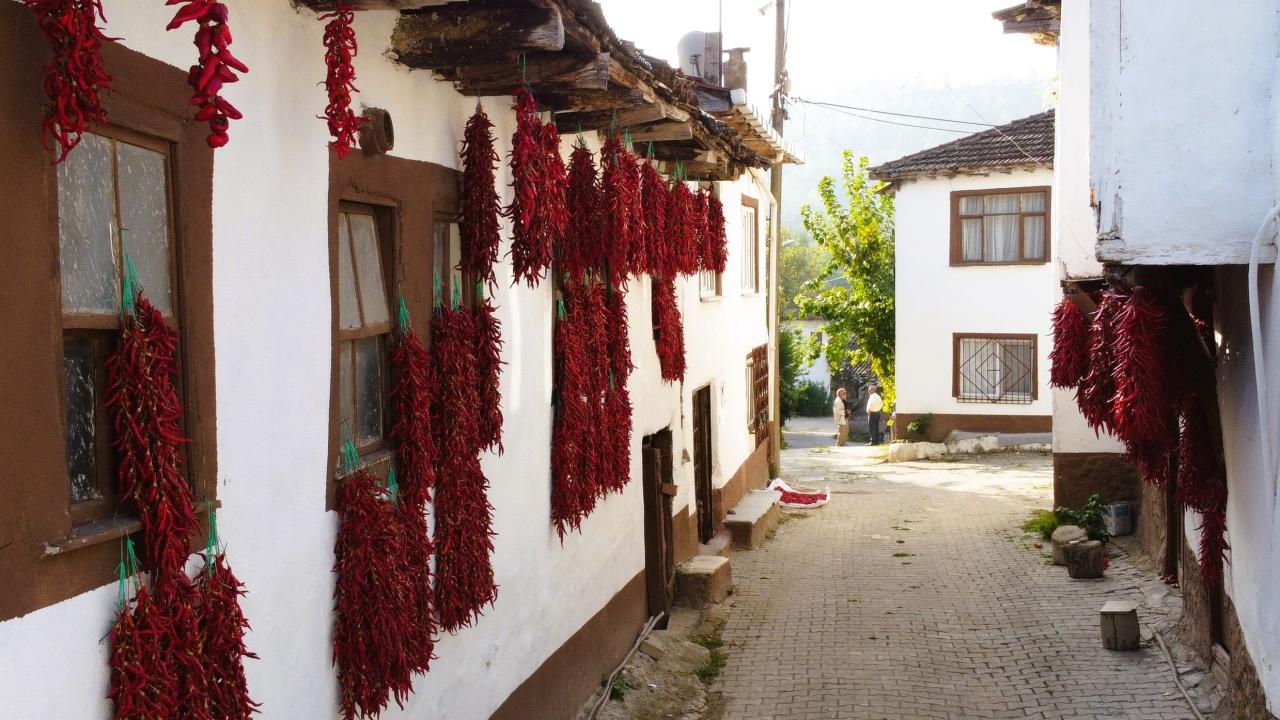 Bilecik Valisi Şefik Aygöl, beraberindeki protokol üyeleriyle, köyde duvar ve balkonlarda kurutulan biberleri inceledi.