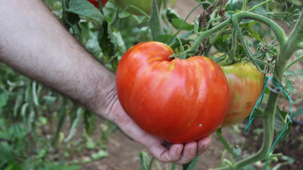 Bilecik'in Pazaryeri ilçesinde yaşayan Mesut Kolay, 10 yıl önce hobi amaçlı kurduğu serasında doğal koşullarda her biri 1,5 kilogramı aşan ağırlıkta domatesler üretiyor.