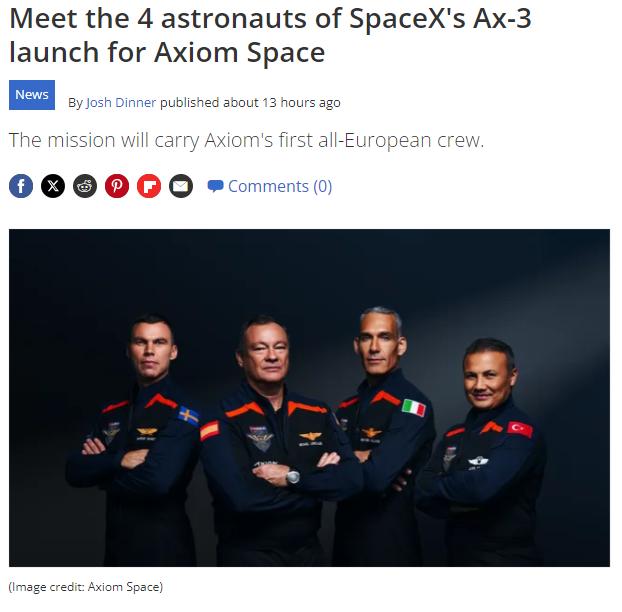 ABD merkezli bilim sitesi Space.com`da SpaceX`in Axiom Space için fırlattığı Ax-3`ün, ilk kez tamamı Avrupalı 4 astronot taşıyacağına dikkat çekildi.