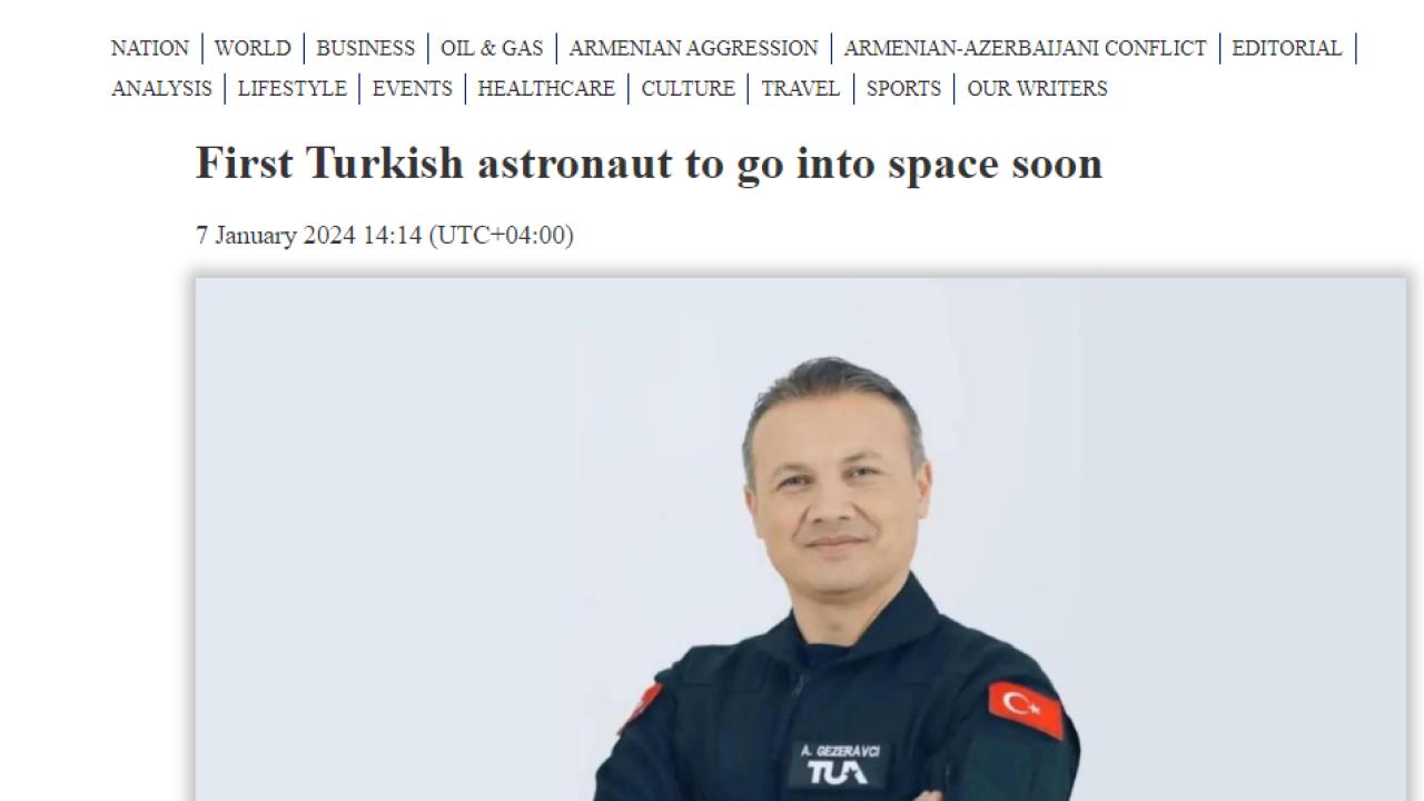 Alper Gezeravcı`nın uzay görevi, Azerbaycan medyasında da yer aldı. Haberde, " İlk Türk astronotun uzay görevine İspanyol, İtalyan ve İsveçli astronotlarla birlikte katılacağı belirtildi.