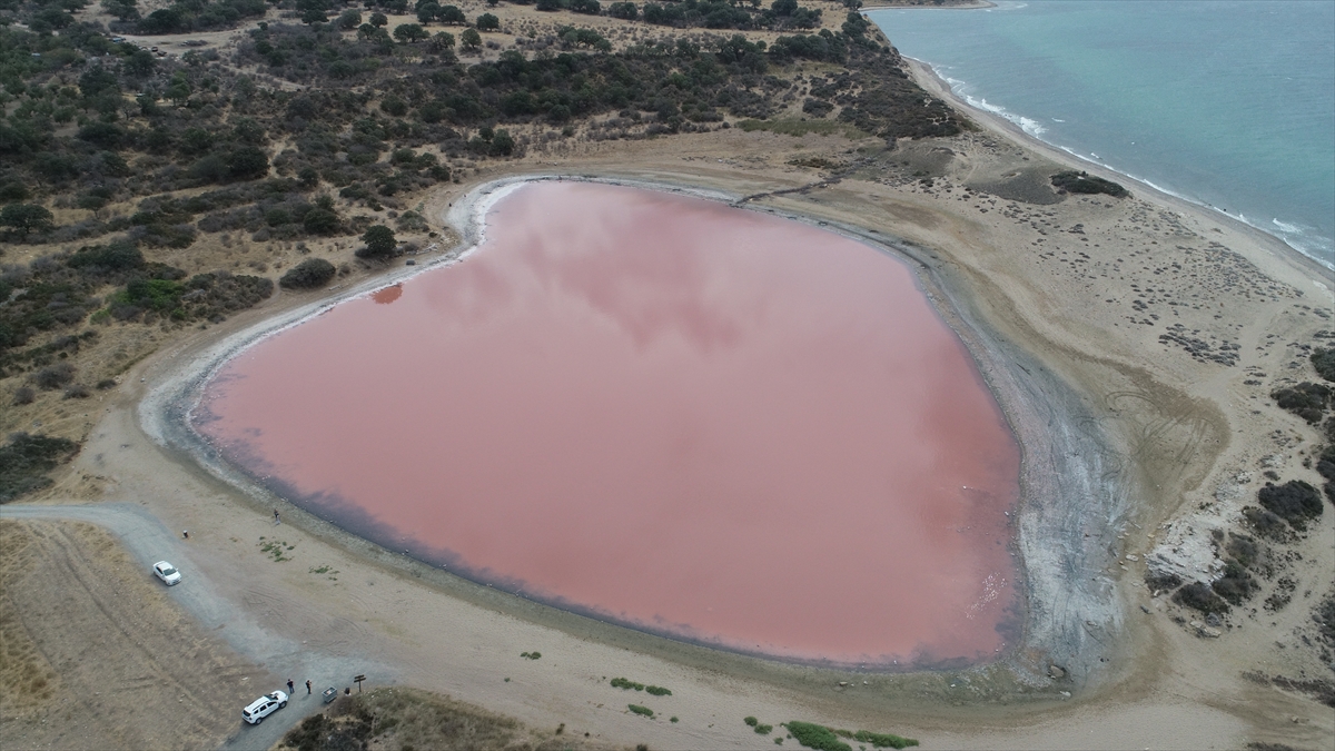 Çanakkale'nin Ezine ilçesine bağlı Dalyan köyünde yılın bazı günlerinde pembe renge bürünen "Kalpli Göl"de araştırma yürüten bilim insanları, yeni tür mikroorganizmalar keşfetmeyi amaçlıyor.