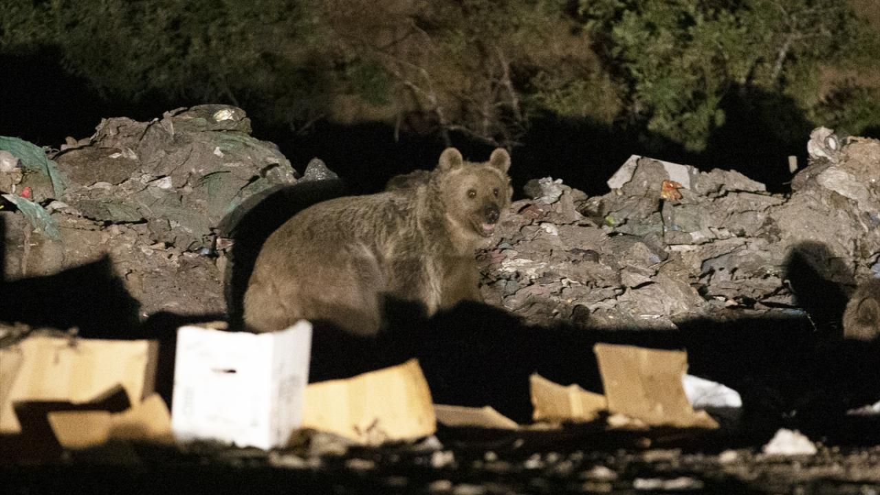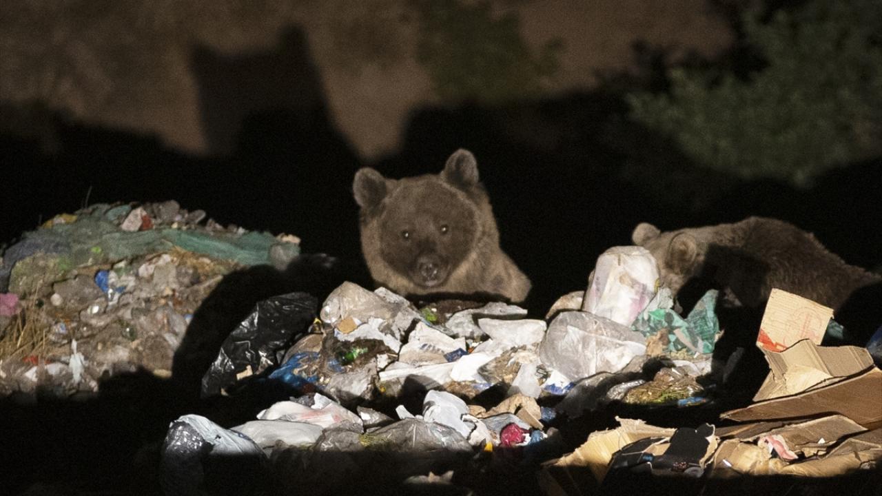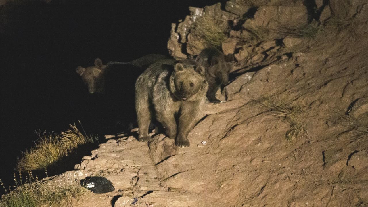 Gece saatlerinde bozayı ve tilkiler dağlık alandan yiyecek bulabilmek için çöplüğe iniyor.