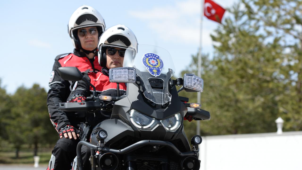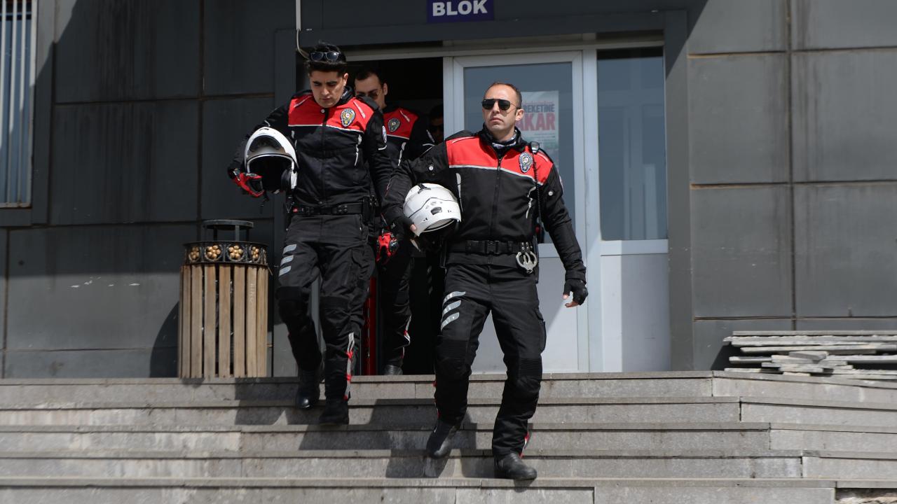 Motosikletli Polis Timleri, ikişerli ekip halinde, olaylara müdahale ediyor.