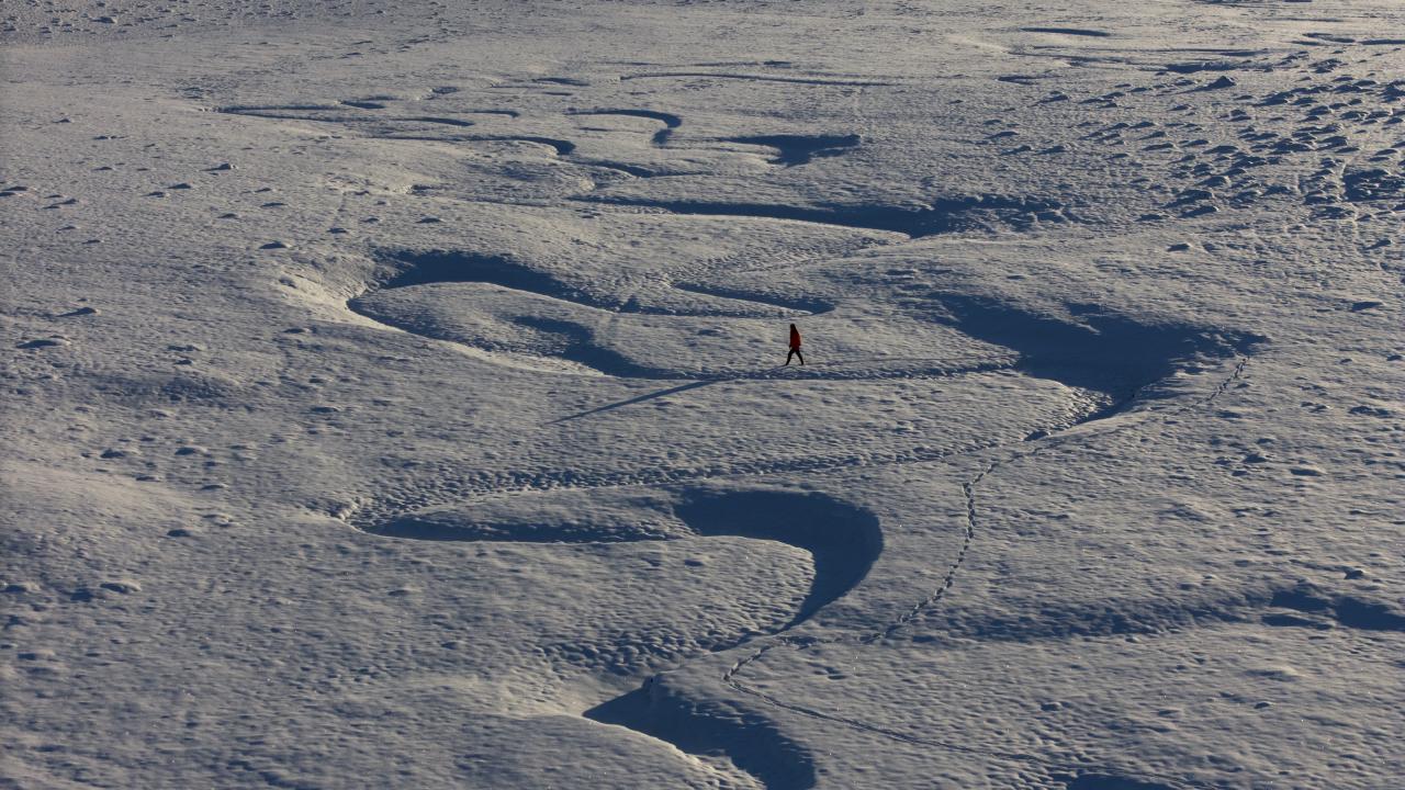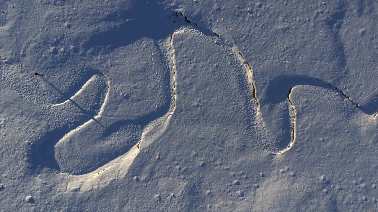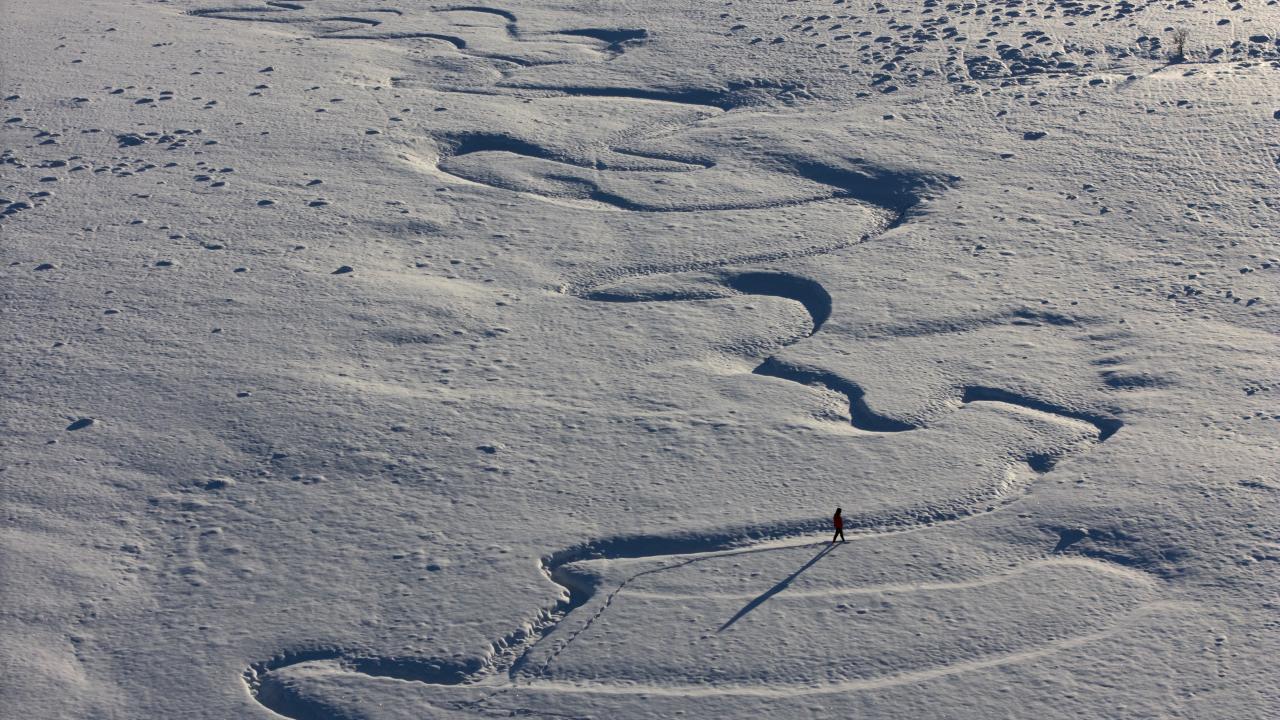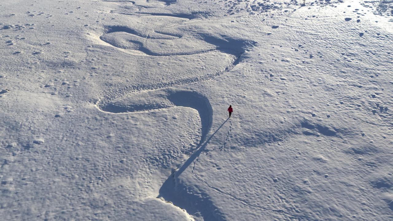 Üzeri tamamen beyaz örtüyle kaplanmasına rağmen suyun oluşturduğu şekiller dronla görülebiliyor.