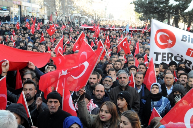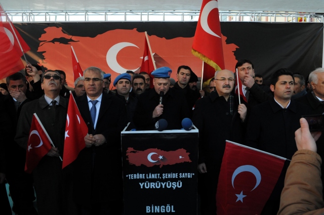 Bingöl'de "Şehitlere Saygı ve Milli Birlik Yürüyüşü" düzenlendi. Merkez Yenişehir Mahallesi'ndeki Saat Kulesi önünde toplanan vatandaşlar, "Şehitler ölmez vatan bölünmez", "Bayrağa uzanan eller kırılsın" , "Vatan sana canım feda" ve "Zalimler için yaşasın cehennem" sloganları atarak, terör örgütü PKK'yı ve hain saldırılarını kınadı.