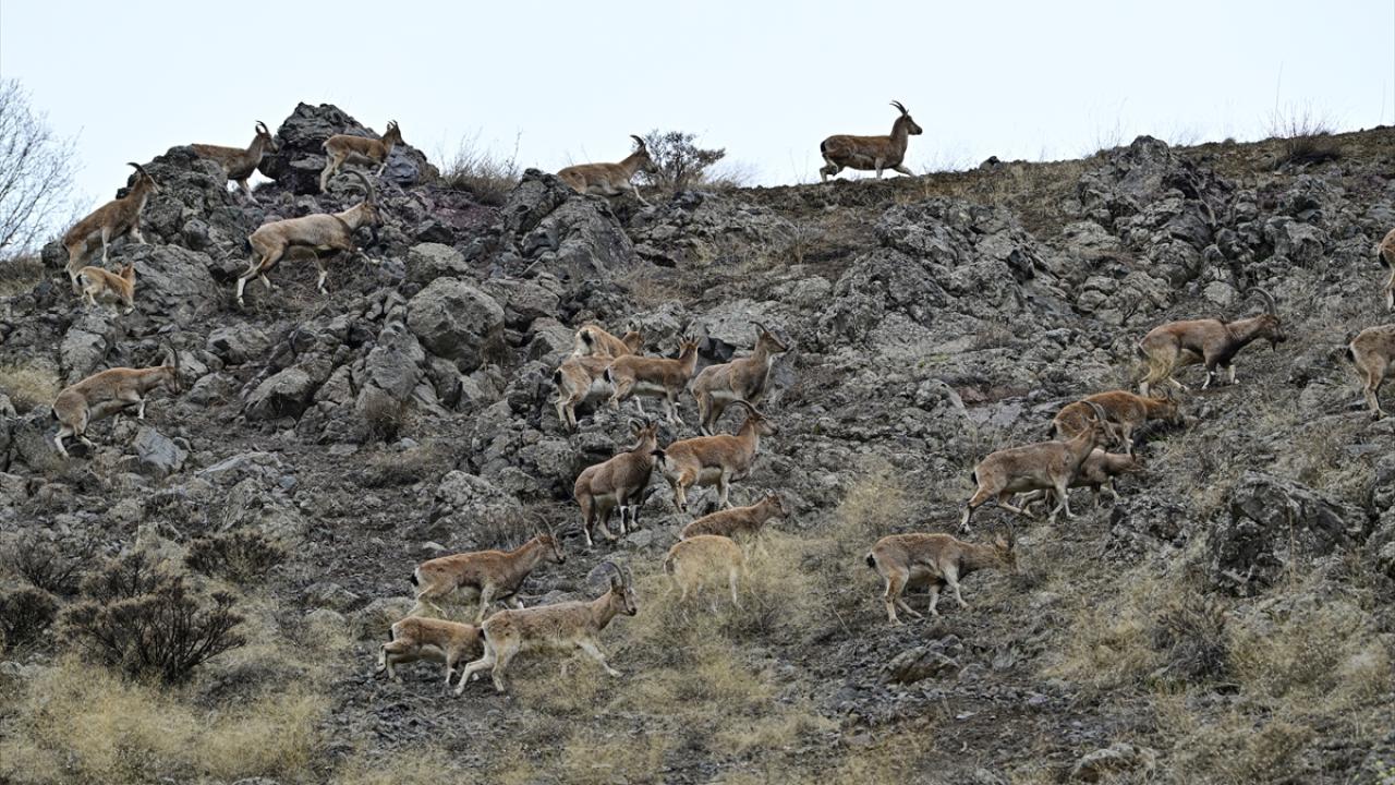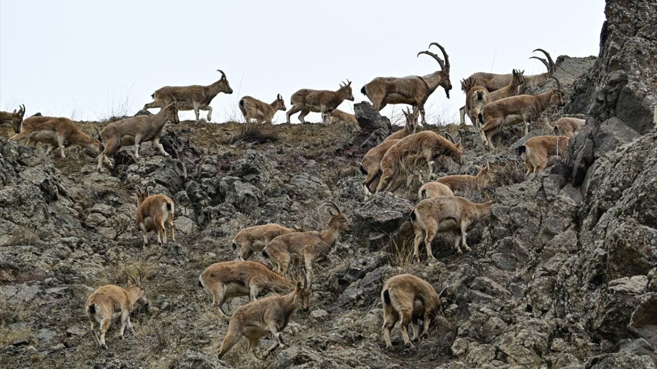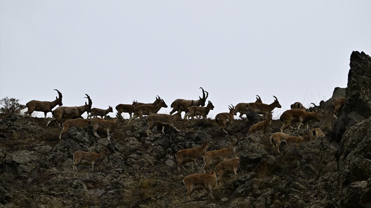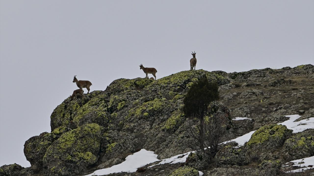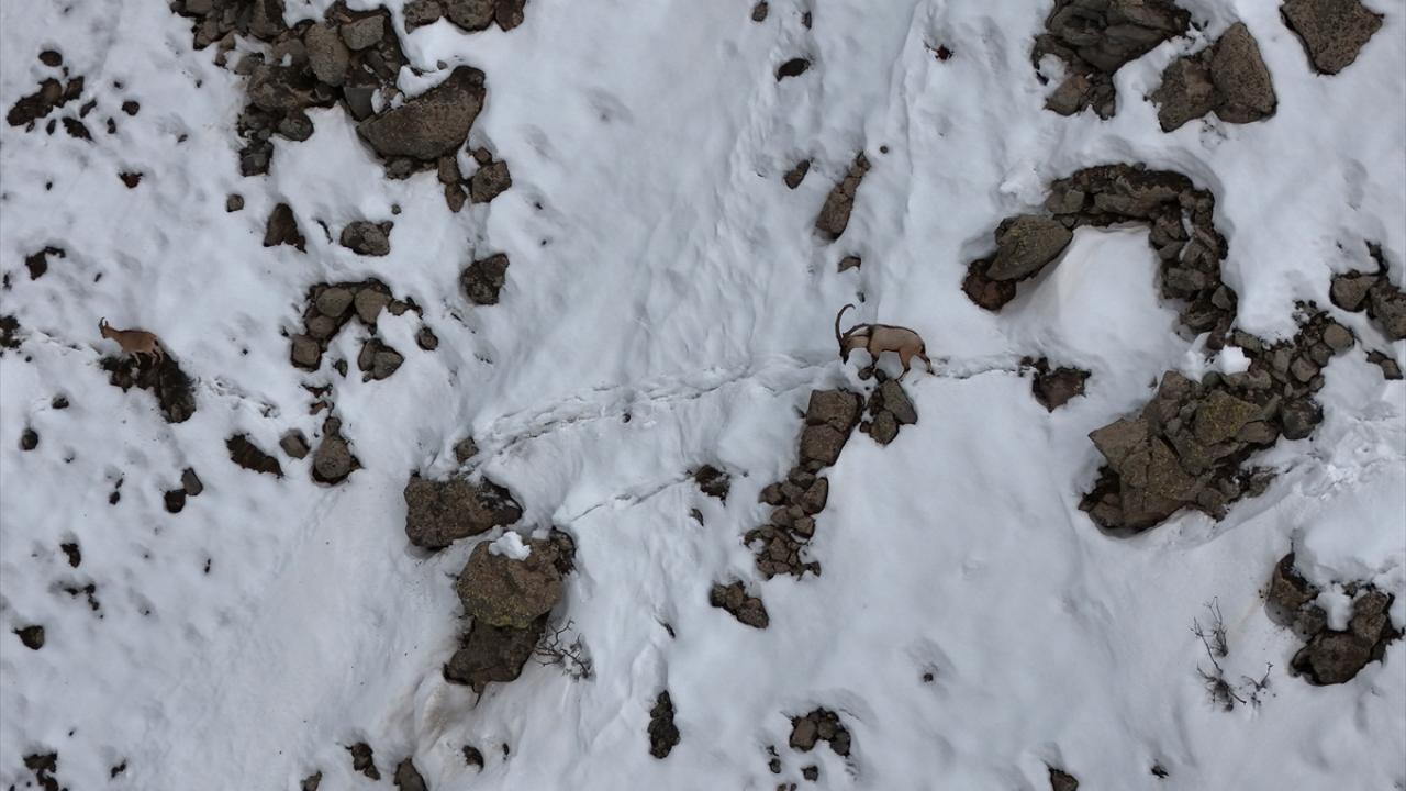 Yaban keçilerinin sürü halinde kayalıklarda ve yer yer karlı dağlardaki gezintisi, AA ekibince görüntülendi.