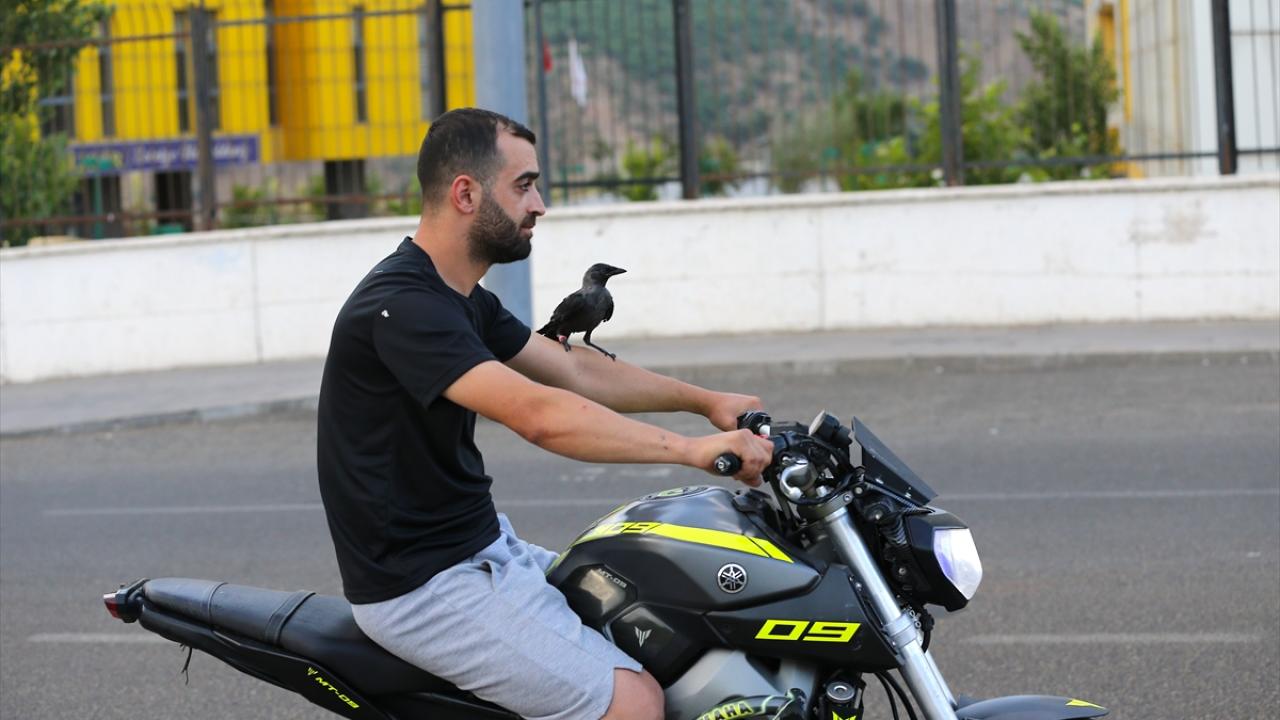 Karga Şimşek`in en çok hoşlandığı aktivitelerden birinin motosikletle gezmek olduğunu belirten Aksoy, motora bindiğinde gelip omzuna konduğunu söyledi.