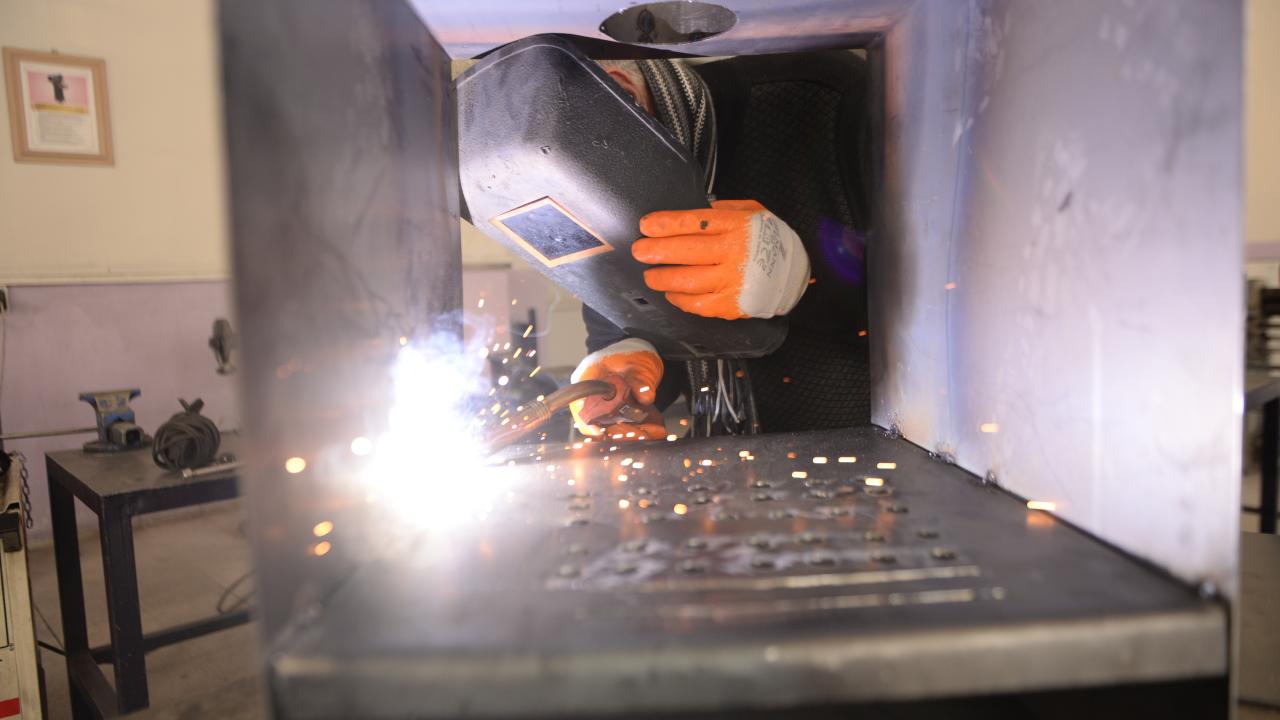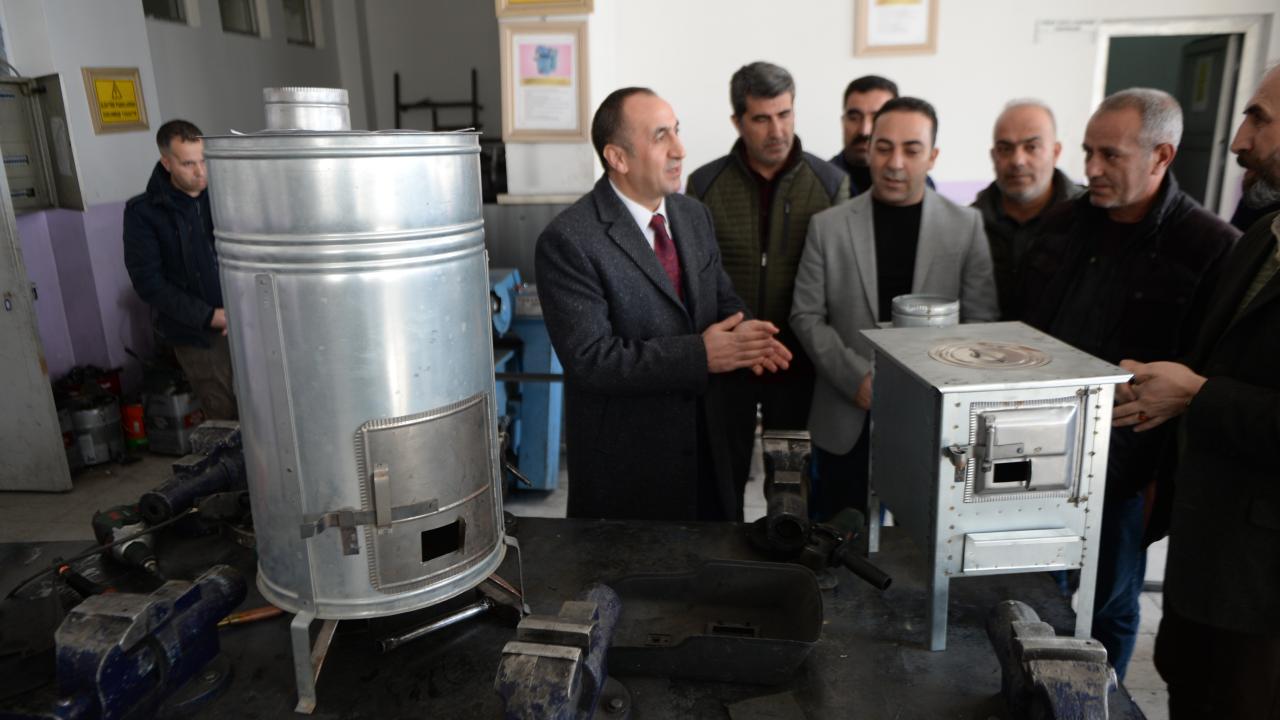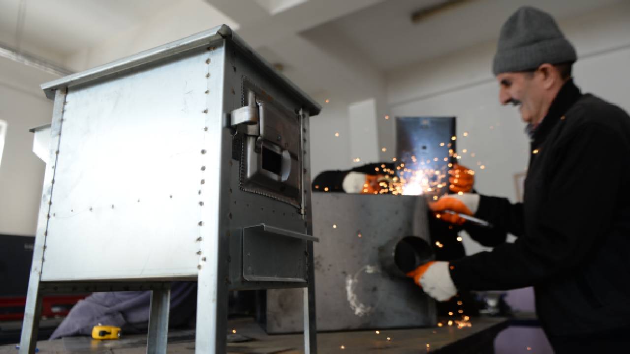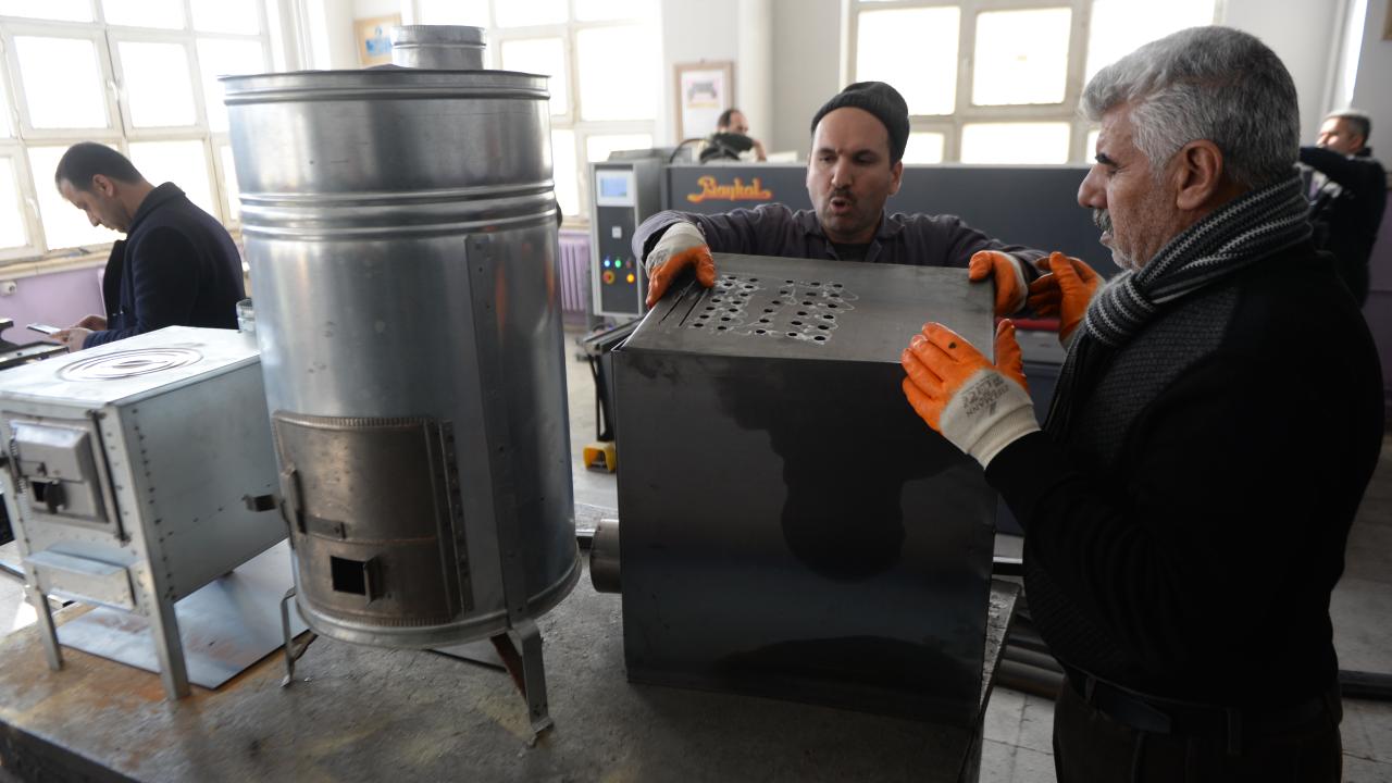 Bingöl Mesleki Teknik ve Anadolu Lisesi atölyesinde öğretmenler ve gönüllü ustaların desteğiyle soba imal ediliyor.