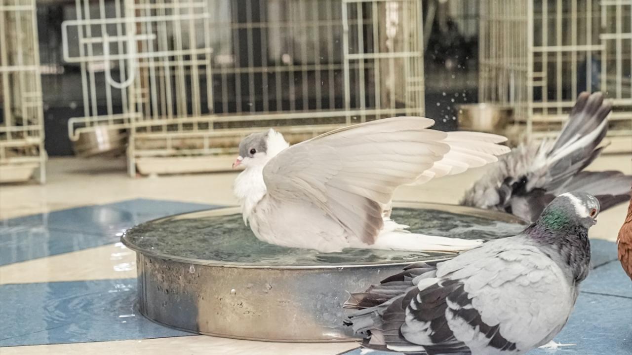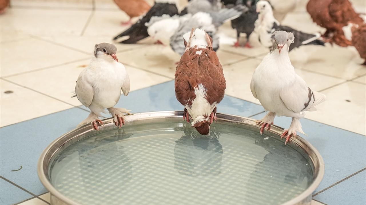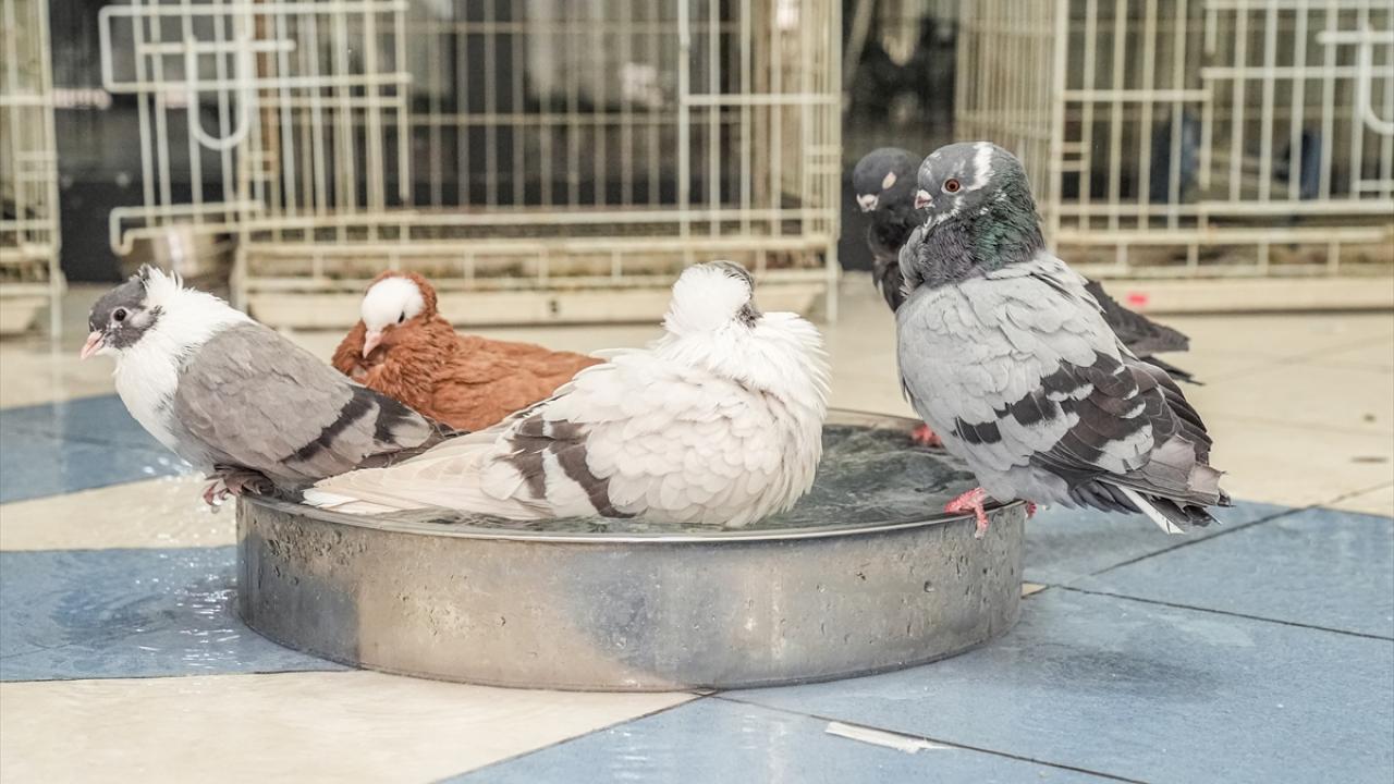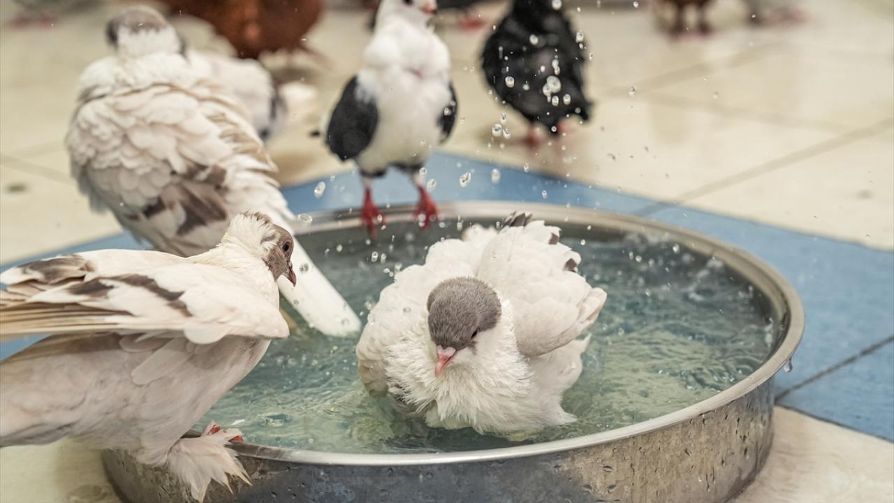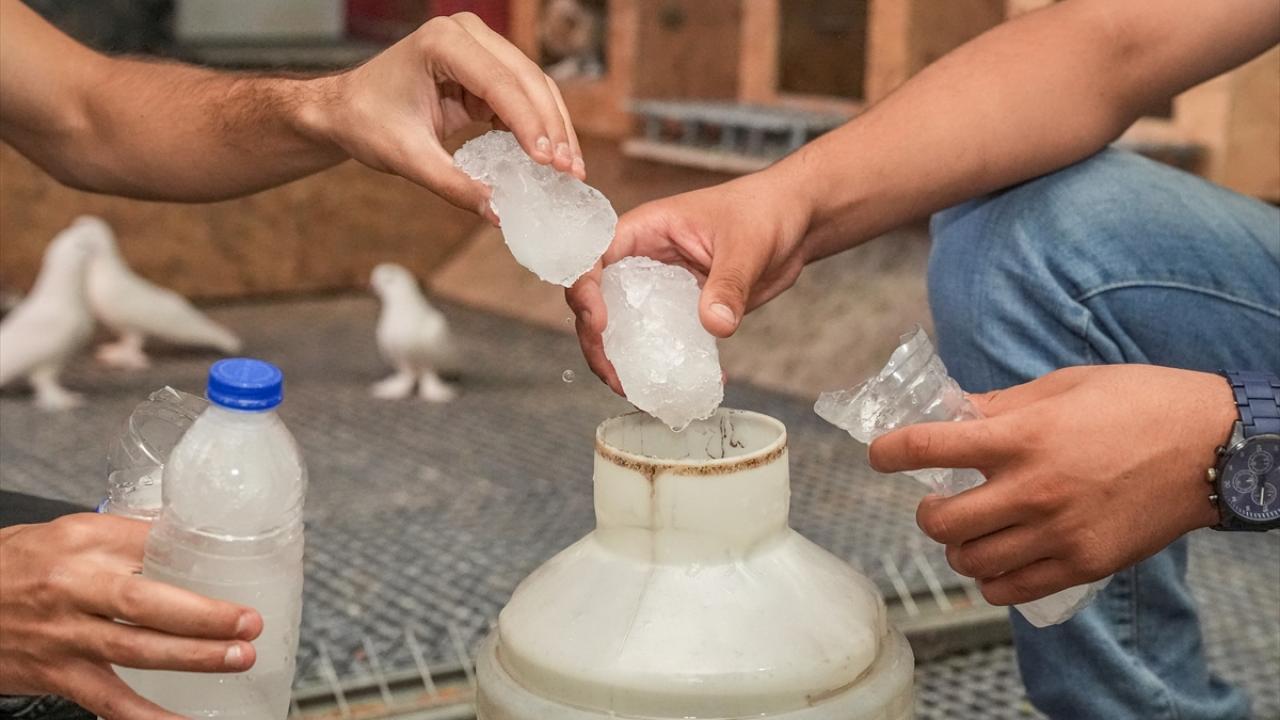 Konakladıkları alanlara yerleştirilen pervanelerle ve havuz banyosu ile serinlemeleri sağlanan güvercinlerin harareti önlemesi için içme sularına buz bırakılıyor.