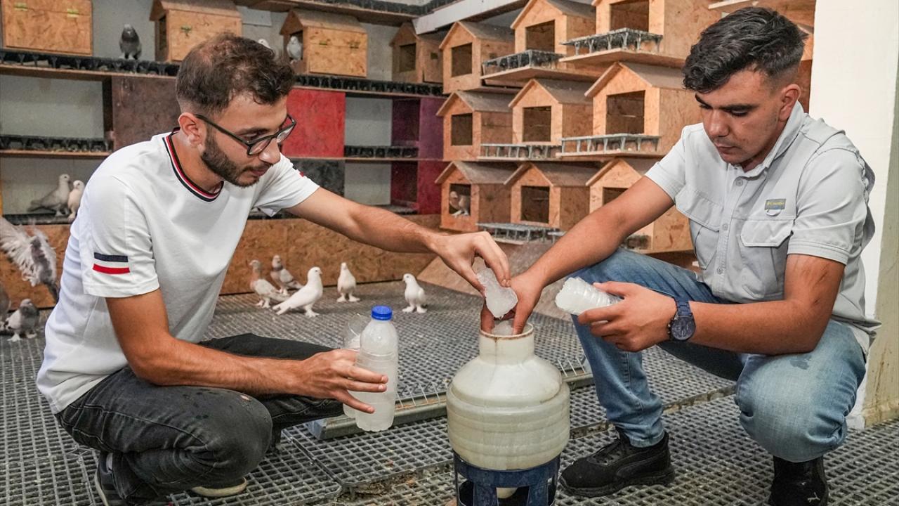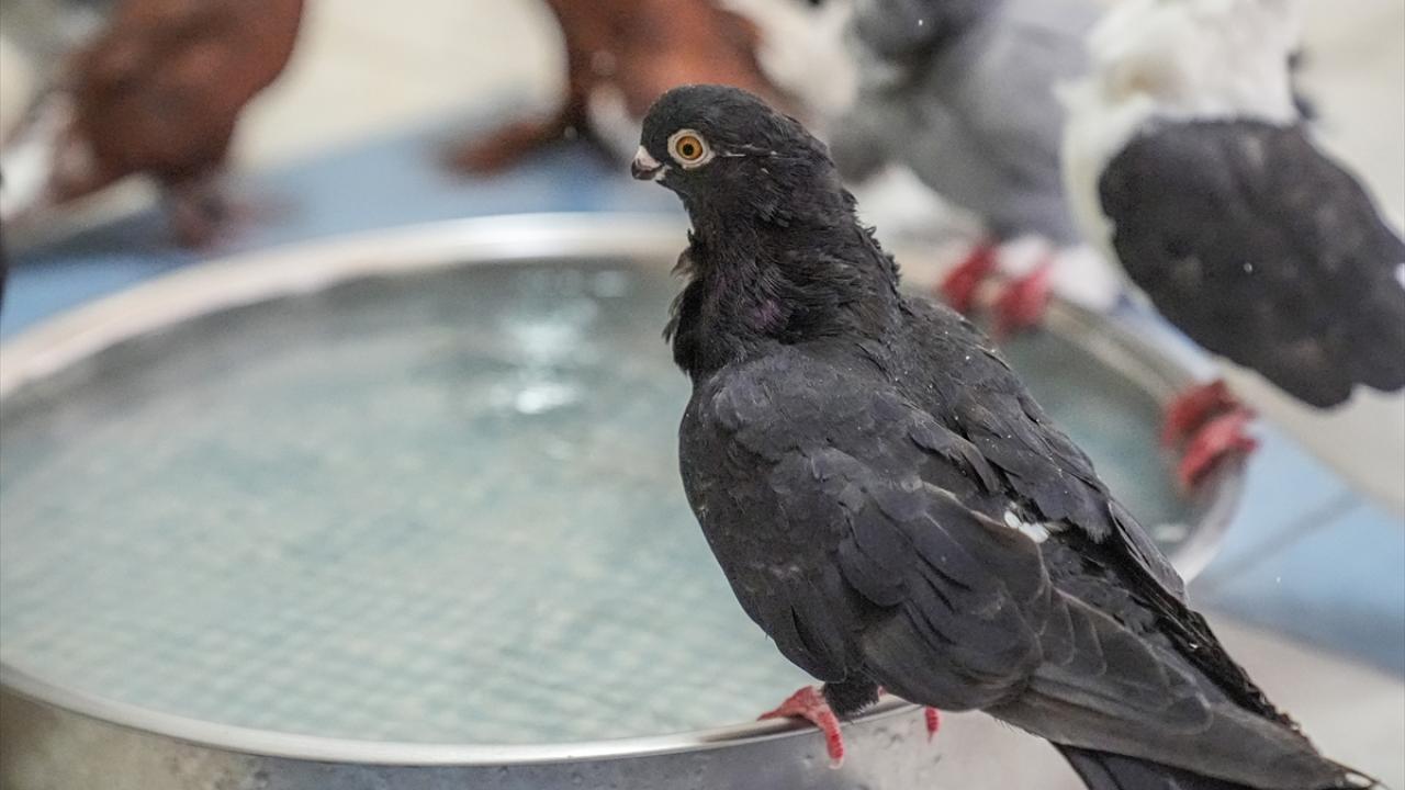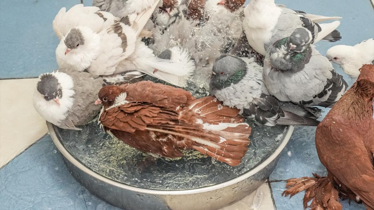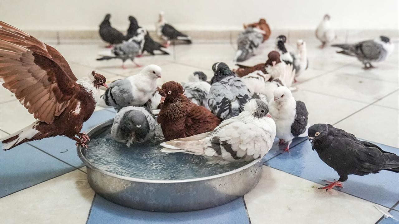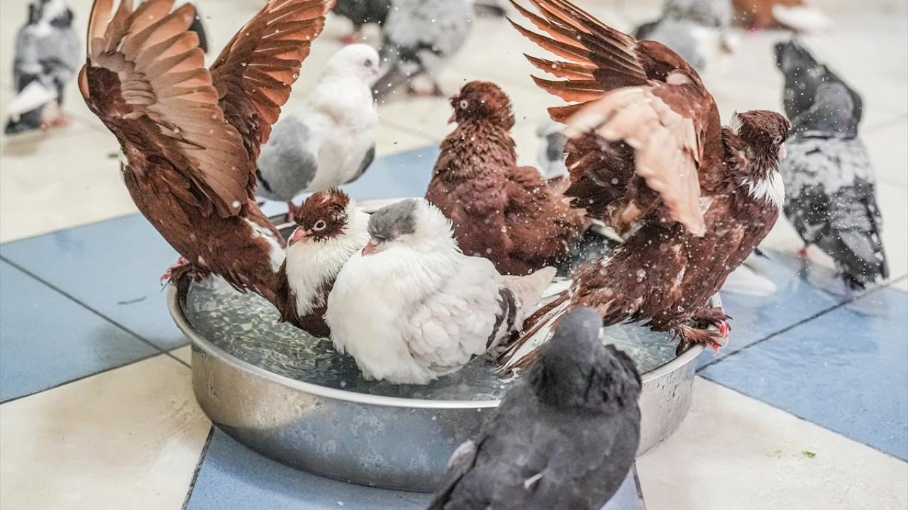 Konakladıkları alanlara yerleştirilen pervanelerle ve havuz banyosu ile serinlemeleri sağlanan güvercinlerin harareti önlemesi için içme sularına buz bırakılıyor.