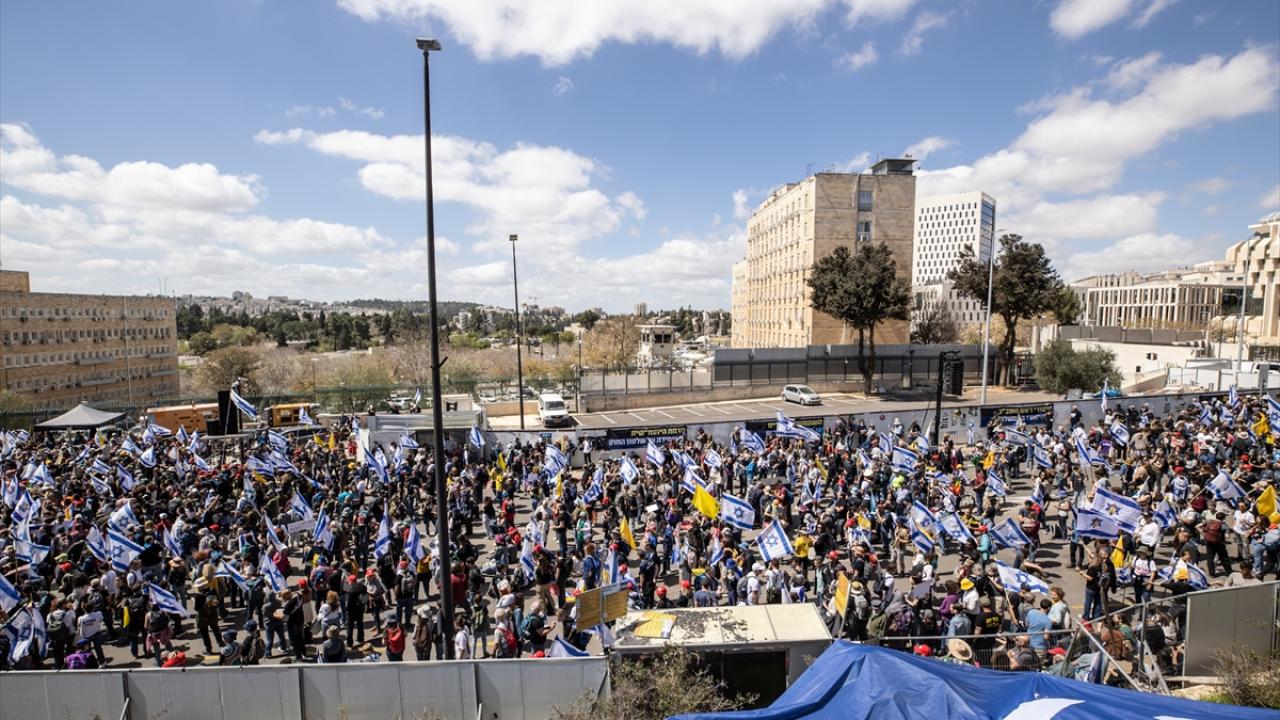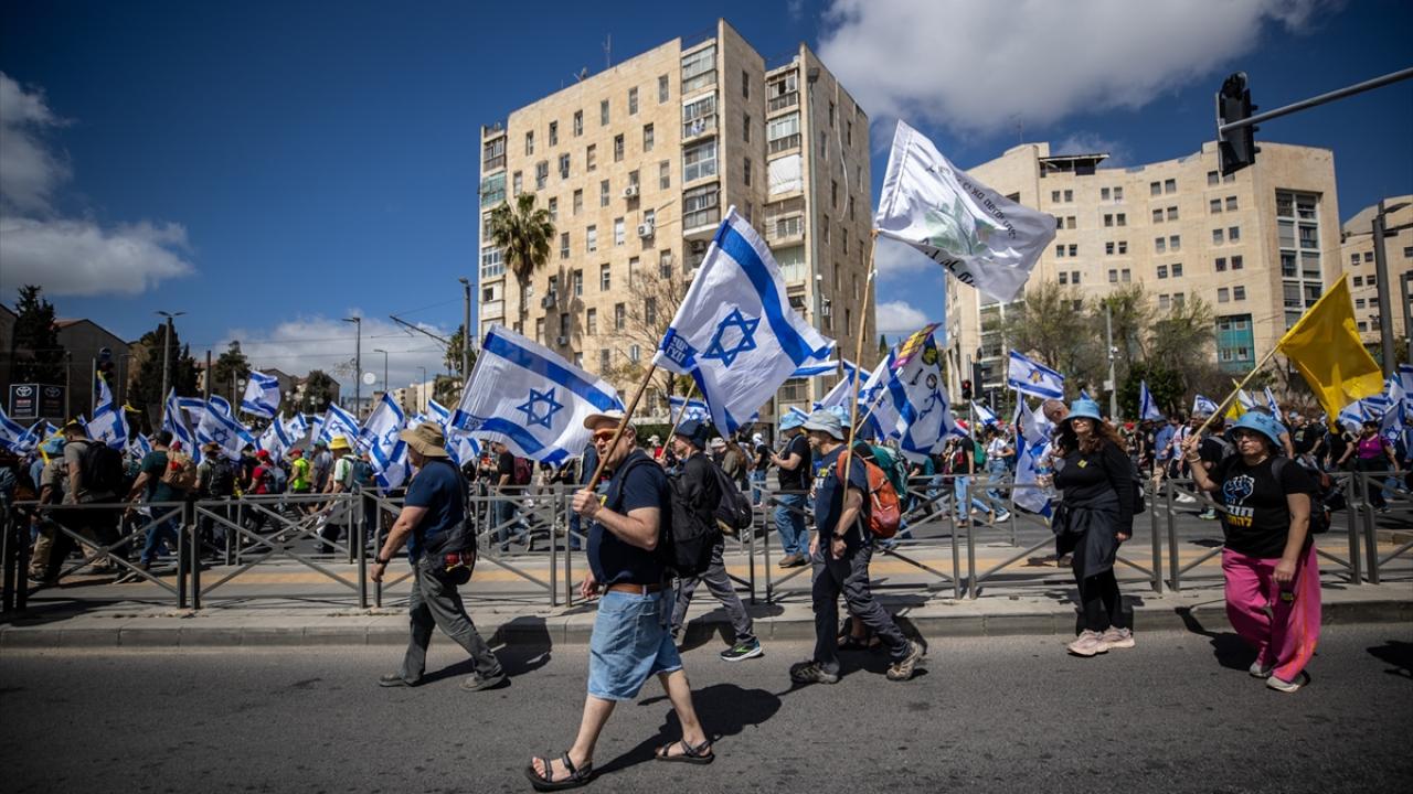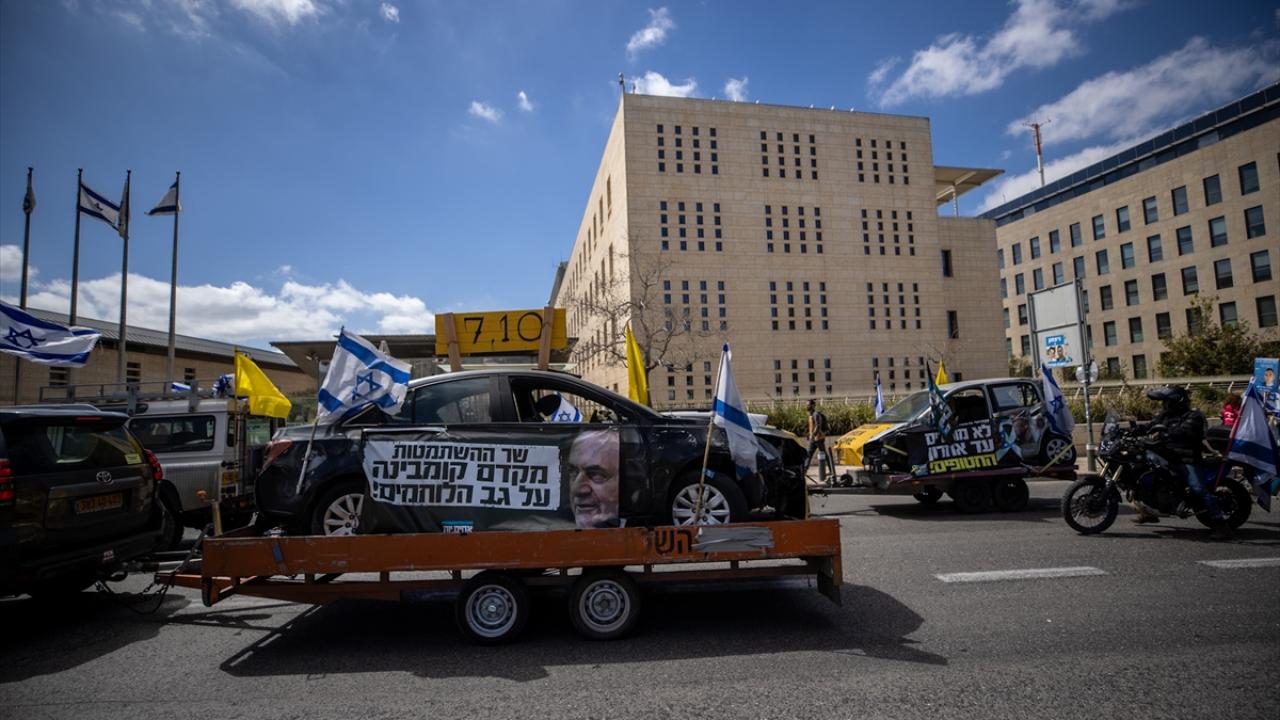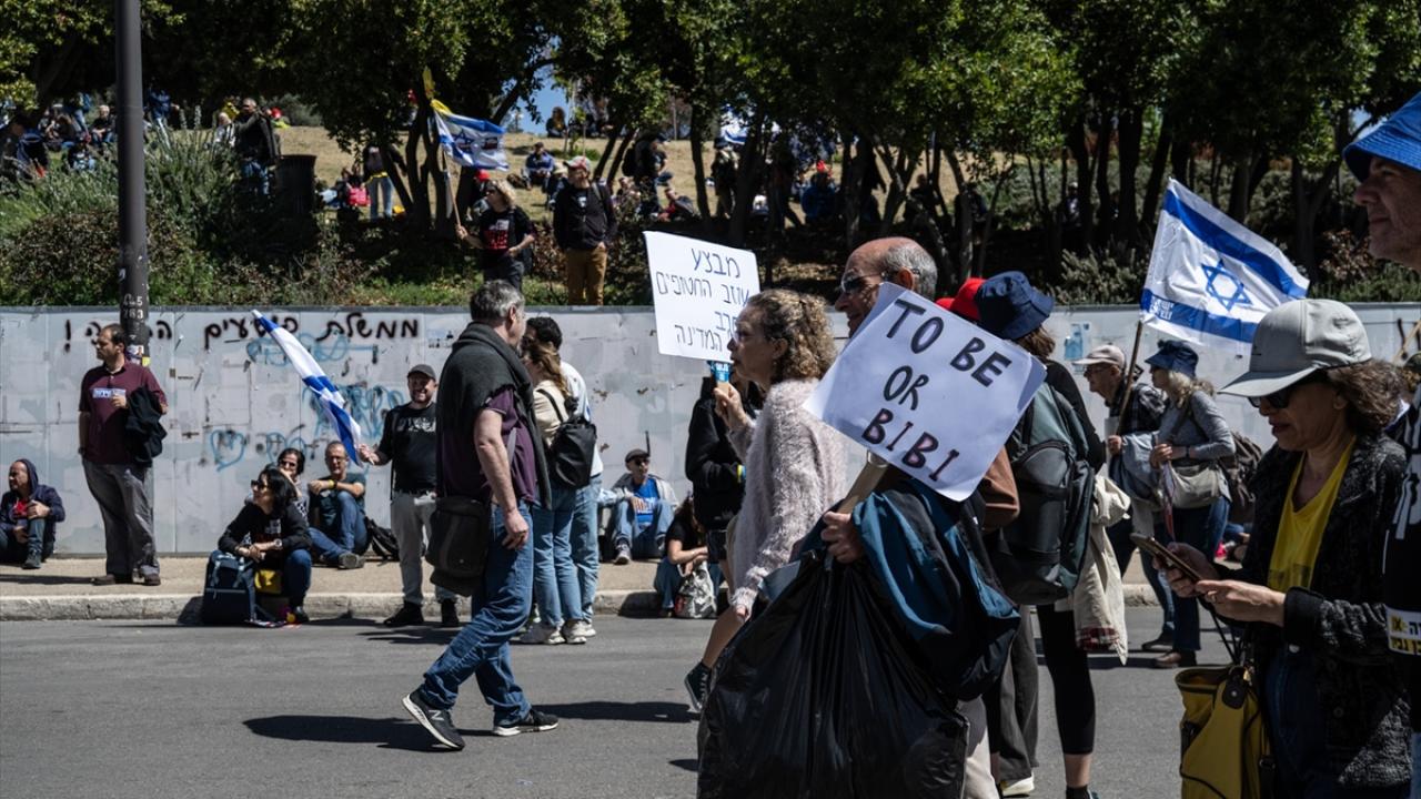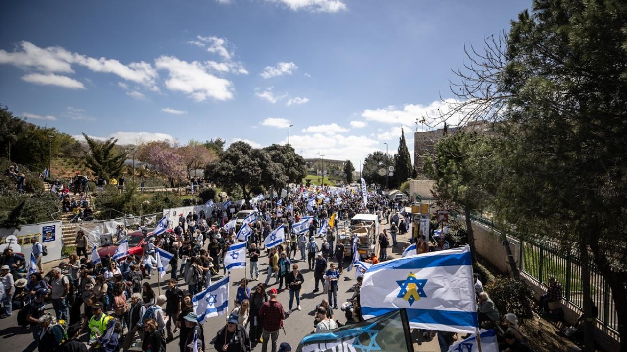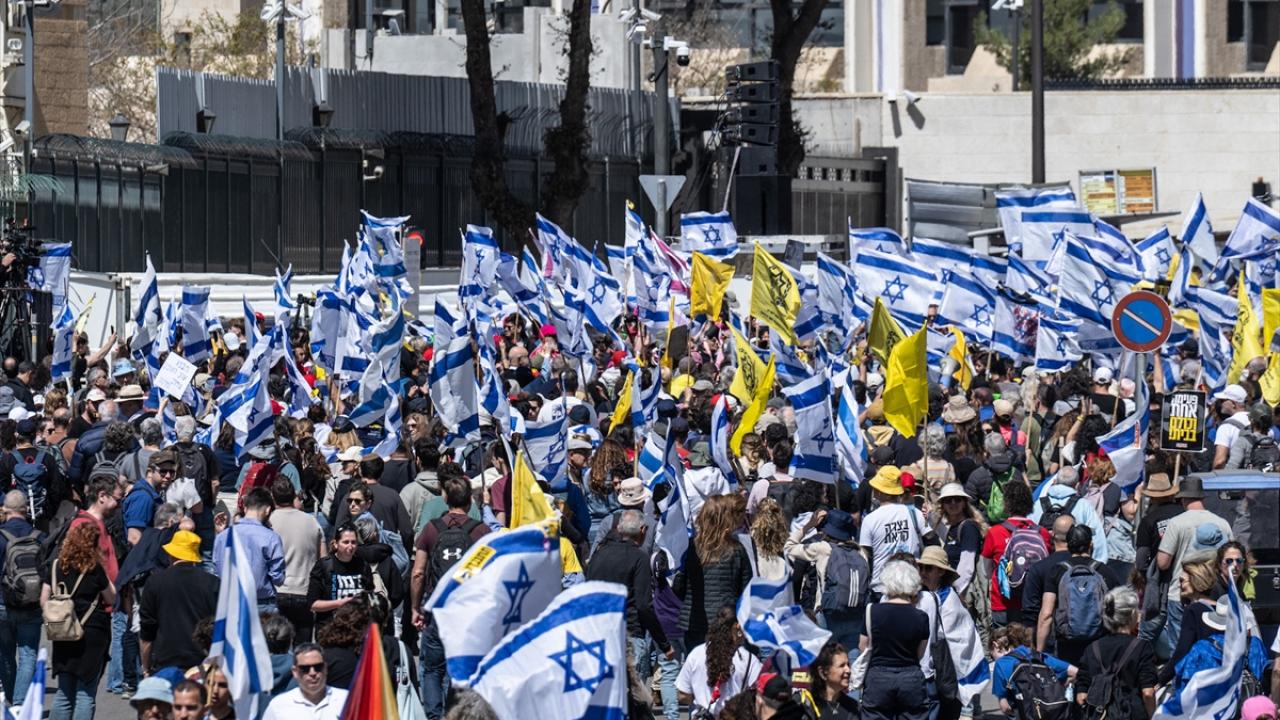 Ellerinde İsrail bayrakları ve hükümet karşıtı dövizler taşıyan göstericiler, İsrail parlamentosuna (Knesset) doğru yürüdü.