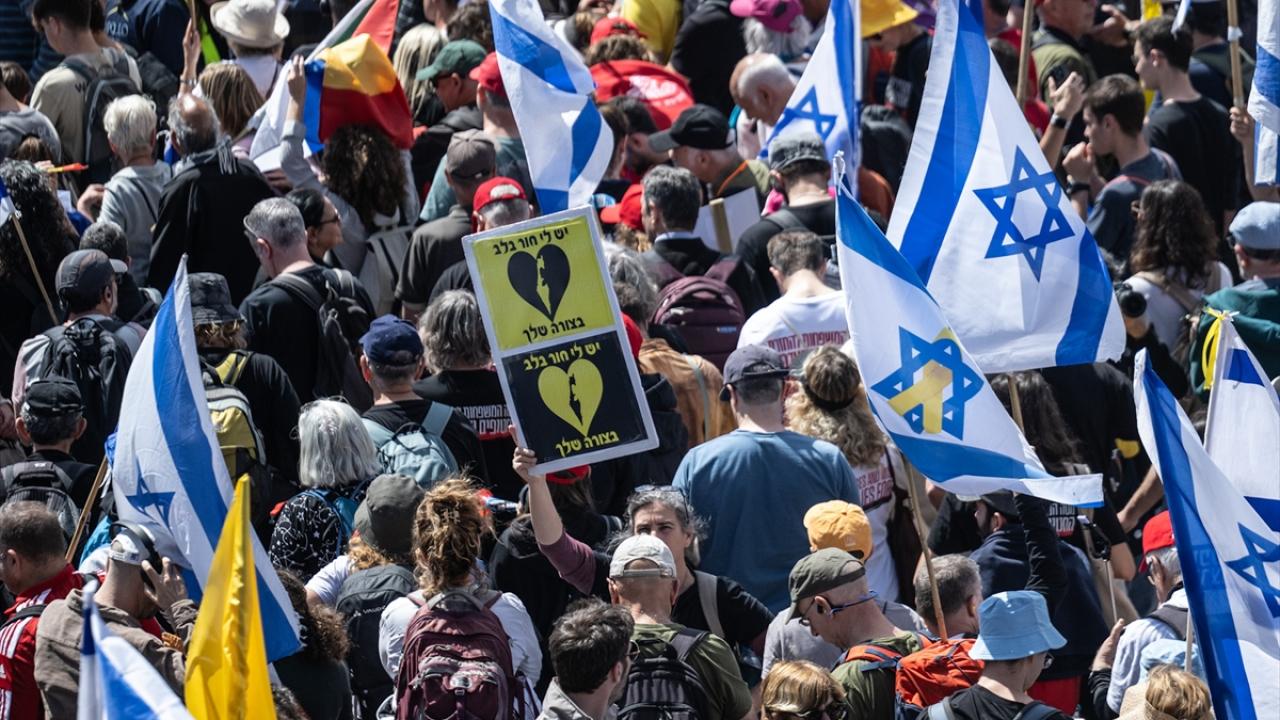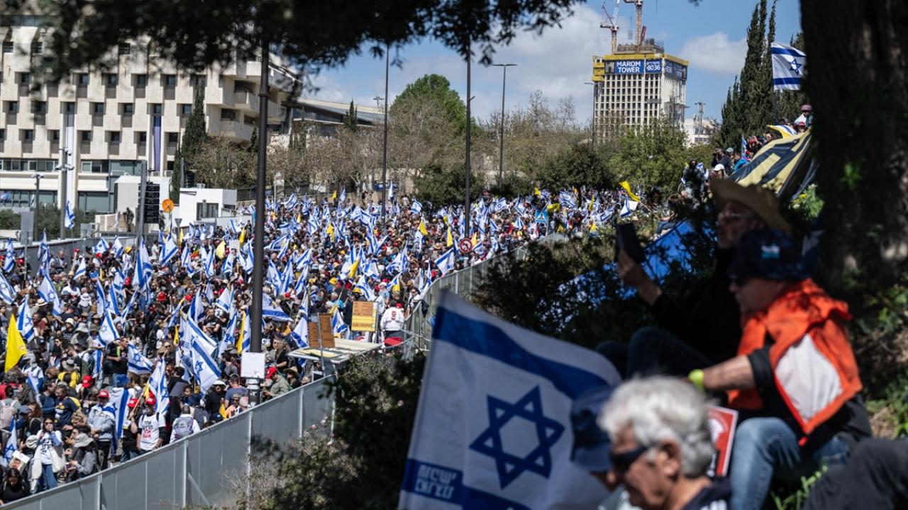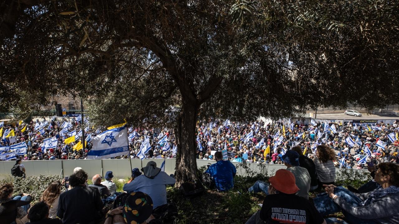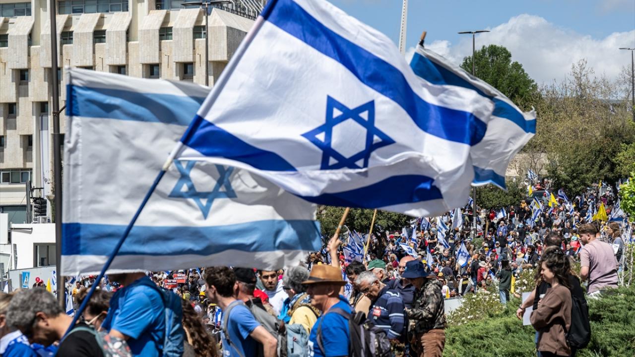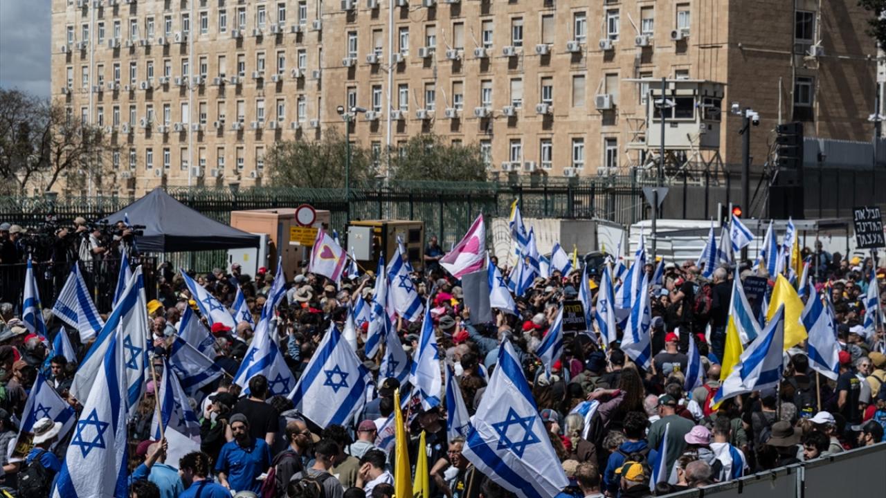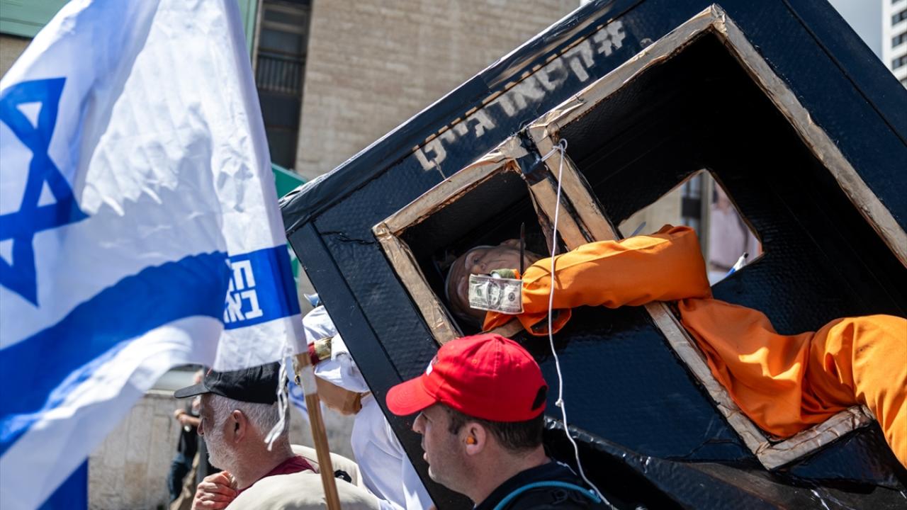 Ellerinde İsrail bayrakları ve hükümet karşıtı dövizler taşıyan göstericiler, İsrail parlamentosuna (Knesset) doğru yürüdü.
