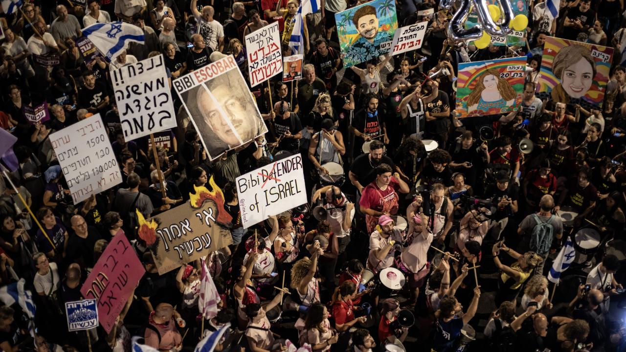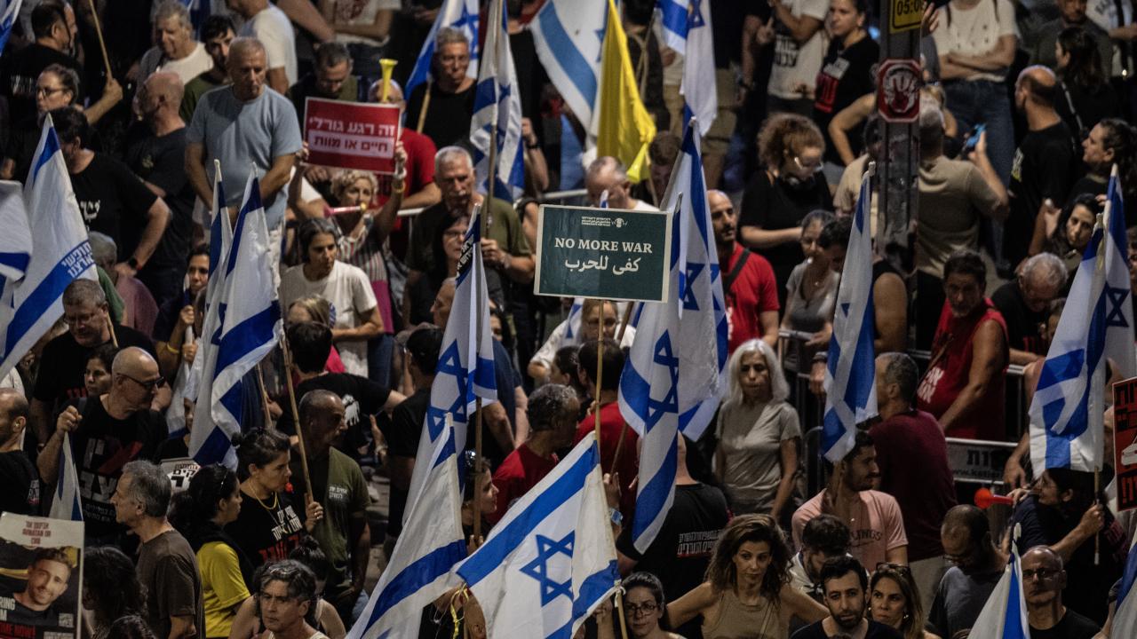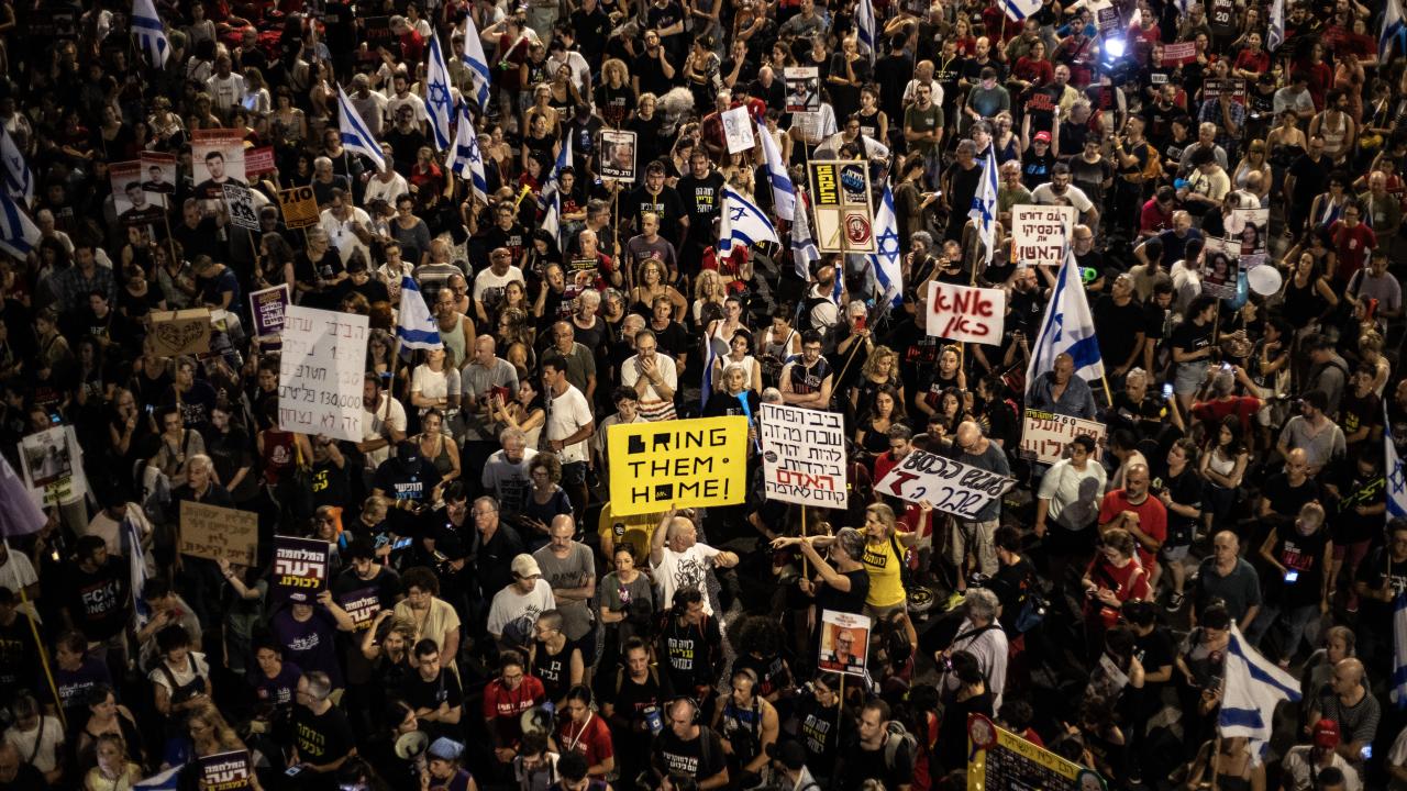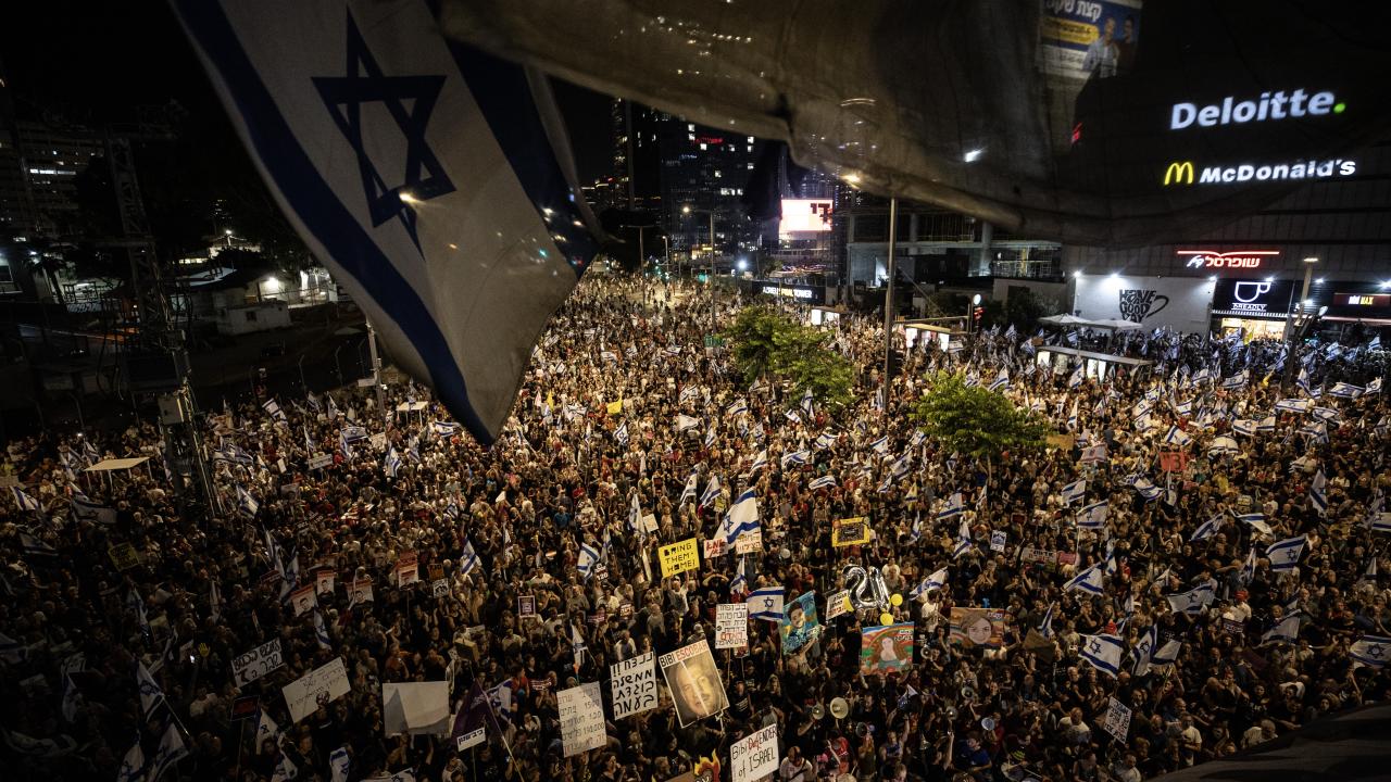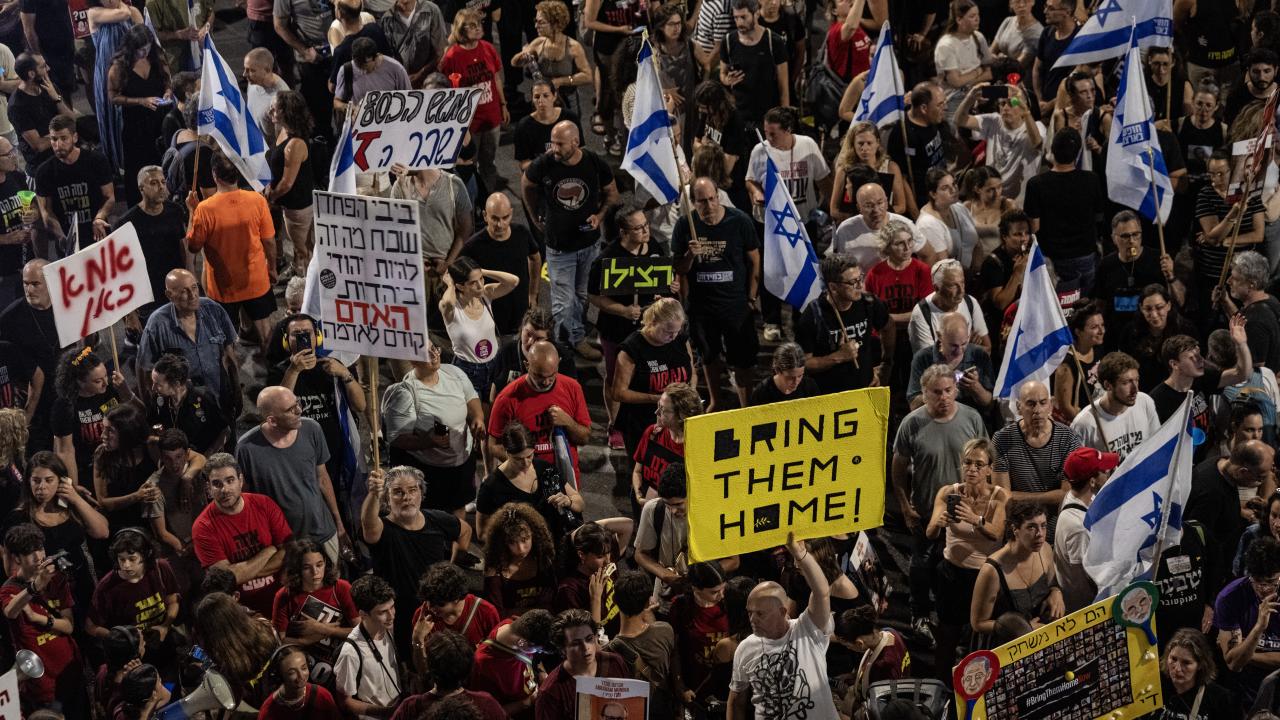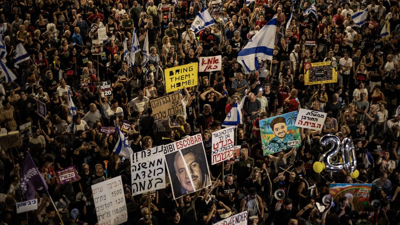 İsrailliler, Gazze Şeridi'ndeki İsrailli esirlerin geri getirilmesi ve Başbakan Binyamin Netanyahu hükümetinin istifası talebiyle ülke genelinde bu cumartesi de gösteriler düzenledi. Tel Aviv'deki Savunma Bakanlığı önünde toplanan binlerce gösterici, ellerinde İsrail bayrakları ve Netanyahu ve hükümetindeki siyasetçiler aleyhinde pankart, afiş ve dövizler taşıdı.
