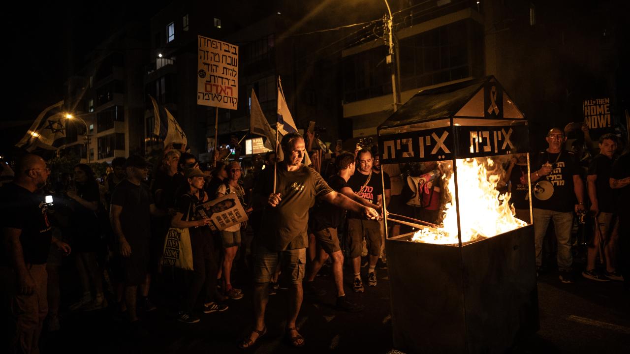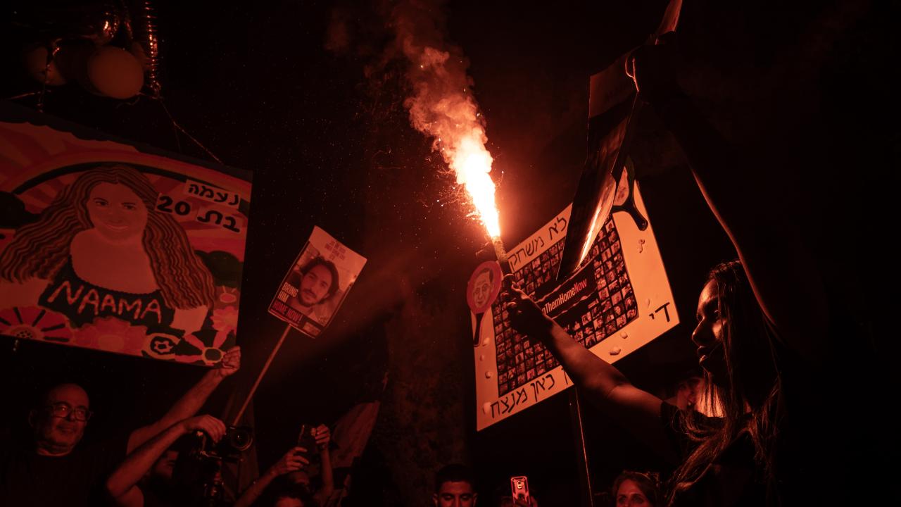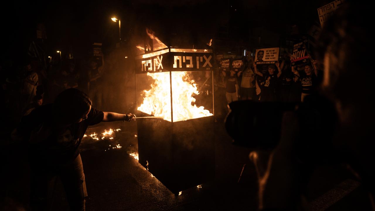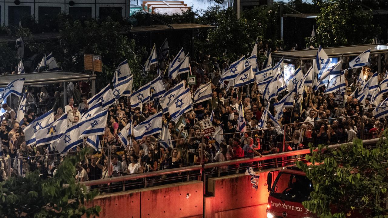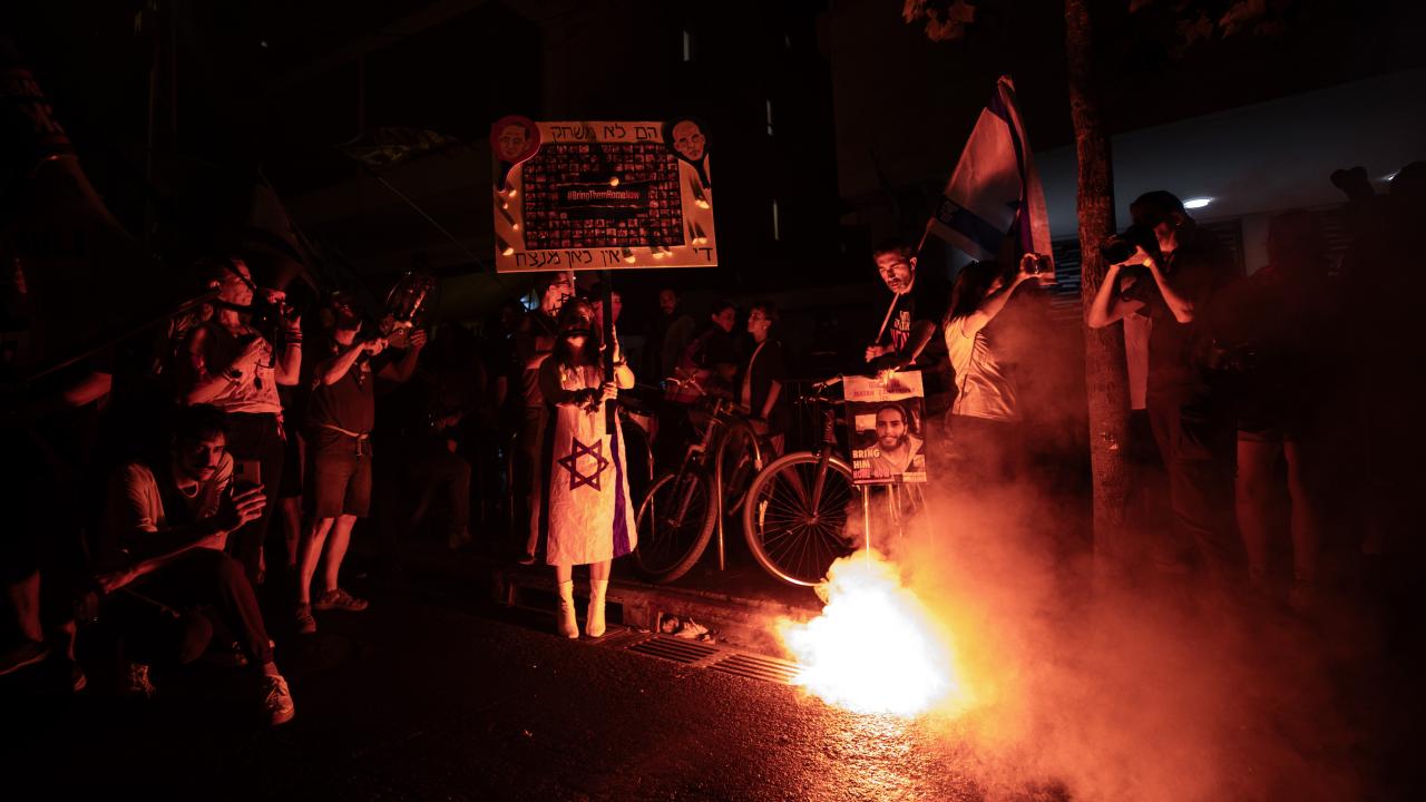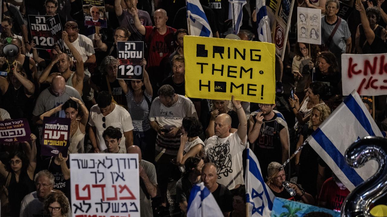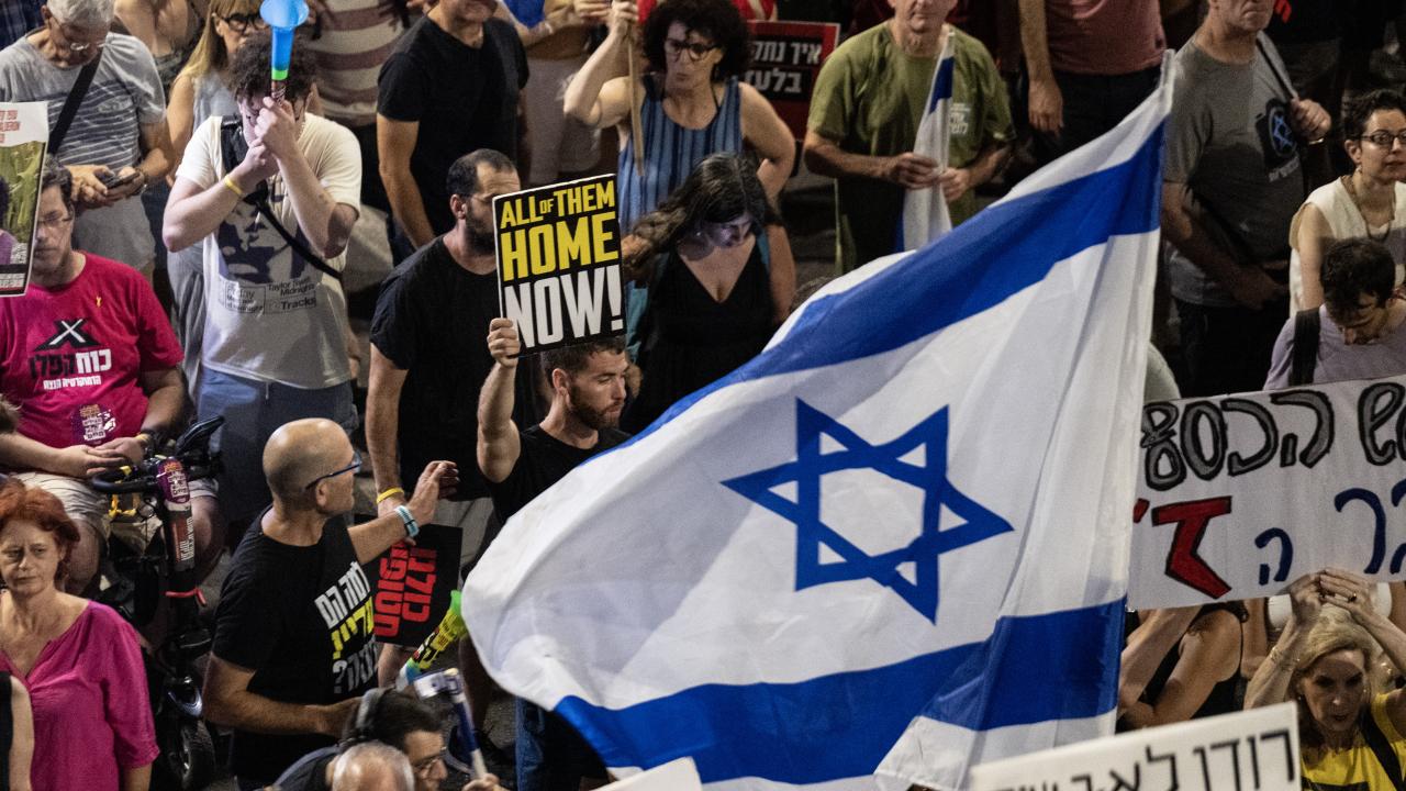 İsrailliler, Gazze Şeridi'ndeki İsrailli esirlerin geri getirilmesi ve Başbakan Binyamin Netanyahu hükümetinin istifası talebiyle ülke genelinde bu cumartesi de gösteriler düzenledi. Tel Aviv'deki Savunma Bakanlığı önünde toplanan binlerce gösterici, ellerinde İsrail bayrakları ve Netanyahu ve hükümetindeki siyasetçiler aleyhinde pankart, afiş ve dövizler taşıdı.