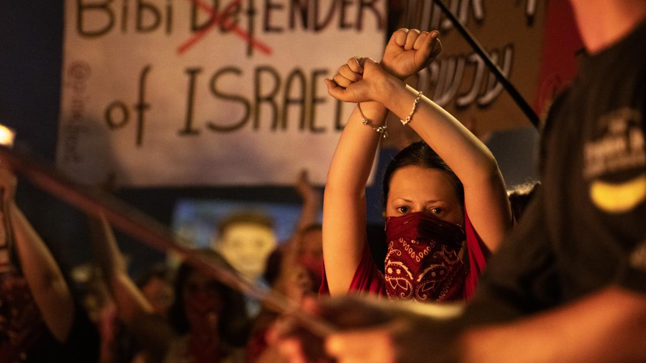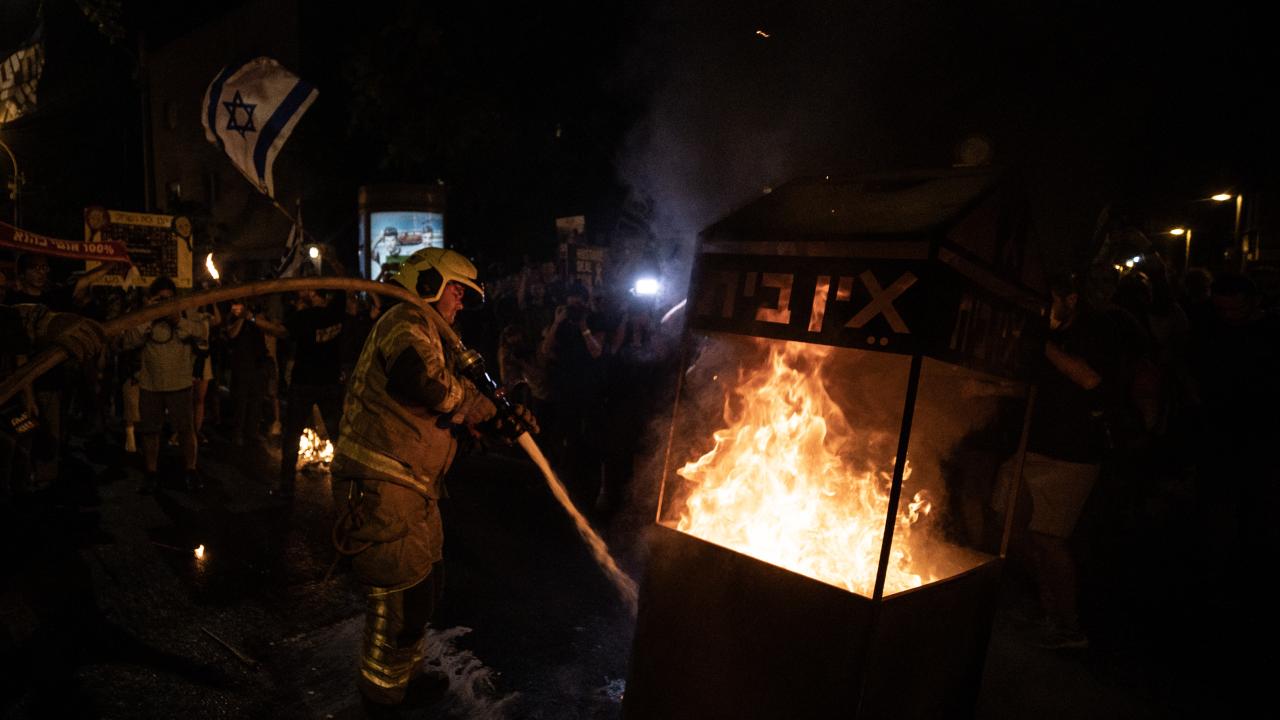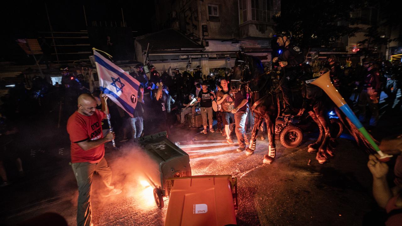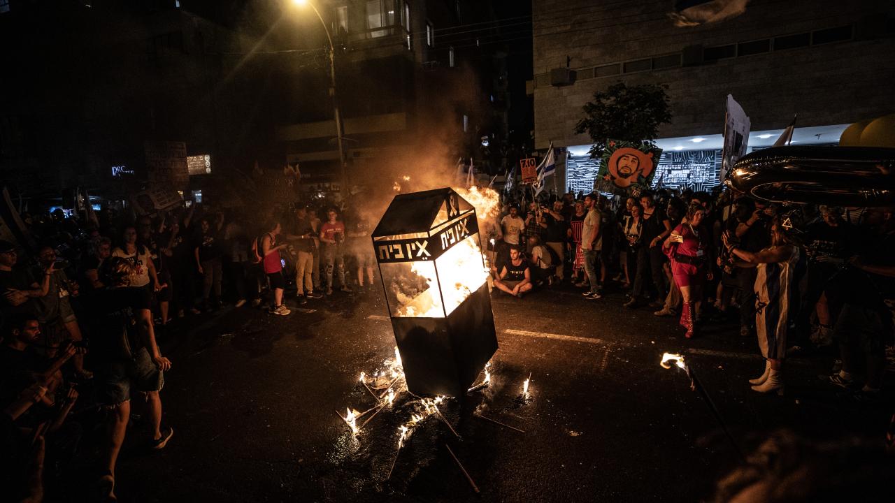 İsrail bayrakları ile Başbakan Netanyahu ve hükümetindeki siyasetçiler aleyhinde pankart, afiş ve dövizler taşıyan protestocular, erken seçim çağrısı yaptı ve alanda büyük bir ateş yaktı.