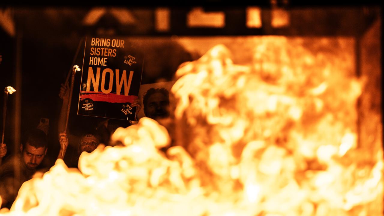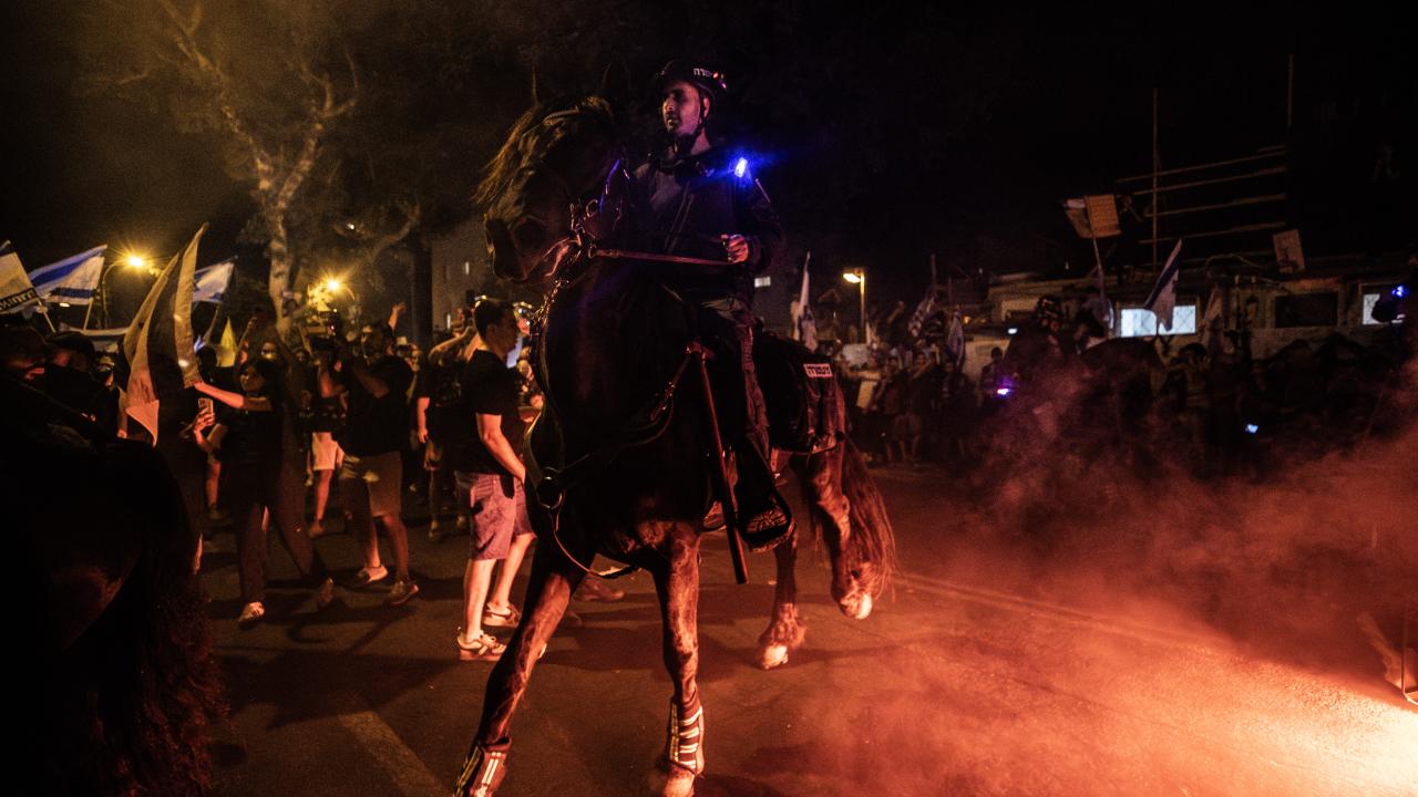 Buradaki sembolik öneme sahip tarihi Metzudat Zeev binası yakınlarında toplanan göstericiler, Netanyahu hükümetini protesto etti, Gazze Şeridi’ndeki İsrailli esirlerin geri getirilmesini istedi.