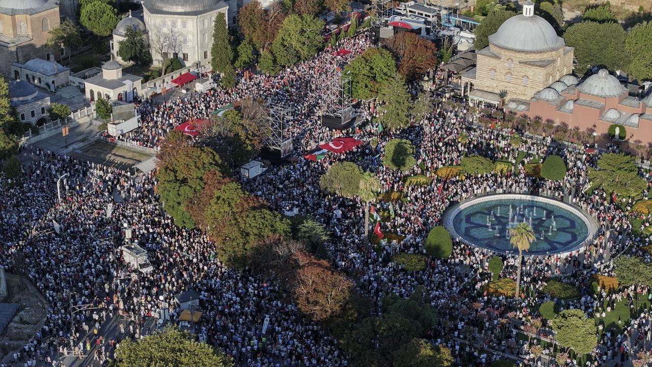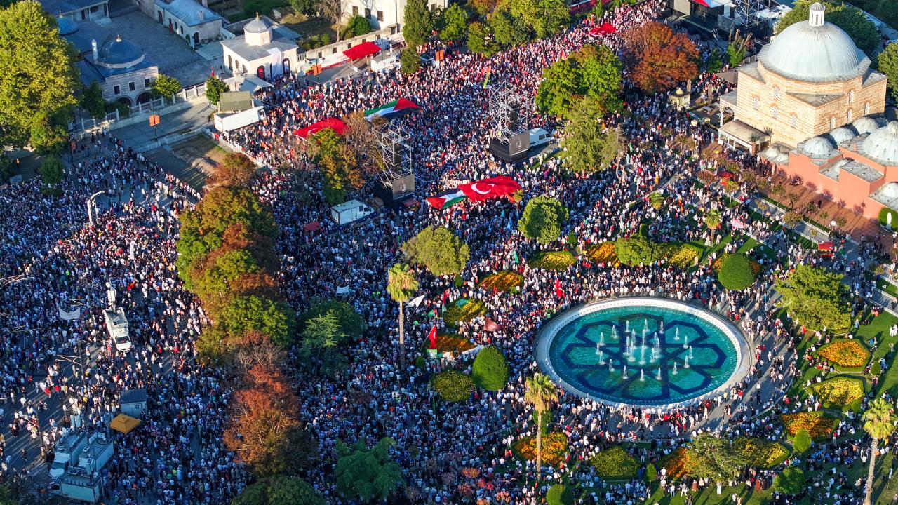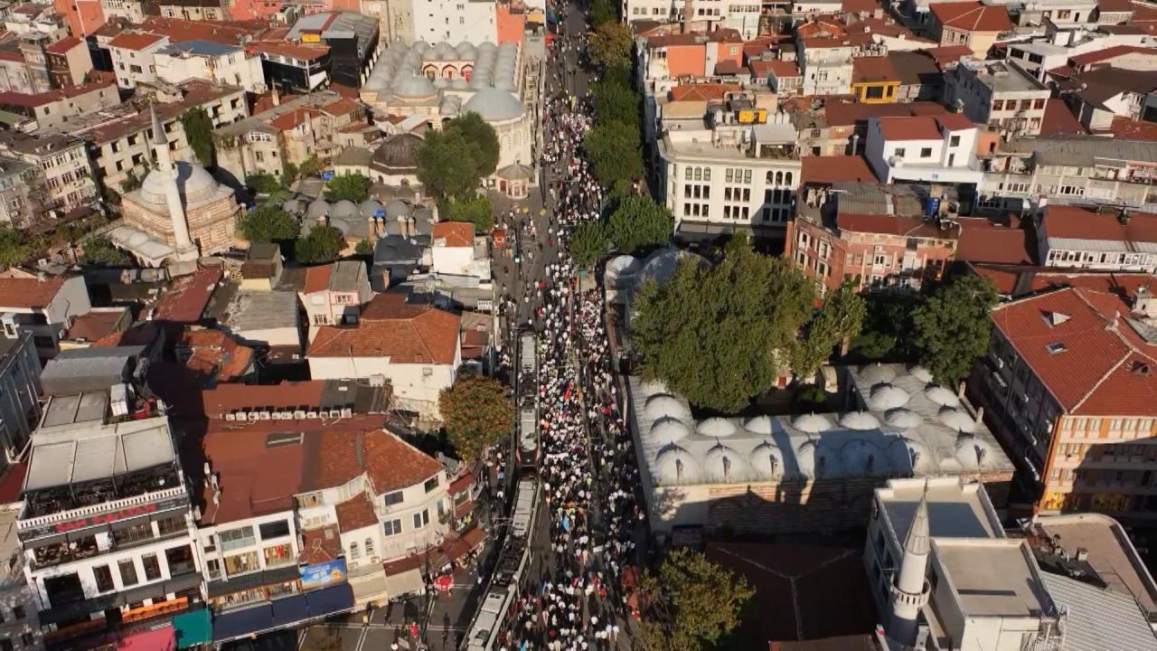 İsrail`e tepki göstermek ve Gazze`ye destek vermek için Filistin`e Destek Platformu öncülüğünde Ayasofya Meydanı`nda bir araya gelen kalabalık, tarihi yarımadanın farklı noktalarından alana ulaştı.