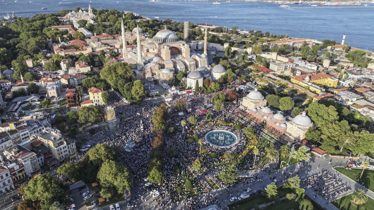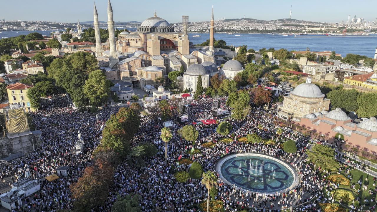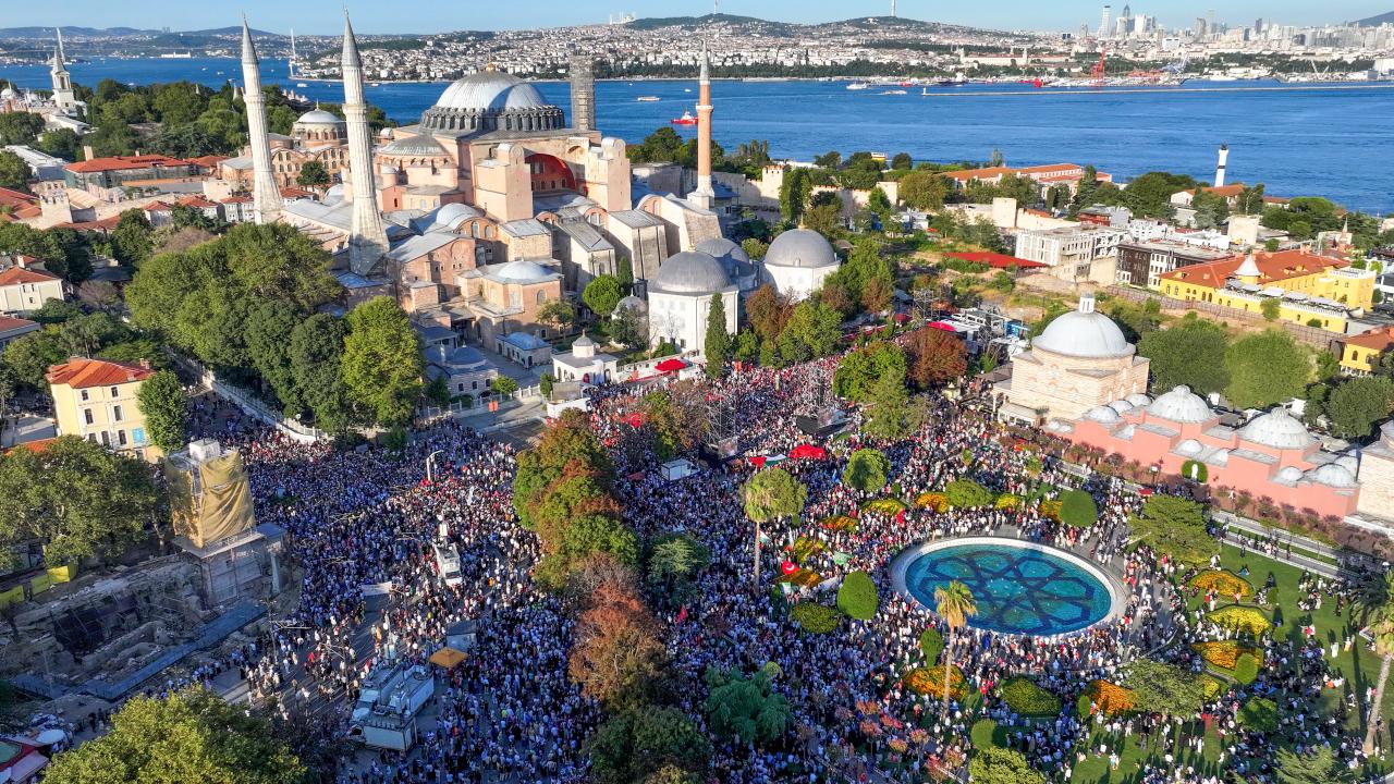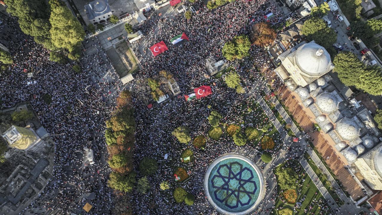 İsrail`e tepki göstermek ve Gazze`ye destek vermek için Filistin`e Destek Platformu öncülüğünde Ayasofya Meydanı`nda bir araya gelen kalabalık, tarihi yarımadanın farklı noktalarından alana ulaştı.