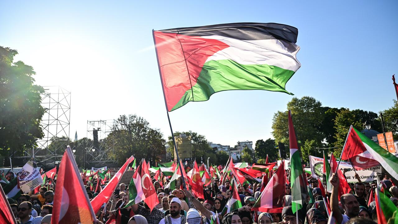 Vatandaşlar Türk ve Filistin bayrakları ile Kelime-i Tevhid flaması ve kefiye taşıdı, Filistin`in özgürlüğü için sloganlar attı.