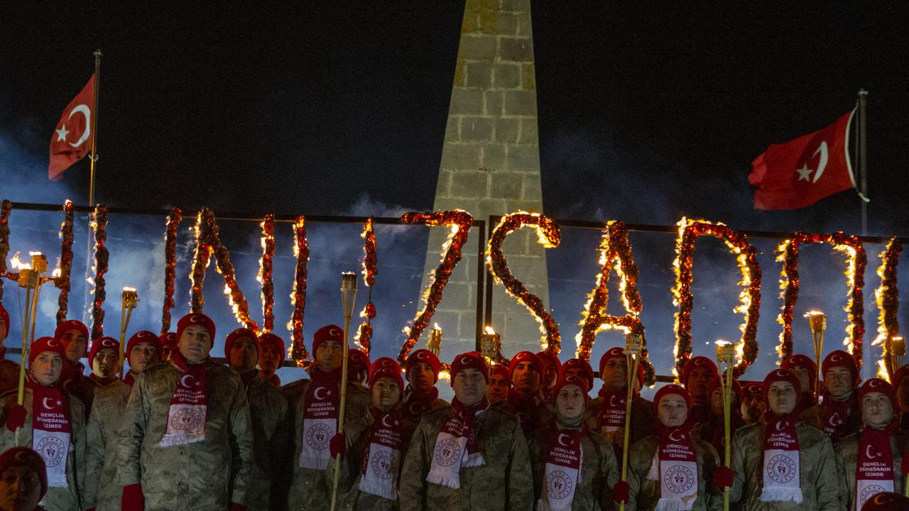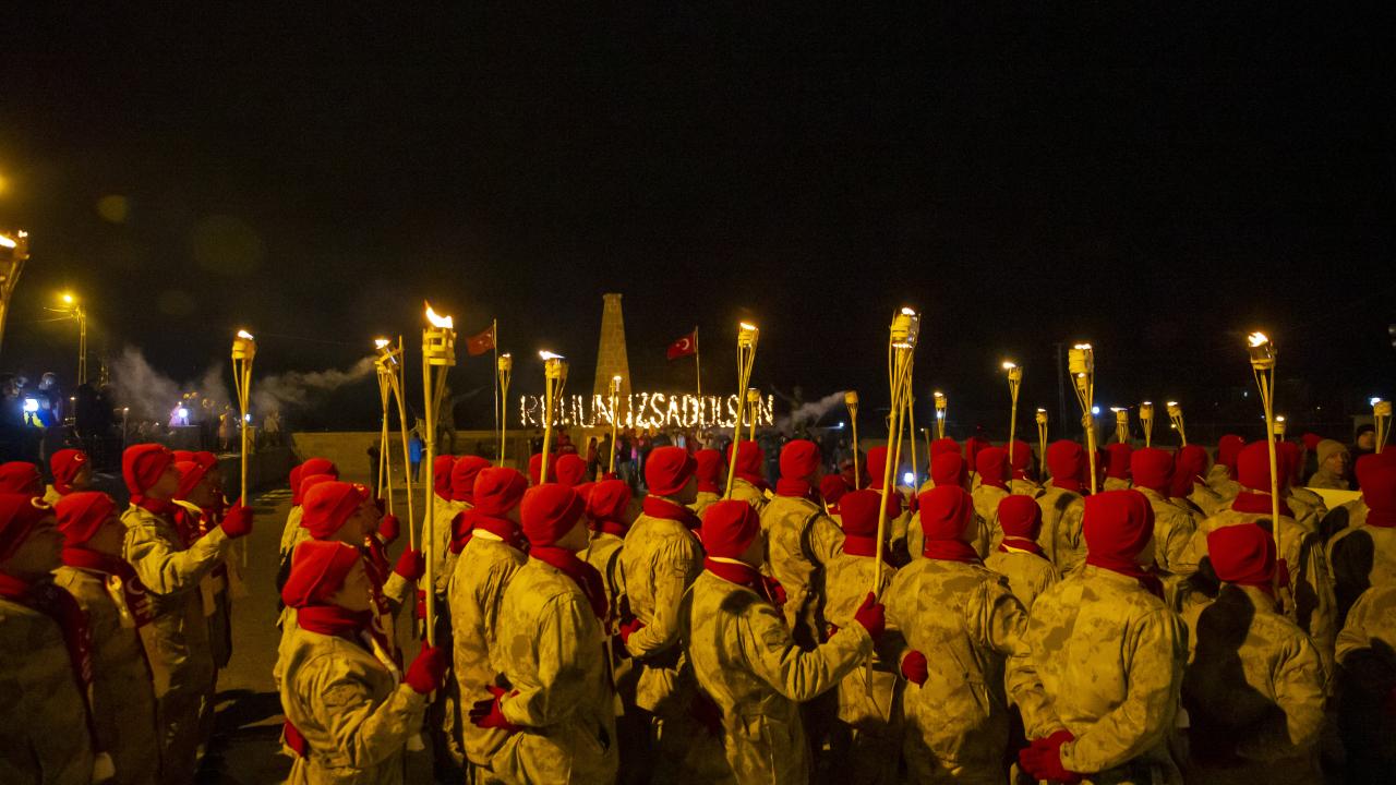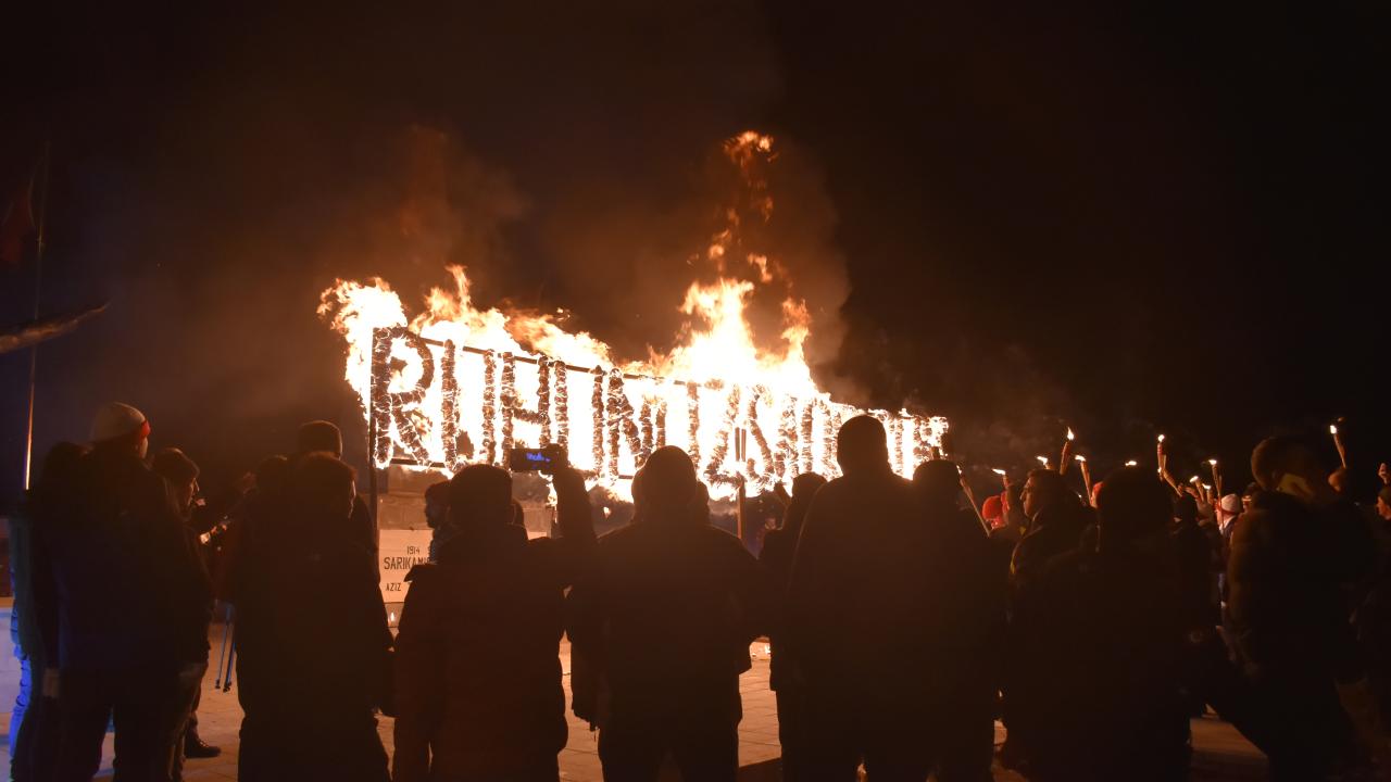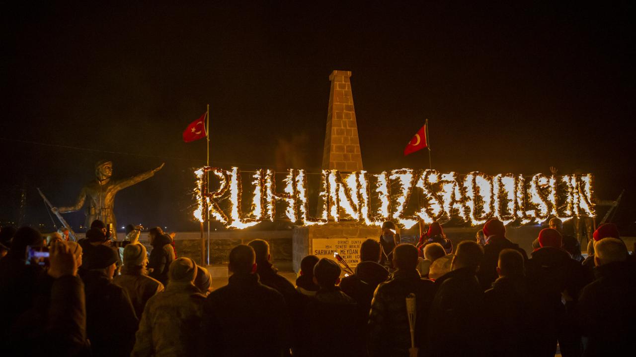 Kars'ın Sarıkamış ilçesinde, Sarıkamış Harekatı'nın 108. yılı etkinlikleri kapsamında binlerce kişi, ellerinde Türk bayrakları ile kar altında meşaleli yürüyüş gerçekleştirdi.