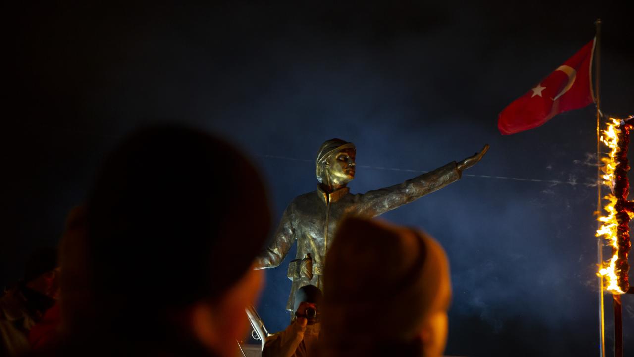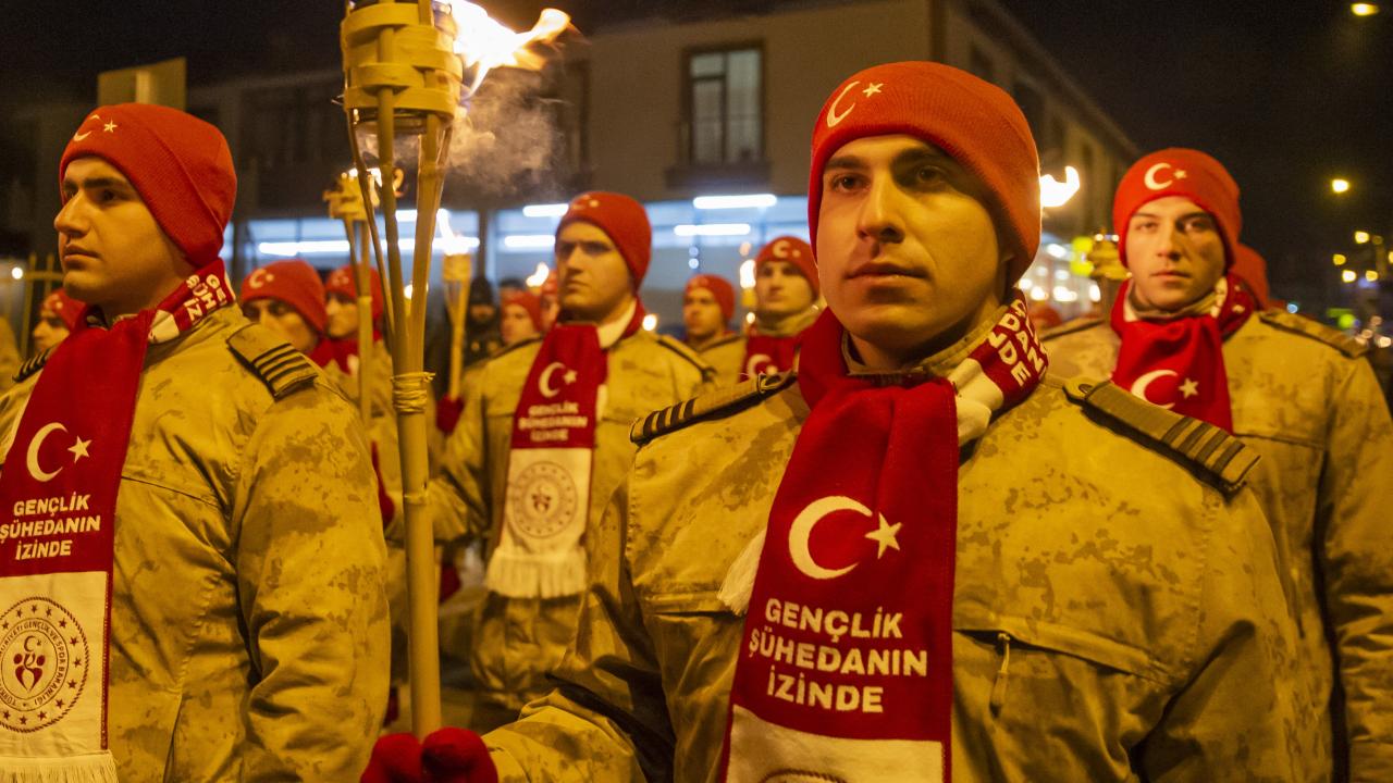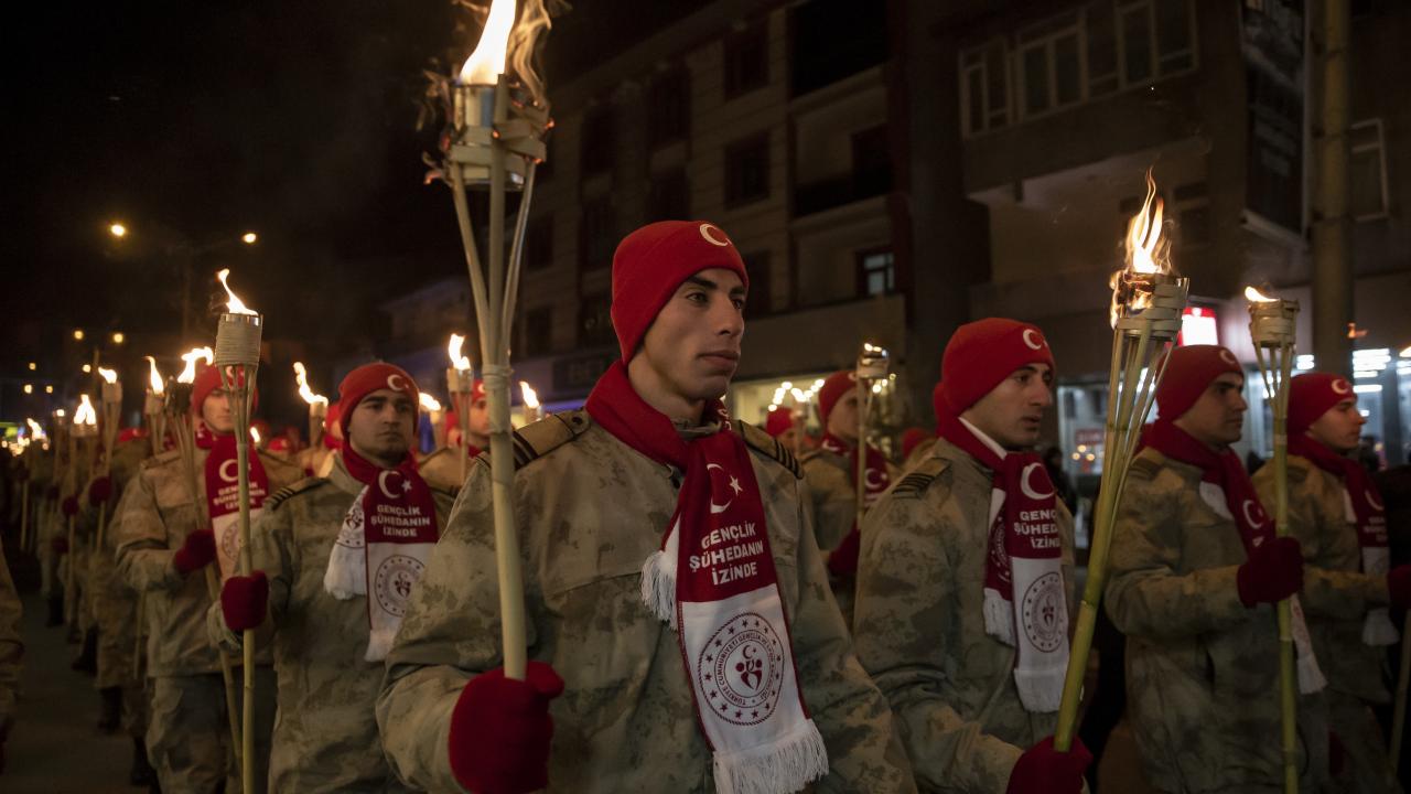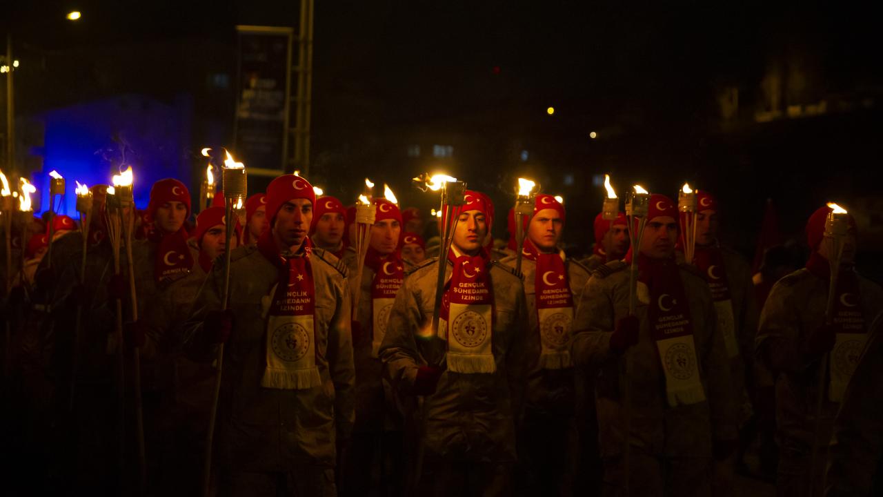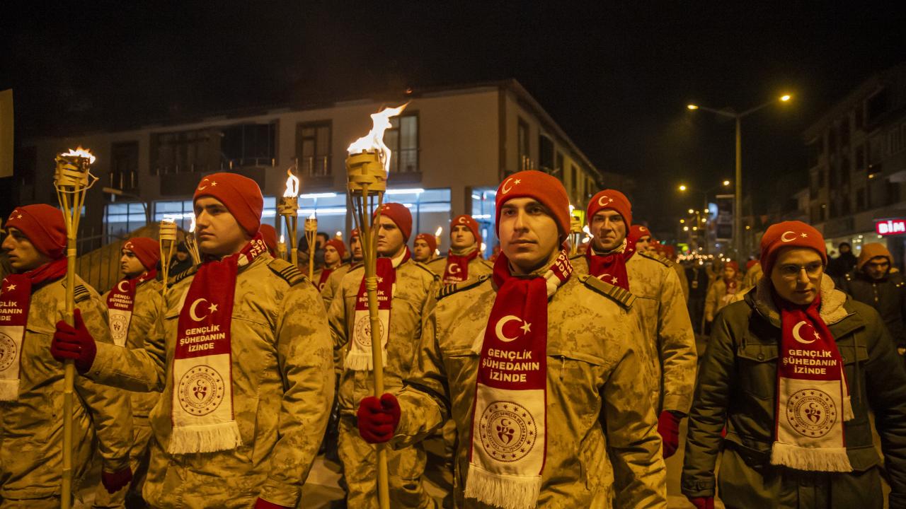 Kars'ın Sarıkamış ilçesinde, Sarıkamış Harekatı'nın 108. yılı etkinlikleri kapsamında binlerce kişi, ellerinde Türk bayrakları ile kar altında meşaleli yürüyüş gerçekleştirdi.