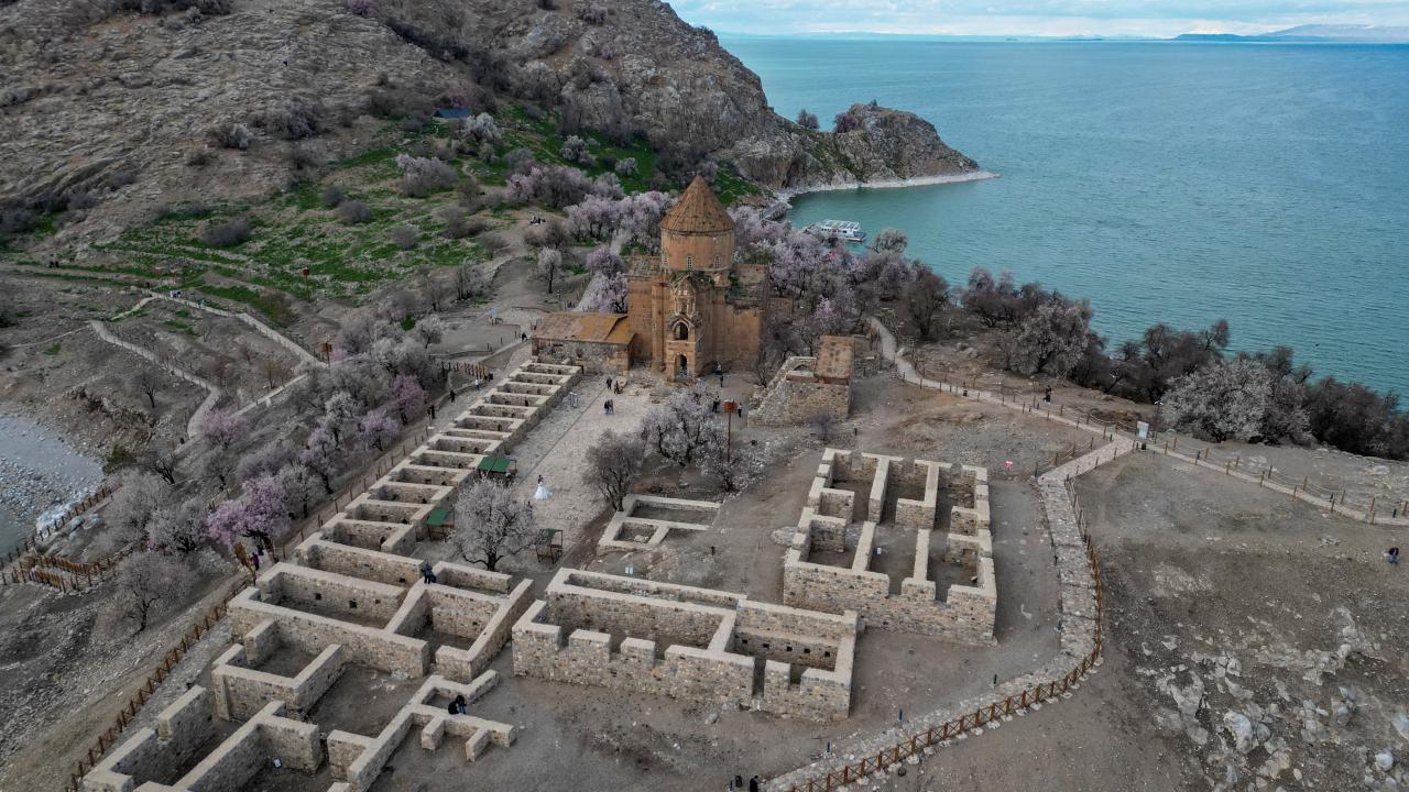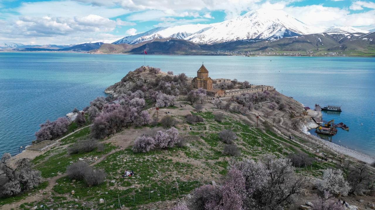 Yılın her döneminde farklı manzarasıyla insanları cezbeden Akdamar Adası, bugünlerde de Van Gölü`nün ve gökyüzünün maviliği ve çiçek açan badem ağaçlarıyla ziyaretçilerini ağırlıyor.